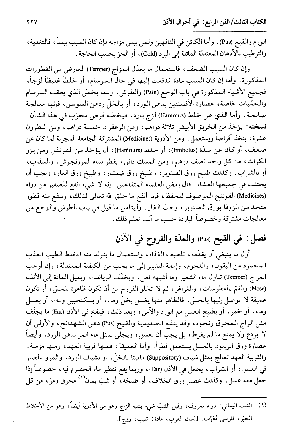 الورم والقيح. وَأما الْكَائِن فِي الناهقين وَلمن يبس مزاجه فَإِن كَانَ السَّبَب يبساً فالتغذية والترطيب بالأدهان المعتدلة المائلة إِلَى الْبرد أَو الْحر بِحَسب الْحَاجة. وَإِن كَانَ السَّبَب الضعْف فاستعمال مَا يعدل المزاج الْعَارِض من القطورات الْمَذْكُورَة. وَأما إِن كَانَ السَّبَب مَادَّة اندفعت إِلَيْهَا فِي حَال السرسام أَو خلطاً لزجاً فَجَمِيع الْأَشْيَاء الْمَذْكُورَة فِي بَاب الوجع والطرش وَمِمَّا يخص الَّذِي يعقب السرسام والحميات خَاصَّة عصارة الأفسنتين بدهن الْورْد أَو بالخل ودهن السوسن فَإِنَّهَا معالجة صَالِحَة أما الَّذِي عَن خلط لزج بَارِد فيخصه قرص مجرب فِي هَذَا الشَّأْن نسخته: يُؤْخَذ من الخربق الْأَبْيَض ثَلَاثَة دَرَاهِم وَمن الزَّعْفَرَان خَمْسَة دَرَاهِم وَمن النطرون عشرَة يتَّخذ أقراصاً وَيسْتَعْمل وَمن الْأَدْوِيَة الْمُشْتَركَة الجامعة المجربة لما كَانَ عَن ضعف أَو كَانَ عَن سدة أَو خلط أَن يُؤْخَذ من القرنفل وَمن بزر الكراث من كل وَاحِد نصف دِرْهَم وَمن الْمسك دانق يقطر بِمَاء المرزنجوش والسذاب أَو بِالشرابِ وَكَذَلِكَ طبيخ ورق الصنوبر وطبيخ ورق شمشار وطبيخ ورق الْغَار وَيجب أَن يجْتَنب فِي جَمِيعهَا الْعشَاء. قَالَ بعض الْعلمَاء الْمُتَقَدِّمين: أَنه لَا شَيْء أَنْفَع للصفير من دَوَاء الفوتنج الْمَوْصُوف للْحِفْظ فَإِنَّهُ أَنْفَع مَا خلق الله تَعَالَى لذَلِك وينفع مِنْهُ قطور متخذ من الزوفا بورق الصنوبر وحبّ الْغَار. وليتأمل مَا قيل فِي بَاب الطرش والوجع من معالجات مُشْتَركَة وخصوصاً الْبَارِدَة حسب مَا أَنْت تعلم ذَلِك. فصل فِي الْقَيْح والمدة والقروح فِي الْأذن أول مَا يَنْبَغِي أَن يقدّمه تلطيف الْغذَاء وَاسْتِعْمَال مَا يتَوَلَّد مِنْهُ الْخَلْط الطّيب العذب الْمَحْمُود من الْبُقُول واللحوم وإمالة التَّدْبِير إِلَى مَا يجب من الْكَيْفِيَّة المعتدلة وَإِن أوجب المزاج تنَاول مَاء الشّعير وَمَا أشبهه فعل ويخفّف الرياضة ويميل الْمَادَّة إِلَى الْأنف والفم بالعطوسات والغراغر ثمَّ لَا تَخْلُو القروح من أَن تكون ظَاهِرَة للحس أَو تكون عميقة لَا يُوصل إِلَيْهَا بالحس فَالظَّاهِر مِنْهَا يغسل بخل مَاء أَو بسكنجبين وَمَاء أَو بِعَسَل وَمَاء أَو خمر أَو بطبيخ الْعَسَل مَعَ الْورْد والآس وَبعد ذَلِك فينفخ فِي الْأذن مَا يجفّف مثل الزاج المحرق وَنَحْوه وَقد ينفع الصديدية والقيح دهن الشهدانج وَالْأولَى أَن لَا يردع وَلَا يمْنَع مَا لم يفرط بل يجب أَن يغسل ويجلى بِمثل مَاء المر بدهن الْورْد وَأَيْضًا عصارة ورق الزَّيْتُون بالعسل يسْتَعْمل قطراً. وَأما العميقة فَمِنْهَا قريبَة الْعَهْد وَمِنْهَا مزمنة. والقريبة الْعَهْد تعالج بِمثل شياف ماميثا بالخل أَو بشياف الْورْد والمرو بِالصبرِ فِي الْعَسَل أَو الشَّرَاب يَجْعَل فِي الْأذن وَرُبمَا يَقع تقطير مَاء الحصرم فِيهِ خُصُوصا إِذا جعل مَعَه عسل وَكَذَلِكَ عصير ورق الْخلاف أَو طبيخه أَو شب يمَان محرق وَمر من كل