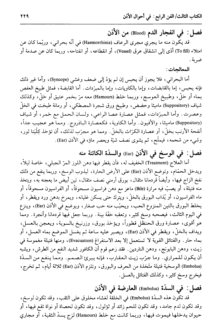فصل فِي انفجار الدَّم من الْأذن قد يكون مِنْهُ مَا يجْرِي مجْرى الرعاف فِي أَنه بحراني وَرُبمَا كَانَ عَن امتلاء أدّى إِلَى انْشِقَاق عرق أَو انْقِطَاعه أَو انفتاحه وَرُبمَا كَانَ عَن صدمة أَو ضَرْبَة. المعالجات: أما البحراني فَلَا يجوز أَن يحبس إِن لم يؤدّ إِلَى ضعف وَغشيَ وَأما غير ذَلِك فَإِنَّهُ يحبس أما بالقابضات وَأما بالكاويات وَأما بالمبرّدات. أما القابضة فَمثل طبيخ العفص بِمَاء أَو خل وطبيخ العوسج وَرُبمَا خلط مَعَه مرّ بِخَمْر عَتيق أَو خلّ وَكَذَلِكَ شياف ماميثا وحضض وطبيخ ورق شَجَرَة المصطكي أَو رمانة طبخت فِي الْخلّ وعصرت. وَأما المبرّدات فَمثل عصارة عَصا الرَّاعِي ولسان الْحمل مَعَ خمر أَو شياف ماميثا والأفيون. وَأما الكاوية فكعصارة الباذروج. وَمِمَّا هُوَ عَجِيب جدا أنفحة الأرنب بخل أَو عصارة الكرّاث بالخل. وَمِمَّا هُوَ مجرّب لذَلِك أَن تُؤْخَذ كِلْيَتا ثَوْر وَشَيْء من شحمه فيملّح ثمَّ يشوى نصف شية ويعصر مَاؤُهُ فِي الْأذن. فصل فِي الْوَسخ فِي الْأذن والسدّة الكائنة مِنْهُ أما العلاج الْخَفِيف لَهُ فَأن يقطر فِيهَا دهن اللوز المرّ الْجبلي خَاصَّة لَيْلًا وَيدخل الحمّام وَيُوضَع الْأذن على الأَرْض الحارة ليذوب الْوَسخ وَرُبمَا ينفع من ذَلِك نفخ الزاج فِيهَا وَأَيْضًا قردمانا مِثْقَال بورق أرمني نصف مِثْقَال تين أَبيض مَا يعجنه بِهِ ويتخذ مِنْهُ فَتِيلَة أَو يصبّ فِيهِ مرَارَة مَاعِز مَعَ دهن فراسيون مسحوقاً أَو الفراسيون مسحوقاً أَو مَاء الفراسيون أَو يُذاب البورق بالخلّ وَيتْرك حَتَّى يسكن غليانه ويمرخ بدهن ورد ويقطر أَو يخلط البورق بِالتِّينِ المنزوع الْحبّ ويحبّب مِنْهُ حب صغَار وَيُوضَع فِي الْأذن وَينْزع فِي الْيَوْم الثَّالِث فيصحبه وسخ كثير ويعقبه خفَّة بَيِّنَة. وَرُبمَا جعل فِيهَا قردمانا وأنجرة. وَمِمَّا هُوَ أقوى عصارة ورق الحنظل قطوراً وَيُؤْخَذ بورق وزرنيخ بِالسَّوِيَّةِ ويعجن بالعسل ويداف بالخل ويقطر فِي الْأذن ويصبر عَلَيْهِ سَاعَة ثمَّ يغسل الْموضع بِمَاء الْعَسَل أَو بِمَاء حَار. والفتائل القوية لَا تسْتَعْمل إِلَّا بعد الاستفراغ وَمِنْهَا فَتِيلَة مغموسة فِي زَيْت ودهن البابونج ودهن الناردين. فقد زعم قوم أَن الكافور شَدِيد النَّفْع من الطرش وَيُشبه أَن يكون للمراري. وَمَا جرّب زَيْت العقارب فَإِنَّهُ يُبرئ الصمم. وَمِمَّا ينفع من السدّة الوسخية فَتِيلَة متّخذة من الْحَرْف والبورق وَتلْزم الْأذن ثَلَاثَة أَيَّام ثمَّ تخرج فَيخرج وسخ كثير وَكَذَلِكَ الفتائل بالعسل. فصل فِي السدة الْعَارِضَة فِي الْأذن قد تكون هَذِه السدّة فِي الْخلقَة لغشاء مَخْلُوق على الثقب وَقد تكون لوسخ وَقد تكون لدم جامد وَقد تكون للحم زَائِد أَو ثؤلول وَقد تكون لحصاة أَو نواة تقع فِيهَا أَو حَيَوَان يدخلهَا فَيَمُوت فِيهَا وَرُبمَا كَانَت مَعَ خلط لزج يسدّ الثقبة أَو مجاري