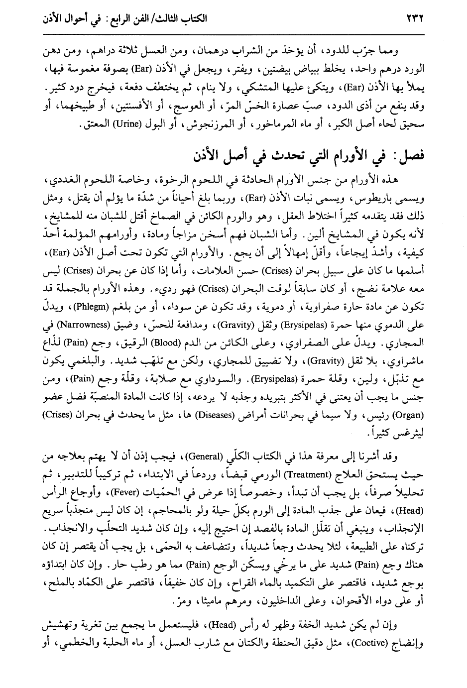 وَمِمَّا جرب للدود أَن يُؤْخَذ عَن الشَّرَاب دِرْهَمَانِ وَمن الْعَسَل ثَلَاثَة دَرَاهِم وَمن دهن الْورْد دِرْهَم وَاحِد يخلط ببياض بيضتين ويفتر وَيجْعَل فِي الْأذن بصوفة مغموسة فِيهَا يمْلَأ بهَا الْأذن ويتكئ عَلَيْهَا المتشكي وَلَا ينَام ثمَّ يختطف دفْعَة فَيخرج دود كثير. وَقد ينفع من أَذَى الدُّود صحت عصارة الخسّ المر أَو العوسج أَو الأفسنتين أَو طبيخهما أَو سحيق لحاء أصل الْكبر أَو مَاء المرماخور أَو المرزنجوش أَو الْبَوْل الْمُعْتق. هَذِه الأورام من جنس الأورام الْحَادِثَة فِي اللحوم الرخوة وخاصة اللحوم الغددي وَيُسمى باريطوس وَيُسمى نَبَات الْأذن وَرُبمَا بلغ أَحْيَانًا من شدَّة مَا يؤلم أَن يقتل وَمثل ذَلِك فقد يتقدمه كثيرا اخْتِلَاط الْعقل وَهُوَ والورم الْكَائِن فِي الصماخ أقتل للشبان مِنْهُ للمشايخ لِأَنَّهُ يكون فِي الْمَشَايِخ أَلين. وَأما الشبَّان فهم أسخن مزاجاً ومادة وأورامهم المؤلمة أحدّ كَيْفيَّة وَأَشد إيجاعاً وأقلّ إمهالاً إِلَى أَن يجع. والأورام الَّتِي تكون تَحت أصل الْأذن أسلمها مَا كَانَ على سَبِيل بحران حسن العلامات أما إِذا كَانَ عَن بحران لَيْسَ مَعَه عَلامَة نضج أَو كَانَ سباقاً لوقت البحران فَهُوَ رَدِيء. وَهَذِه الأورام بِالْجُمْلَةِ قد تكون عَن مَادَّة حارة صفراوية أَو دموية وَقد تكون عَن سَوْدَاء أَو من بلغم ويدلّ على الدموي مِنْهَا حمرَة وَثقل ومدافعة للحس وضيق فِي المجاري. ويدلّ على الصفراوي وعَلى الْكَائِن من الدَّم الرَّقِيق وجع لذّاع ماشراوي بِلَا ثقل وَلَا تضييق للمجاري وَلَكِن مَعَ تلهب شَدِيد. والبلغمي يكون مَعَ تذبّل ولين وَقلة حمرَة. والسوداوي مَعَ صلابة وقلّة وجع وَمن جنس مَا يجب أَن يعتني فِي الْأَكْثَر بتبريده وجذبه لَا يردعه إِذا كَانَت الْمَادَّة المنصبة فضل عُضْو رَئِيس وَلَا سِيمَا فِي بحرانات أمراضها مثل مَا يحدث فِي بحران ليثرغس كثيرا. وَقد أَشَرنَا إِلَى معرفَة هَذَا فِي الْكتاب الْكُلِّي فَيجب إِذن أَن لَا يهتم بعلاجه من حَيْثُ يسْتَحق العلاج الورمي قبضا وردعاً فِي الِابْتِدَاء ثمَّ تركيباً للتدبير ثمَّ تحليلاً صرفا بل يجب أَن تبدأ وخصوصاً إِذا عرض فِي الحميات وأوجاع الرَّأْس فيعان على جذب الْمَادَّة إِلَى الورم بكلّ حِيلَة وَلَو بالمحاجم إِن كَانَ لَيْسَ منجذباً سريع الانجذاب ويتبغي أَن تقلّل الْمَادَّة بالفصد إِن احْتِيجَ إِلَيْهِ وَإِن كَانَ شَدِيد التحلب والانجذاب. تَرَكْنَاهُ على الطبيعة لِئَلَّا يحدث وجعاً شَدِيدا وتتضاعف بِهِ الْحمى بل يجب أَن يقْتَصر إِن كَانَ هُنَاكَ وجع شَدِيد على مَا يُرْخِي ويسكّن الوجع مِمَّا هُوَ رطب حَار. وَإِن كَانَ ابتداؤه بوجع شَدِيد فاقتصر على التكميد بِالْمَاءِ القراح وَإِن كَانَ خَفِيفا فاقتصر على الكماد بالملح أَو على دَوَاء الأقحوان وعَلى الداخليون ومرهم ماميثا وَمر. وَإِن لم يكن شَدِيد الخفة وَظهر لَهُ رَأس فليستعمل مَا يجمع بَين تغرية وتهشيش وإنضاج مثل دَقِيق الْحِنْطَة والكتان مَعَ شَارِب الْعَسَل أَو مَاء الحلبة والخطمي أَو