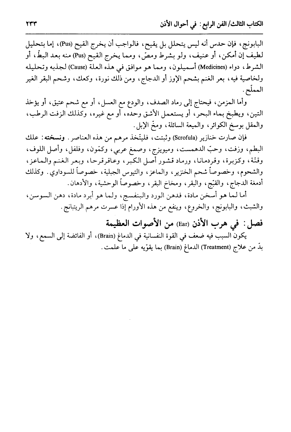 البابونج فَإِن حدس إِنَّه لَيْسَ يتَحَلَّل بل يقيح فَالْوَاجِب أَن يخرج الْقَيْح إِمَّا بتحليل لطيف إِن أمكن أَو عنيف وَلَو بِشَرْط ومص وَمِمَّا يخرج الْقَيْح مِنْهُ بعد البط أَو الشَّرْط دَوَاء أسميلون وَمِمَّا هُوَ مُوَافق فِي هَذِه الْعلَّة لجذبه وتحليله ولخاصية فِيهِ بعر الْغنم بشحم الأوز أَو الدَّجَاج وَمن ذَلِك نورة وكعك وشحم الْبَقر الْغَيْر المملح. وَأما المزمن فَيحْتَاج إِلَى رماد الصدف والودع مَعَ الْعَسَل أَو مَعَ شَحم عَتيق أَو يُؤْخَذ التِّين ويطبخ بِمَاء الْبَحْر أَو يسْتَعْمل الأشق وَحده أَو مَعَ غَيره وَكَذَلِكَ الزفت الرطب والمقل بوسخ. الكوائر والميعة السائلة ومخ الْإِبِل. فَإِن صَارَت خنازير وَثبتت فليتخذ مرهم من هَذِه العناصر. ونسخته: علك البطم وزفت وَحب الدهمست وميويزج وصمغ عَرَبِيّ وكمّون وفلفل وأصل اللوف وقنة وكزبرة وقردمانا ورماد قشور أصل الْكبر وعاقرقرحا وبعر الْغنم والماعز والشحوم وخصوصاً شَحم الْخِنْزِير والماعز والتيوس الجبلية خُصُوصا للسوداوي. وَكَذَلِكَ أدمغة الدَّجَاج والقبج وَالْبَقر ومخاخ الْبَقر وخصوصاً الوحشية والأدهان. أما لما هُوَ أسخن مَادَّة فَإِن الْورْد والبنفسج وَلما هُوَ أبرد مَادَّة دهن السوسن والشبث والبابونج والخروع وينفع من هَذِه الأورام إِذا عسرت مرهم الريتبانج. فصل فِي هرب الْأذن من الْأَصْوَات الْعَظِيمَة يكون السَّبَب فِيهِ ضعف فِي الْقُوَّة النفسانية فِي الدِّمَاغ أَو الفائضة إِلَى السّمع وَلَا بدّ من علاج الدِّمَاغ بِمَا يقويه على مَا علمت.