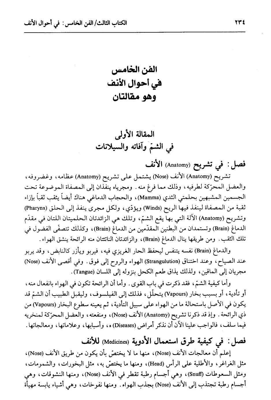 وَهُوَ مقالتان: الْمقَالة الأولى الشمّ وآفاته والسيلانات فصل فِي تشريح الْأنف تشريح الْأنف يشْتَمل على تشريح عِظَامه وغضروفه والعضل المحركة لطرفيه وَذَلِكَ مِمَّا فرغ مِنْهُ. ومجرياه ينفذان إِلَى المصفاة الْمَوْضُوعَة تَحت الجسمين المشبهين بحلمتي الثدي والحجاب الدماغي هُنَاكَ أَيْضا يثقب ثقباً بِإِزَاءِ ثقبة من المصفاة لينفذ فِيهَا الرّيح ويؤدّي وَلكُل مجْرى ينفذ إِلَى الْحلق وتشريح الْآلَة الَّتِي بهَا يَقع الشم وَتلك هِيَ الزائدتان الحلميتان اللَّتَان فِي مقدّم الدِّمَاغ ويستمدان من البطنين المقدمين من الدِّمَاغ وَكَذَلِكَ تتصفّى الفضول فِي تِلْكَ النقب. وَمن طريقها ينَال الدِّمَاغ والزائدتان الناتئتان مِنْهُ الرَّائِحَة ينشق الْهَوَاء. والدماغ نَفسه يتنفس ليحفظ الْحَار الغريزي فِيهِ فيربو ويأزر كالنابض وَقد يَرْبُو عِنْد الصياح وَعند اختناق الْهَوَاء وَالروح إِلَى فَوق. وَفِي أقْصَى الْأنف مجريان إِلَى الماقين وَلذَلِك يذاق طعم الْكحل بنزوله إِلَى اللِّسَان. وَأما كَيْفيَّة الشم فقد ذكرت فِي بَاب القوى. وَأما أَن الرَّائِحَة تكون فِي الْهَوَاء بانفعال مِنْهُ أَو تأدية أَو بِسَبَب بخار يتحلّل فَذَلِك إِلَى الفيلسوف وليقبل الطَّبِيب أَن الشمّ قد يكون فِي الأَصْل باستحالة مَا من الْهَوَاء على سَبِيل التأدية ثمَّ يُعينهُ سطوع البخار من فِي الرَّائِحَة. وَإِذ قد ذكرنَا تشريح الْأنف ومنفعته والعضل المحركة لمنخريه فِيمَا سلف فَالْوَاجِب علينا الْآن أَن نذْكر أمراضه وأسبابها وعلاماتها معالجاتها. فصل فِي كَيْفيَّة اسْتِعْمَال الْأَدْوِيَة للأنف اعْلَم أَن معالجات الْأنف مِنْهَا مَا لَا يختصّ بِأَن يكون من طَرِيق الْأنف مثل الغراغر والأطلية على الرَّأْس وَمِنْهَا مَا يختصّ بِهِ مثل البخورات والشمومات وَمثل السعوطات وَهِي أجسام رطبَة تقطر فِي الْأنف وَمِنْهَا النشوقات وَهِي أجسام رطبَة تجتذب إِلَى الْأنف بجذب الْهَوَاء. وَمِنْهَا نفوخات وَهِي أَشْيَاء يابسة مهيأة