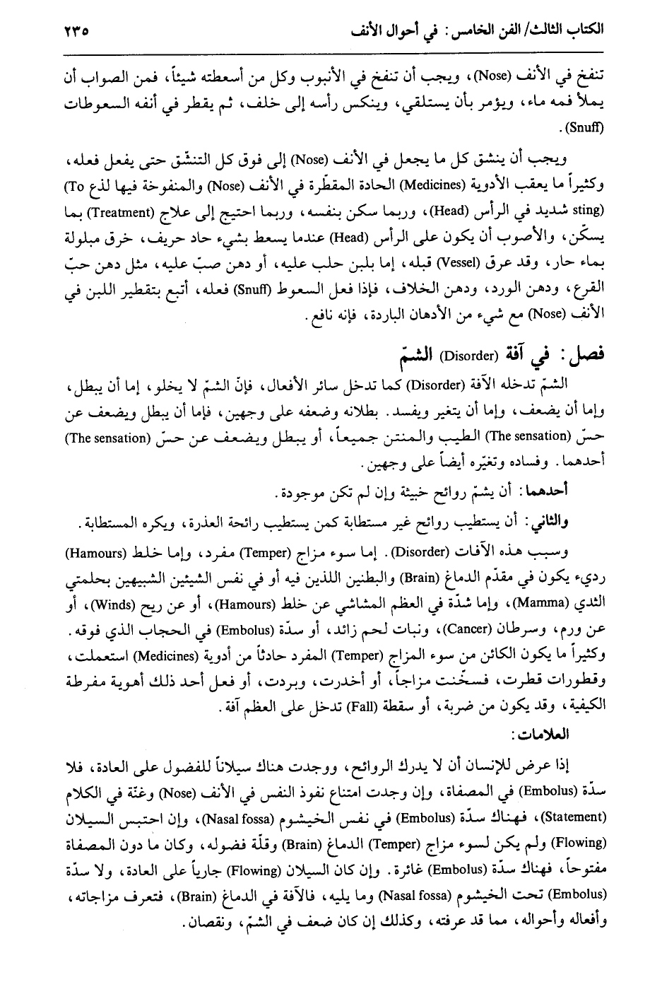 تنتفخ فِي الْأنف وَيجب أَن تنفخ فِي الأنبوب وكل من أسعطته شَيْئا فَمن الصَّوَاب أَن يمْلَأ فَمه مَاء وَيُؤمر بِأَن يستلقي وينكس رَأسه إِلَى خلف ثمَّ يقطر فِي أَنفه السعوطات. وَيجب أَن ينشق كل مَا يَجْعَل فِي الْأنف إِلَى فَوق كل التنشّق حَتَّى يفعل فعله وَكَثِيرًا مَا يعقب الْأَدْوِيَة الحادة المقطّرة فِي الْأنف والمنفوخة فِيهَا لذع شَدِيد فِي الرَّأْس وَرُبمَا سكن بِنَفسِهِ وَرُبمَا احْتِيجَ إِلَى علاج بِمَا يسكن والأصوب أَن يكون على الرَّأْس عِنْدَمَا يسعط بِشَيْء حاد حريف خرق مبلولة بِمَاء حَار وَقد عرق قبله إِمَّا بِلَبن حلب عَلَيْهِ أَو دهن صب عَلَيْهِ مثل دهن حبّ القرع ودهن الْورْد ودهن الْخلاف فَإِذا فعل السعوط فعله أتبع بتقطير اللَّبن فِي الْأنف مَعَ شَيْء من الأدهان الْبَارِدَة فَإِنَّهُ نَافِع. فصل فِي آفَة الشمّ الشمّ تدخله الآفة كَمَا تدخل سَائِر الْأَفْعَال فإنّ الشمّ لَا يَخْلُو إِمَّا أَن يبطل وَإِمَّا أَن يضعف وَإِمَّا أَن يتَغَيَّر وَيفْسد بُطْلَانه وَضَعفه على وَجْهَيْن فإمَّا أَن يبطل ويضعف عَن حس الطّيب والمنتن جَمِيعًا أَو يبطل ويضعف عَن حس أَحدهمَا. وفساده تغيّره أَيْضا على وَجْهَيْن. أَحدهمَا: أَن يشمّ رَوَائِح خبيثة وَإِن لم تكن مَوْجُودَة. وَالثَّانِي: أَن يَسْتَطِيب رَوَائِح غير مستطابة كمن يَسْتَطِيب رَائِحَة الْعذرَة وَيكرهُ المستطابة. وَسبب هَذِه الْآفَات. إِمَّا سوء مزاج مُفْرد وَإِمَّا خلط رَدِيء يكون فِي مقدّم الدِّمَاغ والبطنين اللَّذين فِيهِ أَو فِي نفس الشَّيْئَيْنِ الشبيهين بحلمتي الثدي وَأما شدّة فِي الْعظم المشاشي عَن خلط أَو عَن ريح أَو عَن ورم وسرطان ونبات لحم زَائِد أَو سدّة فِي الْحجاب الَّذِي فَوْقه. وَكَثِيرًا مَا يكون الْكَائِن من سوء المزاج الْمُفْرد حَادِثا من أدوية اسْتعْملت وقطورات قطرت فسخّنت مزاجاً أَو أخدرت وَبَردت أَو فعل أحد ذَلِك أهوية مفرطة الْكَيْفِيَّة وَقد يكون من ضَرْبَة أَو سقطة تدخل على الْعظم آفَة. العلامات: إِذا عرض للْإنْسَان أَن لَا يدلك الروائح وَوجدت هُنَاكَ سيلاناً للفضول على الْعَادة فَلَا سدّة فِي المصفاة وَإِن وجدت امْتنَاع نُفُوذ النَّفس فِي الْأنف وغنة فِي الْكَلَام فهناك سدّة فِي نفس الخيشوم وَإِن احْتبسَ السيلان وَلم يكن لسوء مزاج الدِّمَاغ وقلّة فضوله وَكَانَ مَا دون المصفاة مَفْتُوحًا فهناك سدّة غائرة. وَإِن كَانَ السيلان جازياً على الْعَادة وَلَا سدّة تَحت الخيشوم وَمَا يَلِيهِ فالآفة فِي الدِّمَاغ فتعرف مزاجاته وأفعاله وأحواله مِمَّا قد عَرفته وَكَذَلِكَ إِن كَانَ ضعف فِي الشمّ ونقصان.