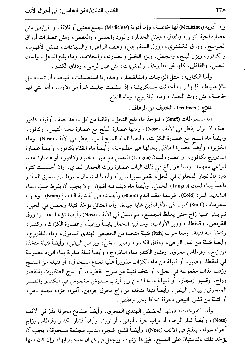 وَإِمَّا الدوية لَهَا خاصية وَإِمَّا أدوية تجمع مَعْنيين أَو ثَلَاثَة. والقوابض مثل عصارة لحية التيس والقاقيا وَمثل الجلنار والورد والعدس والعفص وَمثل عصارات أوراق العوسج وورق الكمثري وورق السفرجل وعصا الرَّاعِي والمبردات فَمثل الأفيولت والكافور وبزر البنج والجصّ وبزر الخس وعصارته وَالْخلاف وَمَاء بلح النّخل ولسان الْحمل والقاقلي كلهَا غير مطبوخة. والمغريات مثل غُبَار الرَّحَى ودقاق الكندر. وَأما الكاوية مثل الزاجات والقلقطار وَهَذِه إِذا اسْتعْملت فَيجب أَن تسْتَعْمل بِالِاحْتِيَاطِ فَإِنَّهَا رُبمَا أحدثت خشكريشة إِذا سَقَطت جلبت شرا من الأولى. وَأما الَّتِي لَهَا خاصية مثل علاج الْخَفِيف من الرعاف: أما السعوطات فَيُؤْخَذ مَاء بلح النّخل وقاقيا من كل وَاحِد نصف أُوقِيَّة كافور حَبَّة لَا يزَال يقطر فِي الْأنف وَمِنْهَا عصارة البلح مَعَ عصارة لحية التيس وكافور وَأَيْضًا مَاء البلح مَعَ عصارة الكراث وَأَيْضًا المَاء الْملح المر يقطر فِي الْأنف وَمَاء الكزبرة وَأَيْضًا عصارة القاقلي بِحَالِهَا غير مطبوخة وَأَيْضًا مَاء القثاء بكافور وَأَيْضًا عصارة الباذروج بكافور أَو عصارة لِسَان الْحمل مَعَ طين مختوم وكافور أَو عصارة عَصا الرَّاعِي مَعَهُمَا. وَمِمَّا هُوَ بَالغ فِي ذَلِك الْبَاب عصارة رَوْث الْحمار الطري وَإِن أحسست كَثْرَة دم فالزنجار المحلول فِي الْخلّ يقطر يَسِيرا يَسِيرا وَأَيْضًا اسْتِعْمَال سعط من سحيق الجلنار نَاعِمًا بِمَاء لِسَان الْحمل وَأَيْضًا مَاء ديف فِيهِ أفيون. وَلَا يجب أَن يفرط صبّ المَاء الشَّديد الْبرد فَرُبمَا عقد الدَّم وأجمده فِي أغشية الدِّمَاغ. وَهَهُنَا سعوطات كتبت فِي الأقراباذين غَايَة جَيِّدَة. وَأما الفتائل تُؤْخَذ فَتِيلَة وتغمس فِي الحبر ثمَّ ينثر عَلَيْهِ زاج حَتَّى يغلظ الْجَمِيع ثمَّ يدس فِي الْأنف وَأَيْضًا تُؤْخَذ عصارة ورق القريص وقلقطار ووبر الأرانب وسرقين الْحمار يَابسا ورطباً وعصارة الكرّاث وكندر ويتخذ مِنْهُ فَتِيلَة. وَمِمَّا جرب فَتِيلَة متخذة من الحضض الْهِنْدِيّ المحرق وَمَاء الباذروج وَأَيْضًا فَتِيلَة من غُبَار الرَّحَى ودقاق الكندر وصبر بالخلّ وَبَيَاض الْبيض وَأَيْضًا فَتِيلَة متخذة من زاج وَقِرْطَاس محرق وقشار الكندر بِمَاء الباذروج وَأَيْضًا فَتِيلَة مبلولة بِمَاء الْورْد مغموسة فِي قلقطار وصبر أَو فَتِيلَة من مَاء الكراث مذروراً عَلَيْهِ نعناع مسحوق أَو فَتِيلَة من اسفنج وزفت مذاب مغموسة فِي الْخلّ أَو تتَّخذ فَتِيلَة من سراج القطرب أَو نسج العنكبوت بقلقطار وزاج وَقَلِيل زنجار أَو فَتِيلَة متخذة من وبر أرنب منفوش مغموس فِي الكندر وَالصَّبْر المعجونين ببياض الْبيض وَأَيْضًا فَتِيلَة متخذة من زاج محرق جزءين أفيون جُزْء يجمع بخلّ أَو فَتِيلَة من قشور الْبيض محرقة تخلط بحبر وعفص. وَأما النفوخات فَمِنْهَا الحضض الْهِنْدِيّ المحرق وَأَيْضًا ضفادع محرقة تذر فِي الْأنف وَأَيْضًا غُبَار الرحا أَو تُرَاب حرف أَبيض أَو نورة وَأَيْضًا قشار الكندر وَقِرْطَاس وزاج أَجزَاء سَوَاء ينْفخ فِي الْأنف وَأَيْضًا قشور شَجَرَة الدلب مجففة مسحوقة يجب أَن يُؤْخَذ ذَلِك بالدستبان على الْمسْح فَيُؤْخَذ زئبره وَيجْعَل فِي كيزان جحد بترابها وَإِن كَانَ مَعهَا