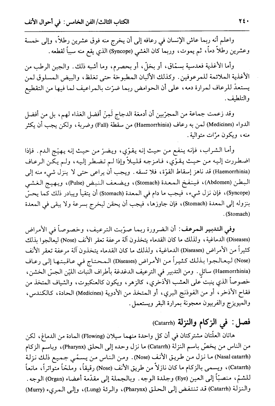 وَاعْلَم أَنه رُبمَا عَاشَ الْإِنْسَان فِي رعافه إِلَى أَن يخرج مِنْهُ فَوق عشْرين رطلا وَإِلَى خَمْسَة وَعشْرين رطلا دَمًا ثمَّ يَمُوت وَرُبمَا كَانَ الغشي الَّذِي يَقع مِنْهُ سَببا لقطعه. وَأما الأغذية فعدسية بسمّاق أَو بخل أَو بحصرم وَمَا أشبه ذَلِك. والجبن الرطب من الأغذية الملائمة للمرعوفين. وَكَذَلِكَ الألبان المطبوخة حَتَّى تغلظ وَالْبيض المسلوق لمن يستعد للرعاف لمرارة دَمه على أَن الحوامض رُبمَا ضرّت بالمراعيف لما فِيهَا من التقطيع والتلطيف. وَقد زعم جمَاعَة من المجرّبين أَن أدمغة الدَّجَاج لَمِنْ أفضل الْغذَاء لَهُم بل من أفضل الدَّوَاء لمن بِهِ رُعَاف من سقطة وضربة وَلَكِن يجب أَن يكثر مِنْهُ وَيكون مَرَّات مُتَوَالِيَة. وَأما الشَّرَاب فَإِنَّهُ ينفع من حَيْثُ أَنه يُقَوي ويضرّ من حَيْثُ أَنه يهيج الدَّم. فَإِذا اضطررت إِلَيْهِ من حَيْثُ يُقَوي فامزجه قَلِيلا وَإِذا لم تضطر إِلَيْهِ وَلم يكن الرعاف قد ناهز إِسْقَاط القوّة فَلَا تسقه. وَيجب أَن يُرَاعى حَتَّى لَا ينزل شَيْء مِنْهُ إِلَى الْبَطن فينفخ الْمعدة ويضعف النبض ويهيج الغشي فَإِن نزل شَيْء فَيجب مَا دَامَ فِي الْمعدة أَن يتقيأ ويبادر ذَلِك كَمَا يحسّ بنزوله إِلَى الْمعدة فَإِن جاوزها فَيجب أَن يحقن ليخرج بِسُرْعَة وَلَا يبْقى فِي الْمعدة. وَفِي التَّدْبِير المرعف: أَن الضَّرُورَة رُبمَا صوّبت الترعيف وخصوصاً فِي الْأَمْرَاض الدماغية وَلذَلِك مَا كَانَ القدماء يتخذون آلَة مرعفة تعقر الْأنف ليعالجوا بذلك كثيرا من الْأَمْرَاض الدماغية وَلذَلِك مَا كَانَ القدماء يتخذون آلَة مرعفة تعقر الْأنف ليعالجوا بذلك كثيرا من الْأَمْرَاض الْمُحْتَاج فِي عَاقبَتهَا إِلَى رُعَاف سَائل. وَمن التَّدْبِير فِي الترعيف الدغدغة بأطراف النَّبَات الليّن الجسّ الخشن خُصُوصا الَّذِي ينْبت على العشب الأذخري كالزهر وَيكون كالعنكبوت والشياف الْمُتَّخذ من فقاح الأذخر أَو من الفوذنج الْبري أَو الْمُتَّخذ من الْأَدْوِيَة الحادة فصل فِي الزُّكَام والنزلة هَاتَانِ العلتان مشتركتان فِي أَن كل وَاحِد مِنْهُمَا سيلان الْمَادَّة من الدِّمَاغ لَكِن من النَّاس من يخصّ باسم النزلة مَا نزل وَحده إِلَى الْحلق وباسم الزُّكَام مَا نزل من طَرِيق الْأنف. وَمن النَّاس من يسمّي جَمِيع ذَلِك نزلة وَيُسمى بالزكام مَا كَانَ نازلاً من طَرِيق الْأنف رَقِيقا وملّحاً متواتراً مَانِعا للشمّ منصبّاً إِلَى الْعين وجلدة الْوَجْه. وَبِالْجُمْلَةِ إِلَى مقدّمة أَعْضَاء الْوَجْه. والنزلة قد تنتفض إِلَى الْحلق والرئة وَإِلَى المريء