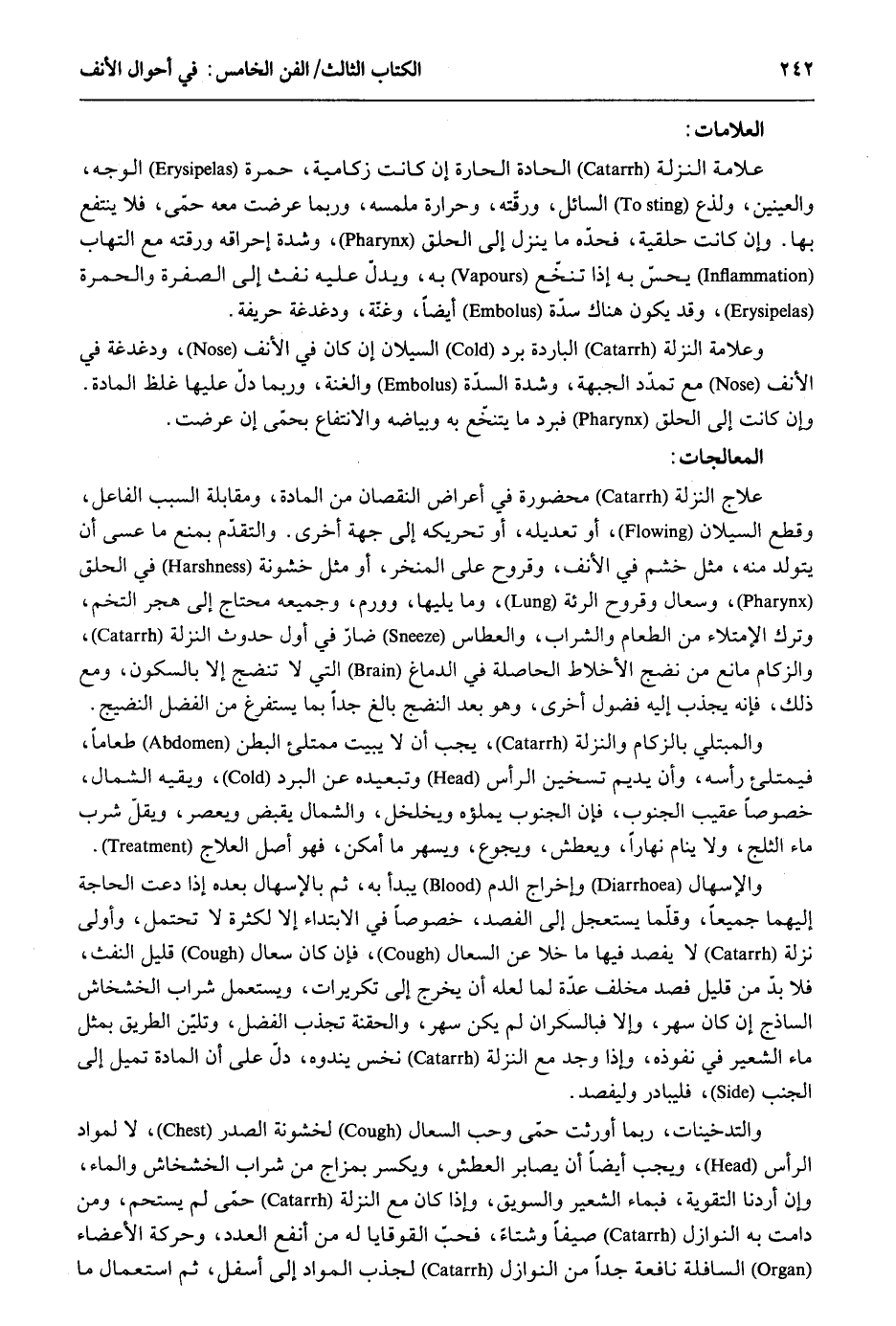 العلامات: عَلامَة النزلة الحادة الحارة إِن كَانَت زكامية حمرَة الْوَجْه والعينين ولذع السَّائِل ورقته وحرارة ملمسه وَرُبمَا عرضت مَعَه حمى فَلَا ينْتَفع بهَا. وَإِن كَانَت حلقية فحدّه مَا ينزل إِلَى الْحلق وَشدَّة إحراقه ورقته مَعَ التهاب يحسّ بِهِ إِذا تنخع بِهِ ويدلّ عَلَيْهِ نفث إِلَى الصُّفْرَة والحمرة وَقد يكون هُنَاكَ سدّة أَيْضا وغنّة ودغدغة حريفة. وعلامة النزلة الْبَارِدَة برد السيلان إِن كَانَ فِي الْأنف ودغدغة فِي الْأنف مَعَ تمدد الْجَبْهَة وَشدَّة السدة والغنة وَرُبمَا دلّ عَلَيْهَا غلظ الْمَادَّة. وَإِن كَانَت إِلَى الْحلق فبرد مَا يتنخّع بِهِ وبياضه وَالِانْتِفَاع بحمّى إِن عرضت. المعالجات: علاج النزلة محصورة فِي أَعْرَاض النُّقْصَان من الْمَادَّة ومقابلة السَّبَب الْفَاعِل وَقطع السيلان أَو تعديله أَو تحريكه إِلَى جِهَة أُخْرَى. والتقدّم بِمَنْع مَا عَسى أَن يتَوَلَّد مِنْهُ مثل خشم فِي الْأنف وقروح على المنخر أَو مثل خشونة فِي الْحلق وسعال وقروح الرئة وَمَا يَليهَا وورم وجميعه مُحْتَاج إِلَى هجر التخم وَترك الامتلاء من الطَّعَام وَالشرَاب والعطاس ضارّ فِي أول حُدُوث النزلة والزكام مَانع من نضج الأخلاط الْحَاصِلَة فِي الدِّمَاغ الَّتِي لَا تنضج إِلَّا بِالسُّكُونِ وَمَعَ ذَلِك فَإِنَّهُ يجذب إِلَيْهِ فضول أُخْرَى وَهُوَ بعد النضج بَالغ جدا بِمَا يستفرع من الْفضل النضيج. والمبتلي بالزكام والنزلة يجب أَن لَا يبيت ممتلئ الْبَطن طَعَاما فيمتلئ رَأسه وَأَن يديم تسخين الرَّأْس وتبعيده عَن الْبرد ويقيه الشمَال خُصُوصا عقيب الْجنُوب فَإِن الْجنُوب يملأه ويخلخل وَالشمَال يقبض ويعصر ويقلّ شرب مَاء الثَّلج وَلَا ينَام نَهَارا ويعطش ويجوع ويسهر مَا أمكن فَهُوَ أصل العلاج. والإسهال وَإِخْرَاج الدَّم يبْدَأ بِهِ ثمَّ بالإسهال بعده إِذا دعت الْحَاجة إِلَيْهِمَا جَمِيعًا وقلّما يستعجل إِلَى الفصد خُصُوصا فِي الِابْتِدَاء إِلَّا لِكَثْرَة لَا تحْتَمل وَأولى نزلة لَا يفصد فِيهَا مَا خلا عَن السعال فَإِن كَانَ سعال قَلِيل النفث فَلَا بُد من قَلِيل فصد مخلف عدَّة لما لَعَلَّه أَن يخرج إِلَى تكريرات وَيسْتَعْمل شراب الخشخاش الساذج إِن كَانَ سهر وَإِلَّا فبالسكران لم يكن سهر والحقنة تجذب الْفضل وتليق الطَّرِيق بِمثل مَاء الشّعير فِي نُفُوذه وَإِذا وجد مَعَ النزلة نخس يندوه دلّ على أَن الْمَادَّة تميل إِلَى الْجنب فليبادر وليفصد. والتدخينات رُبمَا أورثت حمّى وَحب السعال لخشونة الصَّدْر لَا لمواد الرَّأْس وَيجب أَيْضا أَن يصابر الْعَطش وَيكسر بمزاج من شراب الخشخاش وَالْمَاء وَإِن أردنَا التقوية فبماء الشّعير والسويق وَإِذا كَانَ مَعَ النزلة حمّى لم يستحم وَمن دَامَت بِهِ النَّوَازِل صيفياً وشتاءً فحبّ القوقايا لَهُ من أَنْفَع الْعدَد وحركة الْأَعْضَاء السافلة نافعة جدا من النَّوَازِل لجذب الْموَاد إِلَى أَسْفَل ثمَّ اسْتِعْمَال مَا