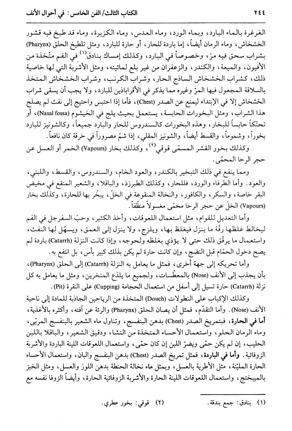 الغرغرة بِالْمَاءِ الْبَارِد وبماء الْورْد وَمَاء العدس وَمَاء الكزبرة وَمَاء قد طبخ فِيهِ قشور الخشخاش وَمَاء الرُّمَّان أَيْضا أما بَارِدَة للحار أَو حارة للبارد وَمثل تلطيخ الْحلق بشراب سحق فِيهِ مر وخصوصاً فِي الْبَارِد وَكَذَلِكَ إمْسَاك بَنَادِق فِي الْفَم متخذة من الأفيون والميعة والكندر والزعفران من غير بلع لمائيته وَمثل الْأَشْرِبَة الَّتِي لَهَا خاصية ذَلِك كشراب الخشخاش الساذج الْحَار وشراب الكرنب وشراب الخشخاش الْمُتَّخذ بالسلاقة المجعول فِيهَا المر وَغَيره مِمَّا يذكر فِي الأقراباذين للبارد وَلَا يجب أَن يسقى شراب الخشخاش إِلَّا فِي الِابْتِدَاء ليمنع عَن الصَّدْر فَأَما إِذا احْتبسَ واحتيج إِلَى نفث لم يصلح هَذَا الشَّرَاب وَمثل البخورات الحابسة يسْتَعْمل بِحَيْثُ يلج فِي الخيشوم أَو تحنكاً حابساً للبخار وَهَذِه البخورات كالسندروس للحار والبارد جَمِيعًا وكالشونيز للبارد بخوراً وشموماً والقسط أَيْضا والشونيز المقلي إِذا شمّ مصروراً فِي خرقَة كَانَ نَافِعًا. وَكَذَلِكَ بخور القشر المسمّى قوقي وَكَذَلِكَ بخار الْخمر أَو الْعَسَل عَن حجر الرحا المحمّي. وَمِمَّا ينفع فِي ذَلِك التبخير بالكندر وَالْعود الخام والسندروس والقسط واللبني وَالْعود. وَأما الطرفاء والورد فللحار وَكَذَلِكَ الطبرزذ والباقلا وَالشعِير المنقع فِي مخيض الْبَقر خَاصَّة وَالسكر والكافور والنخالة المنقوعة فِي الْخلّ يبخر بهَا للحارة وَكَذَلِكَ بخار الْخلّ عَن حجر الرحا محمى مغسولاً منظّفاً. وَأما التَّعْدِيل للقوام مثل اسْتِعْمَال اللعوقات وَأخذ الْكثير وَحب السفرجل فِي الْفَم ليخالط غلظها رقة مَا ينزل فيغلظ بهَا ويلزج وَلَا ينزل إِلَى العمق ويسهل لَهَا النفث وَاسْتِعْمَال مَا يرقّق ذَلِك حَتَّى لَا يُؤْذِي بغلظه ولحوجه وَإِذا كَانَت النزلة بارعة لم يَصح دُخُول الْحمام قبل النضج وَإِن كَانَت حارة لم يكن بذلك كَبِير بَأْس بل انْتفع بِهِ. وَأما تحريكه إِلَى جِهَة أُخْرَى فَمثل مَا يُعَامل بِهِ النزلة إِلَى الْحلق بِأَن يجذب إِلَى الْأنف بالمعطسات وَلِجَمِيعِ مَا يلذع المنخرين وَمثل مَا يُعَامل بِهِ كل نزلة حارة تسيل إِلَى أَسْفَل من اسْتِعْمَال الْحجامَة على النقرة. وَكَذَلِكَ الإكباب على النطولات المتخذة من الرياحين الجاذبة للمادة إِلَى نَاحيَة الْأنف. وَأما التَّقَدُّم فَمثل أَن يصان الْحلق والرئة عَن آفته وَأَكْثَره بالأغذية أما فِي الحارة فبتمريخ الصَّدْر بدهن البنفسج وَتَنَاول مَاء الشّعير بالبنفسج المربى وَمَاء الرُّمَّان الحلو وَاسْتِعْمَال الأحساء المتخذة من النشا ودقيق الشّعير والباقلا بِاللَّبنِ الحليب إِن لم يكن حمى ويضر اللَّبن إِن كَانَ حمى وَاسْتِعْمَال اللعوقات اللينة الْبَارِدَة والأشربة الزوفائية. وَأما فِي الْبَارِد فَمثل تمريخ الصَّدْر بدهن البنفسج والبان وَاسْتِعْمَال الأحساء الحارة المليّنة مثل الأطرية بالعسل وبمثل مَاء نخالة الْحِنْطَة بدهن اللوز وَالْعَسَل وَمثل الْخبز بالمبيختج وَاسْتِعْمَال اللعوقات اللينة الحارة والأشربة الزوفائية الحارة وَأَيْضًا الزوفا نَفسه مَعَ