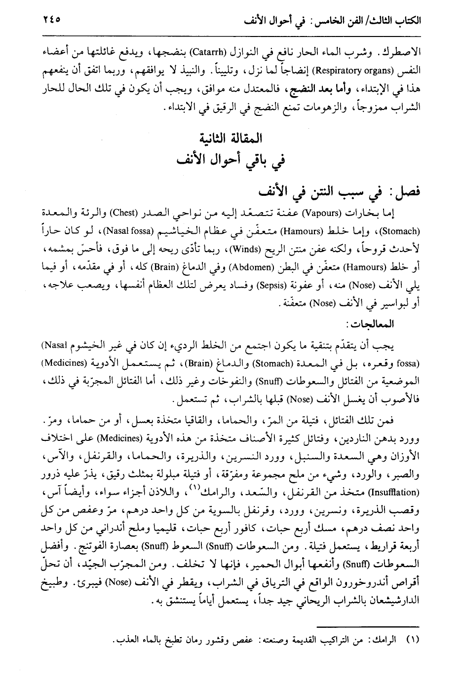 الاصطرك. وَشرب المَاء الْحَار نَافِع فِي النَّوَازِل بنضجها وَيدْفَع غائلتها من أَعْضَاء النَّفس إنضاجاً لما نزل وتلييناً والنبيذ لَا يوافقهم وَرُبمَا اتّفق أَن يَنْفَعهُمْ هَذَا فِي الِابْتِدَاء وَأما بعد النضج فالمعتدل مِنْهُ مُوَافق وَيجب أَن يكون فِي تِلْكَ الْحَال للحار الشَّرَاب ممزوجاً والزهومات تمنع النضج فِي الرَّقِيق فِي الِابْتِدَاء. الْمقَالة الثَّانِيَة بَاقِي أَحْوَال الْأنف فصل فِي سَبَب النتن فِي الْأنف: إِمَّا بخارات عفنة تتصعد إِلَيْهِ من نواحي الصَّدْر والرئة والمعدة وَإِمَّا خلط متعفن فِي عِظَام الخياشيم لَو كَانَ حاراً لأحدث قروحاً وَلكنه عفن منتن الرّيح رُبمَا تأدى رِيحه إِلَى مَا فَوق فأحس بمشمه أَو خلط متعفن فِي الْبَطن وَفِي الدِّمَاغ كُله أَو فِي مقدمه أَو فِيمَا يَلِي الْأنف مِنْهُ المعالجات: يجب أَن يتَقَدَّم بتنقية مَا يكون اجْتمع من الْخَلْط الرَّدِيء إِن كَانَ فِي غير الخيشوم وقعره بل فِي الْمعدة والدماغ ثمَّ يسْتَعْمل الْأَدْوِيَة الموضعية من الفتائل والسعوطات والنفوخات وَغير ذَلِك أما الفتائل المجربة فِي ذَلِك فالأصوب أَن يغسل الْأنف قبلهَا بِالشرابِ ثمَّ تسْتَعْمل. فَمن تِلْكَ الفتائل فَتِيلَة من المر والحماما والقاقيا متخذة بِعَسَل أَو من حَماما وَمر. وَورد بدهن الناردين وفتائل كَثِيرَة الْأَصْنَاف متخذة من هَذِه الْأَدْوِيَة على اخْتِلَاف الأوزان وَهِي السعدة والسنبل وَورد النسرين والذريرة والحماما والقرنفل والآس وَالصَّبْر والورد وَشَيْء من ملح مَجْمُوعَة ومفرقة أَو فَتِيلَة مبلولة بمثلث رَقِيق يذر عَلَيْهِ ذرور متخذ من القرنفل والسعد والرامك واللاذن أَجزَاء سَوَاء وَأَيْضًا آس وقصب الزريرة ونسرين وَورد وقرنفل بِالسَّوِيَّةِ من كل وَاحِد دِرْهَم مر وعفص من كل وَاحِد نصف دِرْهَم مسك أَربع حبات كافور أَربع حبات قليميا وملح أنحراني من كل وَاحِد أَرْبَعَة قراريط يسْتَعْمل فَتِيلَة. وَمن السعوطات السعوط بعصارة الفوتنج. وَأفضل السعوطات وأنفعها أَبْوَال الْحمير فَإِنَّهَا لَا تخلف. وَمن المجرّب الْجيد أَن تحل أَقْرَاص أنحروخورون الْوَاقِع فِي الترياق فِي الشَّرَاب ويقطر فِي الْأنف فيبرئ. وطبيخ الدارشيشعان بِالشرابِ الريحاني جيد جدا يسْتَعْمل أَيَّامًا يستنشق بِهِ.