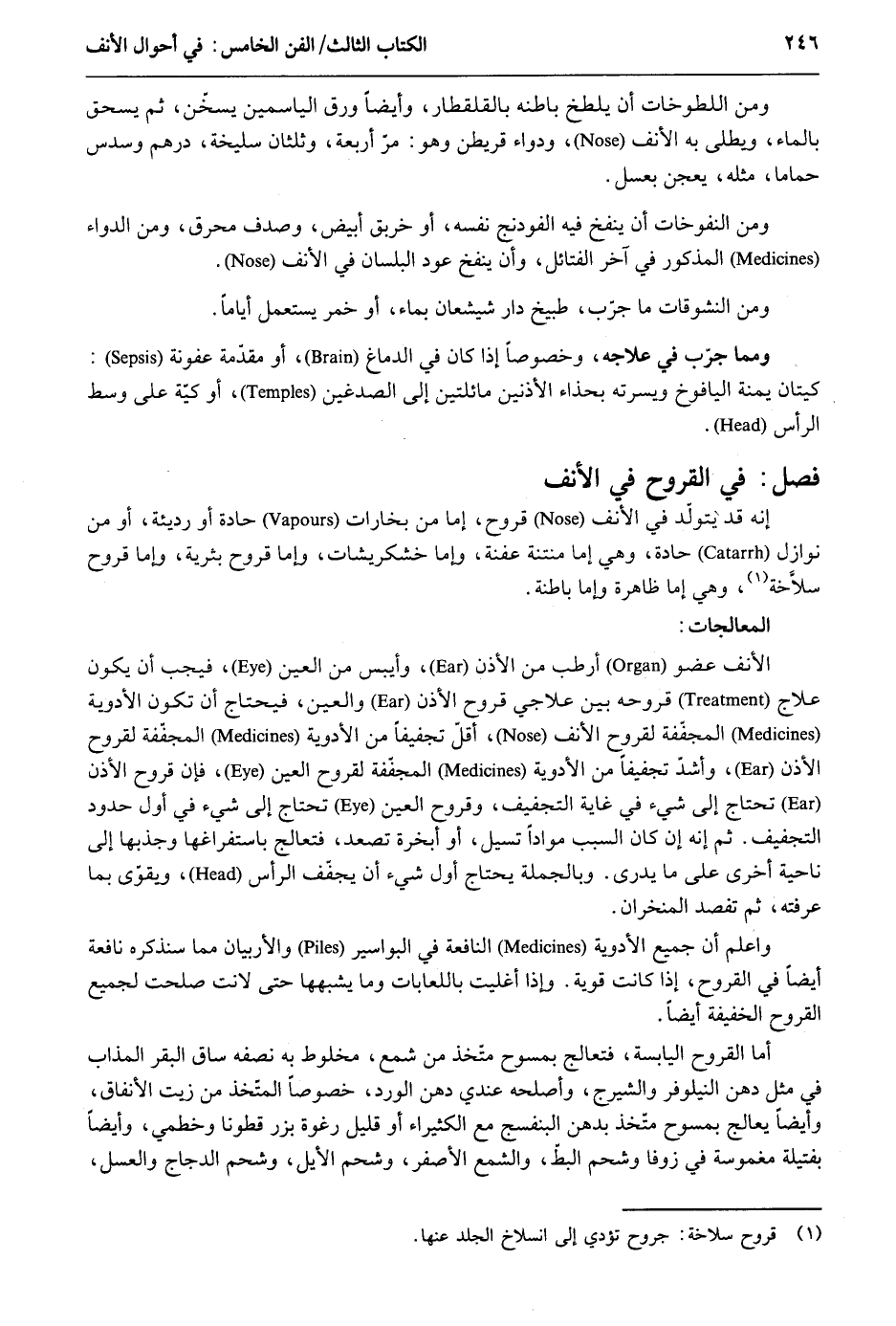 وَمن اللطوخات أَن يلطخ بَاطِنه بالقلقطار وَأَيْضًا ورق الياسمين يسخن ثمَّ يسحق بِالْمَاءِ ويطلى بِهِ الْأنف ودواء قريطن وَهُوَ: مر أَرْبَعَة وَثُلُثَانِ سليخة دِرْهَم وَسدس حَماما مثله يعجن بِعَسَل. وَمن النفوخات أَن ينْفخ فِيهِ الفودنج نَفسه أَو خربق أَبيض وصدف محرق وَمن الدَّوَاء الْمَذْكُور فِي آخر الفتائل وَأَن ينْفخ عود البلسان فِي الْأنف. وَمن النشوقات مَا جرّب طبيخ دارشيشعان بِمَاء أَو خمر يسْتَعْمل أَيَّامًا. وَمِمَّا جرب فِي علاجه وخصوصاً إِذا كَانَ فِي الدِّمَاغ أَو مقدّمة عفونة: كَيَّتَانِ يمنة اليافوخ ويسرته بحذاء الْأُذُنَيْنِ مائلتين إِلَى الصدغين أَو كَيَّة على وسط الرَّأْس. فصل فِي القروح فِي الْأنف إِنَّه قد يتَوَلَّد فِي الْأنف قُرُوح إِمَّا من بخارات حادة أَو رَدِيئَة أَو من نَوَازِل حادة وَهِي إِمَّا مُنْتِنَة عفنة وَإِمَّا خشركيشات وَإِمَّا قُرُوح بثرية وَإِمَّا قُرُوح سلاَّخة وَهِي إِمَّا ظَاهِرَة وَإِمَّا باطنة. المعالجات: الْأنف عُضْو أرطب من الْأذن وأيبس من الْعين فَيجب أَن يكون علاج قروحه بَين علاجي قُرُوح الْأذن وَالْعين فَيحْتَاج أَن تكون الْأَدْوِيَة المجفّفة لقروح الْأنف أقلّ تجفيفاً من الْأَدْوِيَة المجففة لقروح الْأذن وَأَشد تجفيفاً من الْأَدْوِيَة المجفّفة لقروح الْعين فَإِن قُرُوح الْأذن تحْتَاج إِلَى شَيْء فِي غَايَة التجفيف وقروح الْعين تحْتَاج إِلَى شَيْء فِي أول حُدُود التجفيف. ثمَّ أَنه إِن كَانَ السَّبَب مواد تسيل أَو أبخرة تصعد فتعالج باستفراغها وجذبها إِلَى نَاحيَة أُخْرَى على مَا يدْرِي. وَبِالْجُمْلَةِ يحْتَاج أول شَيْء أَن يجفّف الرَّأْس ويقوّى بِمَا عَرفته ثمَّ تفصد المنخران. وَاعْلَم أَن جَمِيع الْأَدْوِيَة النافعة فِي البواسير والأربيان مِمَّا سَنذكرُهُ نافعة أَيْضا فِي القروح إِذا كَانَت قَوِيَّة. وَإِذا أغليت باللعابات وَمَا يشبهها حَتَّى لانت صلحت لجَمِيع القروح الْخَفِيفَة أَيْضا. أما القروح الْيَابِسَة فتعالج بمسوح متّخذ من شمع مخلوط بِهِ نصفه سَاق الْبَقر الْمُذَاب فِي مثل دهن النيلوفر والشيرج وَأَصْلحهُ عِنْدِي دهن الْورْد خُصُوصا المتّخذ من زَيْت الأنفاق وَأَيْضًا يعالج بمسوح متّخذ بدهن البنفسج مَعَ الكثيراء أَو قَلِيل رغوة بزر قطونا وخطمي وَأَيْضًا بفتيلة مغموسة فِي زوفا وشحم البط والشمع الْأَصْفَر وشحم الأيل وشحم الدَّجَاج وَالْعَسَل