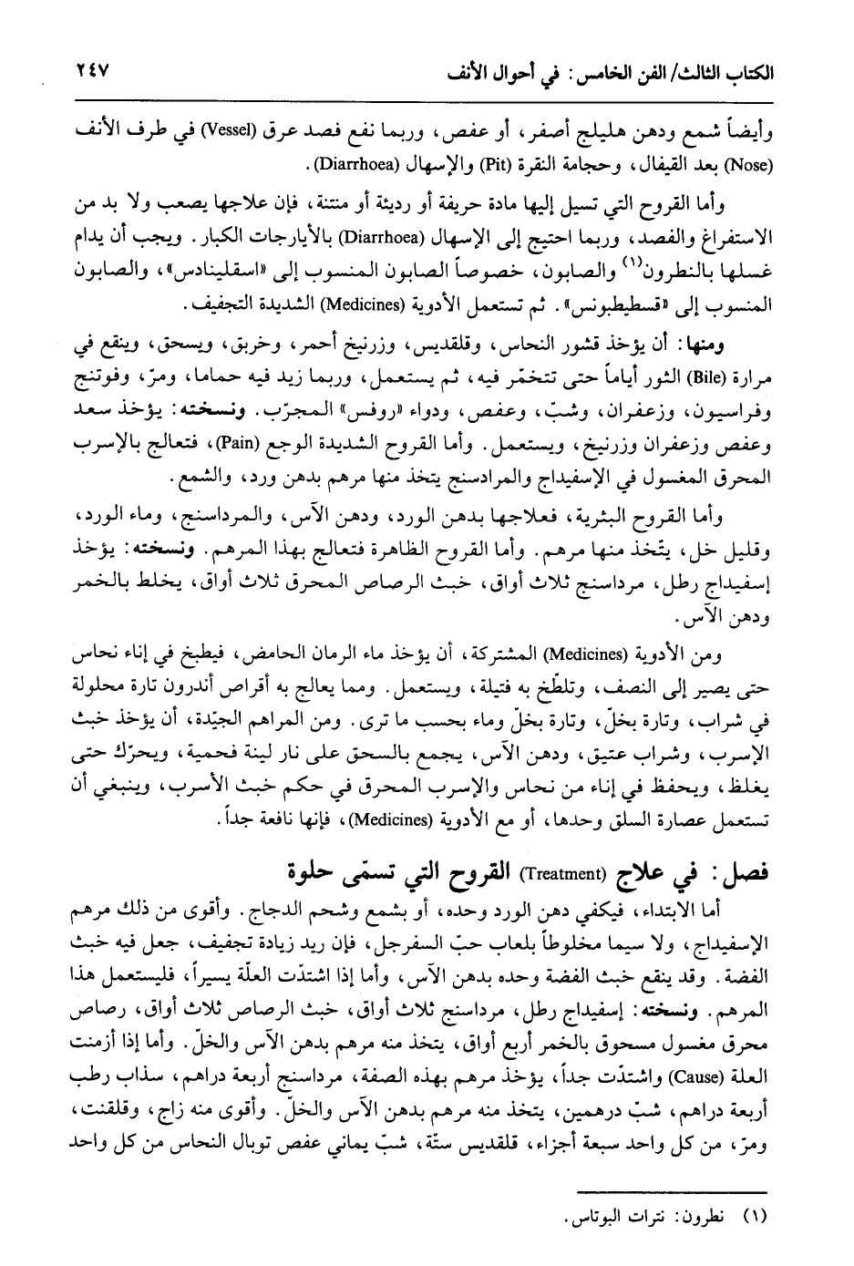 وَأَيْضًا شمع ودهن هليلج أصفر أَو عفص وَرُبمَا نفع فصد عرق فِي طرف الْأنف بعد القيفال وحجامة النقرة والإسهال. وَأما القروح الَّتِي تسيل إِلَيْهَا مَادَّة حريفة أَو رَدِيئَة أَو مُنْتِنَة فَإِن علاجها يصعب وَلَا بُد من الاستفراغ والفصد وَرُبمَا احْتِيجَ إِلَى الإسهال بالأيارجات الْكِبَار. وَيجب أَن يدام غسلهَا بالنطرون والصابون خُصُوصا الصابون الْمَنْسُوب إِلَى اسقلينادس والصابون الْمَنْسُوب إِلَى قسطيطبونس. ثمَّ تسْتَعْمل الْأَدْوِيَة الشَّدِيدَة التجفيف. وَمِنْهَا: أَن يُؤْخَذ قشور النّحاس وقلقديس وزرنيخ أَحْمَر وخربق ويسحق وينقع فِي مرَارَة الثور أَيَّامًا حَتَّى تتخمّر فِيهِ ثمَّ يسْتَعْمل وَرُبمَا زيد فِيهِ حَماما وَمر وفوتنج وفراسيون وزعفران وشب وعفص ودواء روفس المجرب. ونسخته: يُؤْخَذ سعد وعفص وزعفران وزرنيخ وَيسْتَعْمل. وَأما القروح الشَّدِيدَة الوجع فتعالج بالإسرب المحرق المغسول فِي الإسفيداج والمرادسنج يتَّخذ مِنْهَا مرهم بدهن ورد والشمع. وَأما القروح البثرية فعلاجها بدهن الْورْد ودهن الآس والمرداسنج وَمَاء الْورْد وَقَلِيل خل يتَّخذ مِنْهَا مرهم. وَأما القروح الظَّاهِرَة فتعالج بِهَذَا المرهم. ونسخته: يُؤْخَذ إسفيداج رَطْل مرداسنج ثَلَاث أَوَاقٍ خبث الرصاص المحرق ثَلَاث أَوَاقٍ يخلط بِالْخمرِ ودهن الآس. وَمن الْأَدْوِيَة الْمُشْتَركَة أَن يُؤْخَذ مَاء الرُّمَّان الحامض فيطبخ فِي إِنَاء نُحَاس حَتَّى يصير إِلَى النّصْف ويلطخ بِهِ فَتِيلَة وَيسْتَعْمل. وَمِمَّا يعالج بِهِ أَقْرَاص أندرون تَارَة محلولة فِي شراب وَتارَة بخل وَتارَة بخل وَمَاء بِحَسب مَا ترى. وَمن المراهم الجيّدة أَن يُؤْخَذ خبث الأسرب وشراب عَتيق ودهن الآس يجمع بالسحق على نَار لينَة فحمية ويحرّك حَتَّى يغلظ ويحفظ فِي إِنَاء من نُحَاس والإسرب المحرق فِي حكم خبث الأسرب وَيَنْبَغِي أَن تسْتَعْمل عصارة السلق وَحدهَا أَو مَعَ الْأَدْوِيَة فَإِنَّهَا نافعة جدا. فصل فِي علاج القروح الَّتِي تسمّى حلوة أما الِابْتِدَاء فَيَكْفِي دهن الْورْد وَحده أَو بشمع وشحم الدَّجَاج. وَأقوى من ذَلِك مرهم الاسفيداج وَلَا سِيمَا مخلوطاً بلعاب حب السفرجل فَإِن ريد زِيَادَة تجفيف جعل فِيهِ خبث الْفضة. وَقد ينقع خبث الْفضة وَحده بدهن الآس وَأما إِذا اشتدّت العلّة يَسِيرا فليستعمل هَذَا المرهم. ونسخته: إسفيداج رَطْل مرداسنج ثَلَاث أَوَاقٍ خبث الرصاص ثَلَاث أَوَاقٍ رصاص محرق مغسول مسحوقاً بِالْخمرِ أَربع أراق يتَّخذ مِنْهُ مرهم بدهن الآس والخل. وَأما إِذا أزمنت الْعلَّة واشتدّت جدا يُؤْخَذ مرهم بِهَذِهِ الصّفة مرداسنج أَرْبَعَة دَرَاهِم سذاب رطب أَرْبَعَة دَرَاهِم شبّ دِرْهَمَيْنِ يتَّخذ مِنْهُ مرهم بدهن الآس والخلّ. وَأقوى مِنْهُ زاج وقلقنت وَمر من كل وَاحِد سَبْعَة أَجزَاء قلقديس ستّة شبّ يماني عفص توبال النّحاس من كل وَاحِد