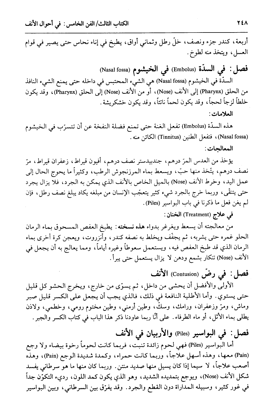 أَرْبَعَة كندر جُزْء وَنصف خلّ رَطْل وثمان أَوَاقٍ يطْبخ فِي إِنَاء نُحَاس حَتَّى يصير فِي قوام الْعَسَل ويتخذ مِنْهُ لطوخ. فصل فِي السدة فِي الخيشوم السدة فِي الخيشوم هِيَ الشَّيْء المحتبس فِي دَاخله حَتَّى يمْنَع الشَّيْء النَّافِذ من الْحلق إِلَى الْأنف أَو من الْأنف إِلَى الْحلق وَقد يكون خلطاً لزجا لحجاً وَقد يكون لَحْمًا ناتئاً وَقد يكون خشكريشة. العلامات: هَذِه السدّة تفعل الغنة حَتَّى تمنع فضلَة النفخة عَن أَن تتسرّب فِي الخيشوم فتفعل الطنين الْكَائِن مِنْهُ. المعالجات: يُؤْخَذ من العدس المر دِرْهَم جندبيدستر نصف دِرْهَم أفيون قِيرَاط زعفران قِيرَاط مر نصف دِرْهَم يتّخذ مِنْهَا حب ويسعط بِمَاء المرزنجوش الرطب وَكَثِيرًا مَا يحوج الْحَال إِلَى عمل الْيَد وخرط الْأنف بالميل الْخَاص بالأنف الَّذِي يُمكن بِهِ الجرد فَلَا يزَال يجرد حَتَّى يتنقّى وَرُبمَا خرج بالجرد شَيْء كثير يتعجّب الْإِنْسَان من مبلغه يكَاد يبلغ نصف رَطْل فَإِن لم يغن فعل مَا ذكرنَا فِي بَاب البواسير. فِي علاج الخنان: من معالجته أَن يسعط ويغرغر بدواء هَذِه نسخته: يطْبخ العفص المسحوق بِمَاء الرُّمَّان الحلو غمره حَتَّى يشربه ثمَّ يجفّف ويخلط بِهِ نصفه كندر وأنزروت ويعجن كرة أُخْرَى بِمَاء الرُّمَّان الَّذِي قد طبخ العفص فِيهِ وَيسْتَعْمل سعوطاً وَغَيره أَيَّامًا وَمِمَّا يعالج بِهِ أَن يَجْعَل فِي الْأنف تنكار بشمع ودهن لَا يزَال يسْتَعْمل حَتَّى يبرأ. فصل فِي رضّ الْأنف الأولى وَالْأَفْضَل أَن يحشى من دَاخل ثمَّ يسوّى من خَارج وَيخرج الحشو كل قَلِيل حَتَّى يَسْتَوِي. وَأما الأطلية النافعة فِي ذَلِك فَالَّذِي يجب أَن يَجْعَل على الْكسر قَلِيلا صَبر وماش مرّ وزعفران ورامك وسكّ وطين أرمني وطين مختوم رومي وخطمي ولاذن يطلى بِمَاء الأثل أَو مَاء الطرفاء. على أَنا رُبمَا عاودنا ذكر هَذَا الْبَاب فِي كتاب الْكسر والجبر. فصل فِي البواسير والأربيان فِي الْأنف أما البواسير فَهِيَ لُحُوم زَائِدَة تنْبت فَرُبمَا كَانَت لحوماً رخوة بَيْضَاء وَلَا وجع مَعهَا وَهَذِه أسهل علاجاً وَرُبمَا كَانَت حَمْرَاء وكمدة شَدِيدَة الوجع وَهَذِه أصعب علاجاً لَا سِيمَا إِذا كَانَ يسيل مِنْهَا صديد منتن. وَرُبمَا كَانَ مِنْهَا مَا هُوَ سرطاني يفْسد شكل الْأنف ويوجع بتمديده الشَّديد وَهُوَ الَّذِي يكون كمد اللَّوْن رَدِيء التكوّن جدا فِي غور كثير وسبيله المداراة دون الْقطع والجرد. وَقد يفرق بَين السرطاني وَبَين البواسير