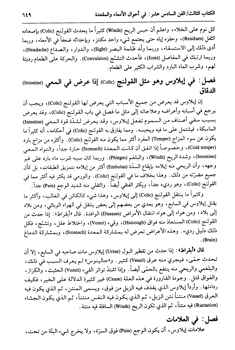 وَهُوَ مثل القولنج إِذا عرض فِي المعي الدقاق: إِن إيلاوس قد يعرض من جَمِيع الْأَسْبَاب الَّتِي يعرض لَهَا القولنج وَيجب أَن يرجع فِي أَسبَابه وأعرأضه وعلاجاته إِلَى مثل مَا فصل فِي بَاب القولنج وَقد يعرض بِسَبَب سقِِي أَصْنَاف من السمُوم تفعل إيلاوس وَقد يعرض لشدَّة قُوَّة المعي الماسكة فيشتمل على مَا فِيهِ ويحبسه. وَمِمَّا يُفَارق بِهِ القولنج فِي أَحْكَامه أَنه كثيرا مَا يكون عَن سوء المزاج الْمُفْرد أَكثر مِمَّا يكون مِنْهُ القولنج. وَأَكْثَره من مزاج بَارِد وخصوصاً إِذا اتّفق أَن كَانَت الْمعدة حارة جدا والتواء المعي وَشدَّة الرّيح والبلغم. وَرُبمَا كَانَ سَببه شرب مَاء بَارِد على غير وَجهه وَأَن الريحي مِنْهُ إيلامه بإيقاع السدة أَكثر من إيلامه بتمزيق الطَّبَقَات بل كَأَن جَمِيع مضرّته من ذَلِك. وَهَذَا بِخِلَاف مَا فِي القولنج. والورمي قد يكثر فِيهِ أَكثر مِمَّا فِي القولنج وَهُوَ رَدِيء جدا وَيكثر الفتقي أَيْضا. والثفلي مِنْهُ شَدِيد الوجع جدا. وَكَثِيرًا مَا ينْتَقل القولنج إِلَى إيلاوس وَهَذَا شَيْء كالكائن فِي الْغَالِب وَأكْثر مَا ينْتَقل إيلاوس فِي السَّابِع وَهُوَ يعدي من بَعضهم إِلَى بعض ينْتَقل فِي الْهَوَاء الوبائي وَمن بِلَاد إِلَى بِلَاد وَمن هَوَاء إِلَى هَوَاء انْتِقَال الْأَمْرَاض الوافدة. قَالَ أبقراط: إِذا حدث من القولنج المستعاد مِنْهُ فوَاق وقيء واختلاط عقل وتشتج فَكل ذَلِك دَلِيل رَدِيء. وَهَذِه الْأَعْرَاض تعرض لَهُ بمشاركة الْمعدة وبمشاركة الدِّمَاغ. قَالَ أبقراط: إِذا حدث من تقطير الْبَوْل إيلاوس مَاتَ صَاحبه فِي السَّابِع إِلَّا أَن يحدث حمى فَيجْرِي مِنْهُ عرق كثير. وجالينوس لم يعرف السَّبَب فِي ذَلِك والبلغمي والريحي مِنْهُ ينْتَفع بالحمى أَيْضا. وَإِذا اشتدّ تَوَاتر الْقَيْء الحثيث والكزاز والفواق قتل. وجودة القارورة فِي هَذِه الْعلَّة غير كَثِيرَة الدّلَالَة على الْخَيْر فَكيف رداءتها. وأردأ إيلاوس الَّذِي يقذف فِيهِ الزبل من فَوق وَيُسمى المنتن ثمَّ الَّذِي يكون فِيهِ الْعرق منتناً نَتن الزبل ثمَّ الَّذِي يكون فِيهِ النَّفس منتناً ثمَّ الَّذِي يكون الجشاء فِيهِ منتناً ثمَّ الَّذِي تكون الرّيح السافلة فِيهِ مُنْتِنَة. فصل فِي العلامات: عَلَامَات إيلاوس أَن يكون الوجع فَوق السُّرَّة وَلَا يخرج شَيْء الْبَتَّةَ من تَحت