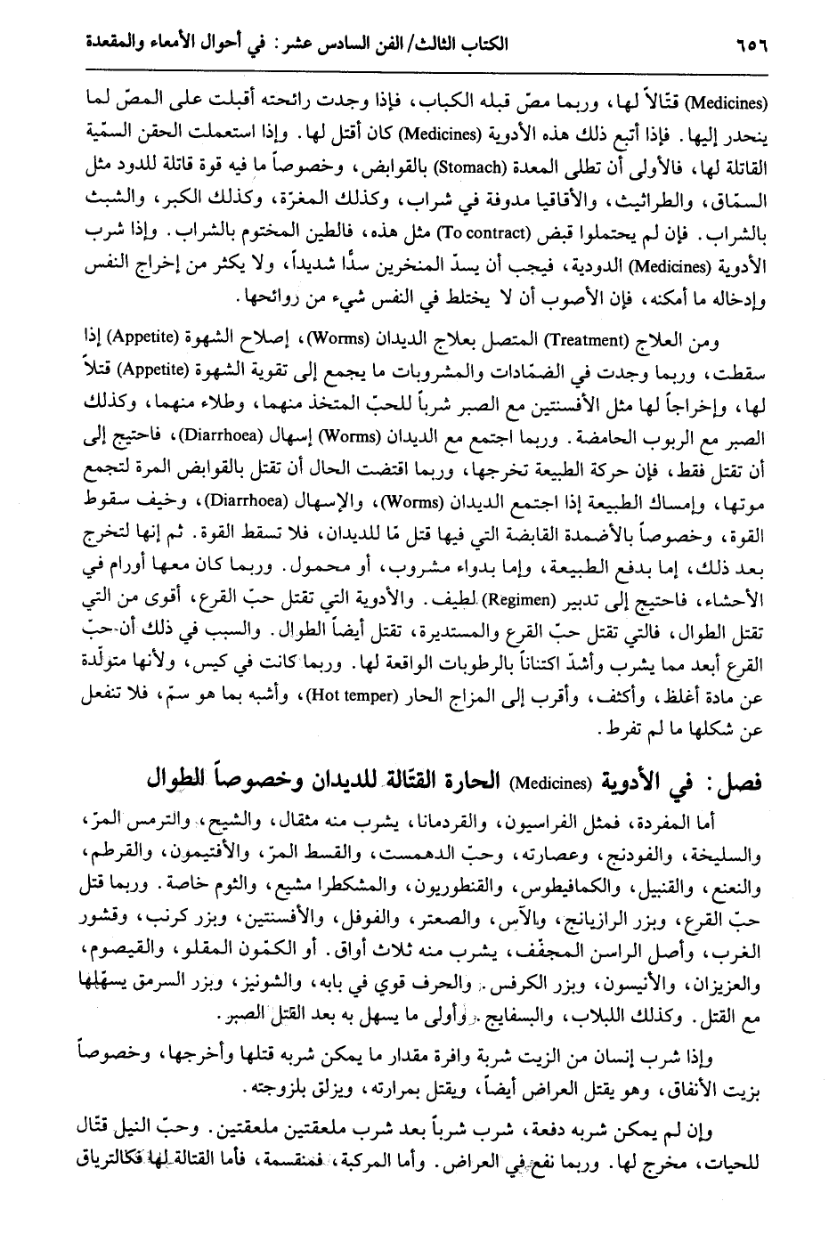 قتالاً لَهَا وَرُبمَا مص قبله الكباب فَإِذا وجدت رَائِحَته أَقبلت على المص لما ينحدر إِلَيْهَا. فَإِذا اتبع ذَلِك هَذِه الْأَدْوِيَة كَانَ أقتل لَهَا. وَإِذا اسْتعْملت الحقن السمّية القاتلة لَهَا فَالْأولى أَن تطلى الْمعد ة بالقوابض وخصوصاً مَا فِيهِ قُوَّة قاتلة للدود مثل السمّاق والطراثيث والأقاقيا مدوفة فِي شراب وَكَذَلِكَ المغرّة وَكَذَلِكَ الْكبر والشبث بِالشرابِ فَإِن لم يحتملوا قبض مثل هَذِه فالطين الْمَخْتُوم بِالشرابِ. . وَإِذا شرب الْأَدْوِيَة الدودية فَيجب أَن يسدّ المنخرين سدُّا شَدِيدا وَلَا يكثر من إِخْرَاج النَّفس وإدخاله مَا أمكنه فَإِن الأصوب أَن لَا يخْتَلط فِي النَّفس شَيْء من روائحها. وَمن العلاج الْمُتَّصِل بعلاج الديدان إصْلَاح الشَّهْوَة إِذا سَقَطت وَرُبمَا وجدت فِي الضمّادات والمشروبات مَا يجمع إِلَى تَقْوِيَة الشَّهْوَة قتلا لَهَا وإخراجاً لَهَا مثل الأفسنتين مَعَ الصَّبْر شرباً للحب الْمُتَّخذ مِنْهُمَا وطلاء مِنْهُمَا وَكَذَلِكَ الصَّبْر مَعَ الربوب الحامضة. وَرُبمَا اجْتمع مَعَ الديدان إسهال فاحتيج إِلَى أَن تقتل فَقَط فَإِن حَرَكَة الطبيعة تخرجها وَرُبمَا اقْتَضَت الْحَال أَن تقتل بالقوابض الْمرة لِتجمع مَوتهَا وإمساك الطبيعة إِذا اجْتمع الديدان والإسهال وَخيف سُقُوط الْقُوَّة وخصوصاً بالأضمدة القابضة الَّتِي فِيهَا قتل للديدان فَلَا تسْقط الْقُوَّة. ثمَّ إِنَّهَا لتخرج بعد ذَلِك إِمَّا بِدفع الطبيعة إِمَّا بدواء مشروب أَو مَحْمُول. وَرُبمَا كَانَ مَعهَا أورام فِي الأحشاء فاحتيج إِلَى تَدْبِير لطيف. والأدوية الَّتِي تقتل حب القرع أقوى من الَّتِي تقتل الطوَال. فالتي تقتل حب القرع والمستديرة تقتل أيضأ الطوَال. وَالسَّبَب فِي ذَلِك أَن حب القرع أبعد مِمَّا يشرب وَأَشد اكتناناً بالرطوبات الْوَاقِعَة لَهَا. وَرُبمَا كَانَت فِي كيس وَلِأَنَّهَا متولده عَن مَادَّة أغْلظ وأكثف وَأقرب إِلَى المزاج الْحَار وأشبه بِمَا هُوَ سمّ فَلَا تنفعل عَن شكلها مَا لم تفرط. فصل فِي الْأَدْوِيَة الحارة القتالة للديدان وخصوصاً الطوَال أما المفردة فَمثل الفراسيون والقردمانا يشرب مِنْهُ مِثْقَال والشيح والترمس المر والسليخة والفودنج وعصارته وَحب الدهمست والقسط المر والأفتيمون والقرطم والنعنع والقنبيل والكمافيطوس والقنطوريون والمشكطرا مشيع والثوم خَاصَّة وَرُبمَا قتل حبّ القرع وبزر الرازيانج والآس والصعتر والفوفل والأفسنتين وبزر كرنب وقشور الغربَ وأصل الراسن المجفف يشرب مِنْهُ ثَلَاث أَوَاقٍ. أَو الكمون المقلو والقيصوم والعزيزن والأنيسون وبزر الكرفس. والحرف قوي فِي بَابه والشونيز وبزر السرمق يسهلها مَعَ الْقَتْل. وَكَذَلِكَ اللبلاب والبسفايج. وَأولى مَا يسهل بِهِ بعد الْقَتْل الصَّبْر. وَإِذا شرب إِنْسَان من الزَّيْت شربة وافرة مِقْدَار مَا يُمكن شربه قَتلهَا وأخرجها وخصوصاً بِزَيْت الأنفاق وَهُوَ يقتل العراض أَيْضا وَيقتل بمرارته ويزلق بلزوجته. إِن لم يُمكن شربه دفْعَة شرب شرباً بعد شرب ملعقتين ملعقتين. وَحب النّيل قتّال للحميات مخرج لَهَا. وَرُبمَا نفع فِي العراض. وَأما المركبة فمنقسمة فَأَما القتالة لَهَا فكالترياق
