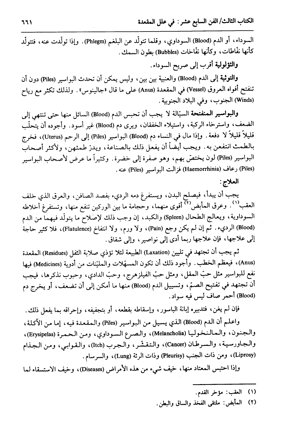 السَّوْدَاء أَو الدَّم السوداوي وقلما تتولد عَن البلغم. وَإِذا تولّدت عَنهُ فتتولد كَأَنَّهَا نفّاطات وَكَأَنَّهَا نفّاخات بطُون السّمك. والثؤلولية أقرب إِلَى صَرِيح السَّوْدَاء. والتوثية إِلَى الدَّم والعنبية بَين بَين وَلَيْسَ يُمكن أَن تحدث البواسير دون أَن تنفتح أَفْوَاه الْعُرُوق فِي المقعدة على مَا قَالَ جالينوس وَلذَلِك تكْثر مَعَ ريَاح الْجنُوب وَفِي الْبِلَاد الجنوبية. والبواسير المنفتحة السيالة لَا يجب أَن تحبس الدَّم السَّائِل مِنْهَا حَتَّى تَنْتَهِي إِلَى الضعْف واسترخاء الرّكْبَة واستيلاء الخفقان وَيرى دم غير أسود. وأجوده أَن يتحلّب قَلِيلا قَلِيلا لَا دفْعَة. وَإِذا مَال فِي النِّسَاء دم البواسير إِلَى الرَّحِم فَخرج بالطمث انتفعن بِهِ. وَيجب أَيْضا أَن يفعل ذَلِك بالصناعة يحز طمثهن ولأكثر أَصْحَاب البواسير لون يختصّ بهم وَهُوَ صفرَة إِلَى خضرَة. وَكَثِيرًا مَا عرض لأَصْحَاب البواسير رُعَاف فَزَالَتْ البواسير عَنهُ. العلاج: يجب أَن يبْدَأ فيصلح الْبدن ويستفرغ دَمه الرَّدِيء بفصد الصْافن والعرق الَّذِي خلف الْعقب. وعرق المأبض أقوى مِنْهُمَا وحجامة مَا بَين الْوَرِكَيْنِ تَنْفَع مِنْهَا وتستفرغ أخلاطه السوداوية ويعالج الطحال والكبد إِن وَجب ذَلِك لإِصْلَاح مَا يتولّد فيهمَا من الدَّم الرَّدِيء. ثمَّ إِن لم يكن وجع وَلَا ورم وَلَا انتفاخ فَلَا كثير حَاجَة إِلَى علاجها فَإِن علاجها رُبمَا أدّى إِلَى نواصير وَإِلَى شقَاق. ثمَّ يجب أَن تجتهد فِي تليين الطبيعة لِئَلَّا تُؤدِّي صلابة الثفل المقعدة فيعظم الْخطب. وأجود ذَلِك أَن تكون المسهّلات والمليّنات من أدوية فِيهَا نفع للبواسير مثل حب الْمثل وَمثل حب ّالفيلزهرج وَحب الدادي وحبوب نذكرها فَيجب أَن تجتهد فِي تفتيح الصمّ وتسييل الدَّم مِنْهَا مَا أمكن إِلَى أَن تضعف أَو يخرج دم أَحْمَر صَاف لَيْسَ فِيهِ سَواد. فَإِن لم يغن فتدبيره إبانة الْبَاسُور وإسقاطه بِقطعِهِ أَو بتجفيفه وإحراقه بِمَا يفعل ذَلِك. وَاعْلَم أَن الدَّم الَّذِي يسيل من البواسير والمقعدة فِيهِ إِمَّا من الآكلة وَالْجُنُون والمالنخوليا والصرع السوداوي وَمن الْحمرَة والجاورسية والسرطان والتقشر والجرب والقوابي وَمن الجذام وَمن ذَات الْجنب وَذَات الرئة والسرسام. وَإِذا احْتبسَ الْمُعْتَاد مِنْهَا خيف شيئ من هَذِه الْأَمْرَاض وَخيف الاسْتِسْقَاء لما