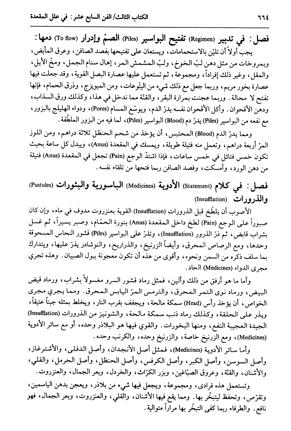فصل فِي تَدْبِير تفتيح البواسير الصمم وإدرار دَمهَا يجب أَولا أَن تلين بالاستحمامات ويستعان على تفتيحها بفصد الصَّافِن وعرق المأبض وبمروخات من مثل دهن لبّ الخوخ ولمث المشمش المر إهال سَنَام الْجمل ومخ الأيل والمقل وَغير ذَلِك أفراداً ومجموعة ثمَّ يسْتَعْمل عَلَيْهَا عصارة البصل القوية وَقد جعل فِيهَا عصارة بخور مَرْيَم وَرُبمَا جعل مَعَ ذَلِك شَيْء من اليتوعات وَمن الميويزج وذرق الْحمام فَإِنَّهَا تفتح لَا محَالة. وَرُبمَا عجنت بمرارة الْبَقر والقنة مِمَّا ندخل فِي هَذَا وَكَذَلِكَ ورق السذاب ودهن الاقحوان. وَأكل الاقحوان نَفسه يدر الدَّم ويوسع المسام ودواء الهليلج بالبزور مَعَ نَفعه من البواسير يدر دم البواسير لما فِيهِ من البزور الملطفة. وَمِمَّا يدرالدم المحتبس أَن يُؤْخَذ من شَحم الحنظل ثَلَاثَة دَرَاهِم وَمن اللوز المر أَرْبَعَة دَرَاهِم وَيعْمل مِنْهُ فَتِيلَة طَوِيلَة ويمسك فِي المقعدة ويبدل كل سَاعَة بِحَيْثُ تكون خمس فتائل فِي خمس سَاعَات فَإِذا اشْتَدَّ الوجع يَجْعَل فِي المقعدة فَتِيلَة من دهن الْورْد وَأَمْسَكت وفصد الصَّافِن فصل فِي كَلَام الْأَدْوِيَة الباسورية والبثورات والذرورات الأصوب أَن يلطخ قبل الذرورات القوية بعنزروت مدوف فِي مَاء وَإِن كَانَ صبوراً على الوجع لطخ دَاخل المقعدة بنورة الْحمام وصبر يَسِيرا ثمَّ غسل بشراب قَابض ثمَّ ذَر الذرور ويذر على البواسير قشور النّحاس المسحوقة وَحدهَا وَمَعَ الرصاص المحرق وَأَيْضًا الزرنيخ والذراريح والنوشادر يذر عَلَيْهَا ويتدارك بِمَا سلف ذكره من السّمن وَنَحْوه وَأقوى من هَذِه أَن تكون معجونة ببول الصّبيان. وَهَذِه تجْرِي مجْرى الدَّوَاء الحاد. وَأما مَا هُوَ أرْفق من ذَلِك وألين فَمثل رماد قشور السرو مغسولاَ بشراب ورماد قيض الْبيض ورماد نوى التَّمْر المحرق والترمس المر الْيَابِس المحرق. وَمِمَّا يجْرِي مجْرى الْخَواص أَن يُؤْخَذ رَأس سَمَكَة مالحة ويجفف بِقرب النَّار ويخلط بِمثلِهِ جبنا عتيقاً ويذر على الْحلقَة وَكَذَلِكَ رماد ذَنْب سَمَكَة مالحة والشونيز من الذرورات الجيدة العجيبة النَّفْع وَمِنْهَا البخورات. وَالْقَوِي فِيهَا هُوَ البلاذر وَحده أَو مَعَ سَائِر الْأَدْوِيَة ومح الزرنيخ خَاصَّة والزرنيخ وَحده والكرنب وَحده. وَأما سَائِر الْأَدْوِيَة فَمثل أصل الأنجدان وأصل الدفلى والأشترغاز وأصل السوسن وأصل الْكبر وأصل الكرفس وأصل الحنظل وأصل الحرمل والقلى والأشنان والقنة وعروق الصباغين وبزر الكراث والخردل وبعر الْجمال والعنزروت. وتستعمل هَذِه فُرَادَى ومجموعة وَيجْعَل فِيهَا شَيْء من بلاذر ويعجن بدهن الياسمين وتقرّص وَتحفظ ليتبخْر بهَا. وَمِمَّا يَقع فِيهَا الأشنان والقلي والعنزروت وبعر الْجمال فَهُوَ نَافِع. والطرفاء رُبمَا كفى التبخّر بِهِ مرَارًا مُتَوَالِيَة.