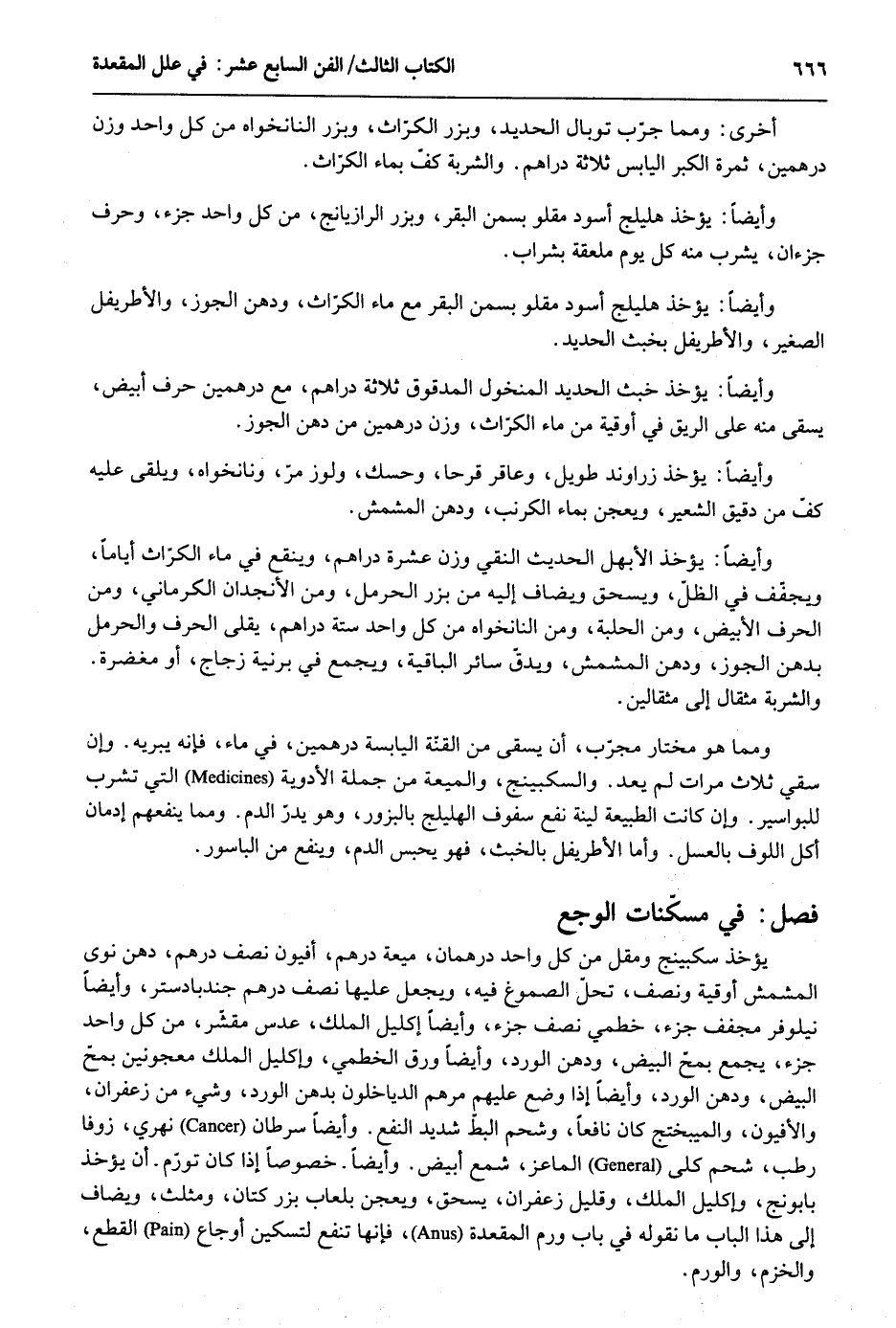 آخرى: وَمِمَّا جزب توبال الْحَدِيد وبزر الكزاث وبزر النانخواه من كل وَاحِد وزن دِرْهَمَيْنِ ثَمَرَة الْكبر الْيَابِس ثَلَاثَة دَرَاهِم. والشربة كف بِمَاء الكراث. وَأَيْضًا: يُؤْخَذ هليلج أسود مقلو بِسمن الْبَقر وبزر الرازيانج من كل وَاحِد جُزْء وحرف جزءان يشرب مِنْهُ كل يَوْم ملعقة بشراب. وَأَيْضًا: يُؤْخَذ هليلج أسود مقلو بِسمن الْبَقر مَعَ مَاء الكرّاث ودهن الْجَوْز والاطريفل الصَّغِير والاطريفل بخبث الْحَدِيد. وَأَيْضًا: يُؤْخَذ خبث الْحَدِيد المنخول المدقوق ثَلَاثَة دَرَاهِم مَعَ دِرْهَمَيْنِ حرف أَبيض يسقى منَّة على الرِّيق فِي أُوقِيَّة من مَاء الكراث وزن دِرْهَمَيْنِ من دهن الْجَوْز. وَأَيْضًا: يُؤْخَذ زراوند طَوِيل وعاقر قرحا وحسك ولوز مر ونانخواه ويلقى عَلَيْهِ كفّ من وَأَيْضًا: يُؤْخَذ الأبهل الحَدِيث النقي وزن عشرَة دَرَاهِم وينقع فِي مَاء الكراث أَيَّامًا ويجفف فِي الظل ويسحق ويضاف إِلَيْهِ من بزر الحرمل وَمن الأنجدان الْكرْمَانِي وَمن الْحَرْف الْأَبْيَض وَمن الحلبة وَمن النانخواه من كل وَاحِد سِتَّة دَرَاهِم يقلى الْحَرْف والحرمل بدهن الْجَوْز ودهن المشمش ويدق سَائِر الْبَاقِيَة وَيجمع فِي برنية زجاج أَو مغضرة. والشربة مِثْقَال إِلَى مثقالين. وَمِمَّا هُوَ مُخْتَار مجرّب أَن يسقى من القنّة الْيَابِسَة دِرْهَمَيْنِ فِي مَاء فَإِنَّهُ يبريه. وَإِن سقِِي ثَلَاث مَرَّات لم يعد. والسكبينج والميعة من جملَة الْأَدْوِيَة الَّتِي تشرب للبواسير. وَإِن كَانَت الطبيعة لينَة نفع سفوف الهليلج بالبزور وَهُوَ يدر الدَّم. وَمِمَّا يَنْفَعهُمْ إدمان أكل اللوف بالعسل. وَأما الاطريفل بالخبث فَهُوَ يحبس الدَّم وينفع من الْبَاسُور. فصل فِي مسكنات الوجع يُؤْخَذ سكبينج ومقل من كل وَاحِد دِرْهَمَانِ ميعة دِرْهَم أفيون نصف دِرْهَم دهن نوى المشمش أُوقِيَّة وَنصف تحل الصموغ فِيهِ وَيجْعَل عَلَيْهَا نصف دِرْهَم جندبادستر وَأَيْضًا نيلوفر مجفف جُزْء خطمي نصف جُزْء وَأَيْضًا إكليل الْملك عدس مقشّر من كل وَاحِد جُزْء يجمع بمحّ الْبيض ودهن الْورْد وَأَيْضًا ورق الخطمي وإكليل الْملك معجونين بمخ الْبيض ودهن الْورْد وَأَيْضًا إِذا وضع عَلَيْهِم مرهم الدياخلون بدهن الْورْد وَشَيْء من زعفران والأفيون والميبختج كَانَ نَافِعًا وشحم البطّ شَدِيد النَّفْع. وَأَيْضًا سرطان نهري زوفا رطب شَحم كلي الماعز شمع أَبيض. وَأَيْضًا خصوصاَ إِذا كَانَ تورم أَن يُؤْخَذ بابونج وإكليل الْملك وَقَلِيل زعفران يسحق ويعجن بلعاب بزر كتَّان ومثلث ويضاف إِلَى هَذَا الْبَاب مَا نقُوله فِي بَاب ورم المقعدهَ فَإِنَّهَا تَنْفَع لتسكين أوجاع الْقطع والخزم والورم.