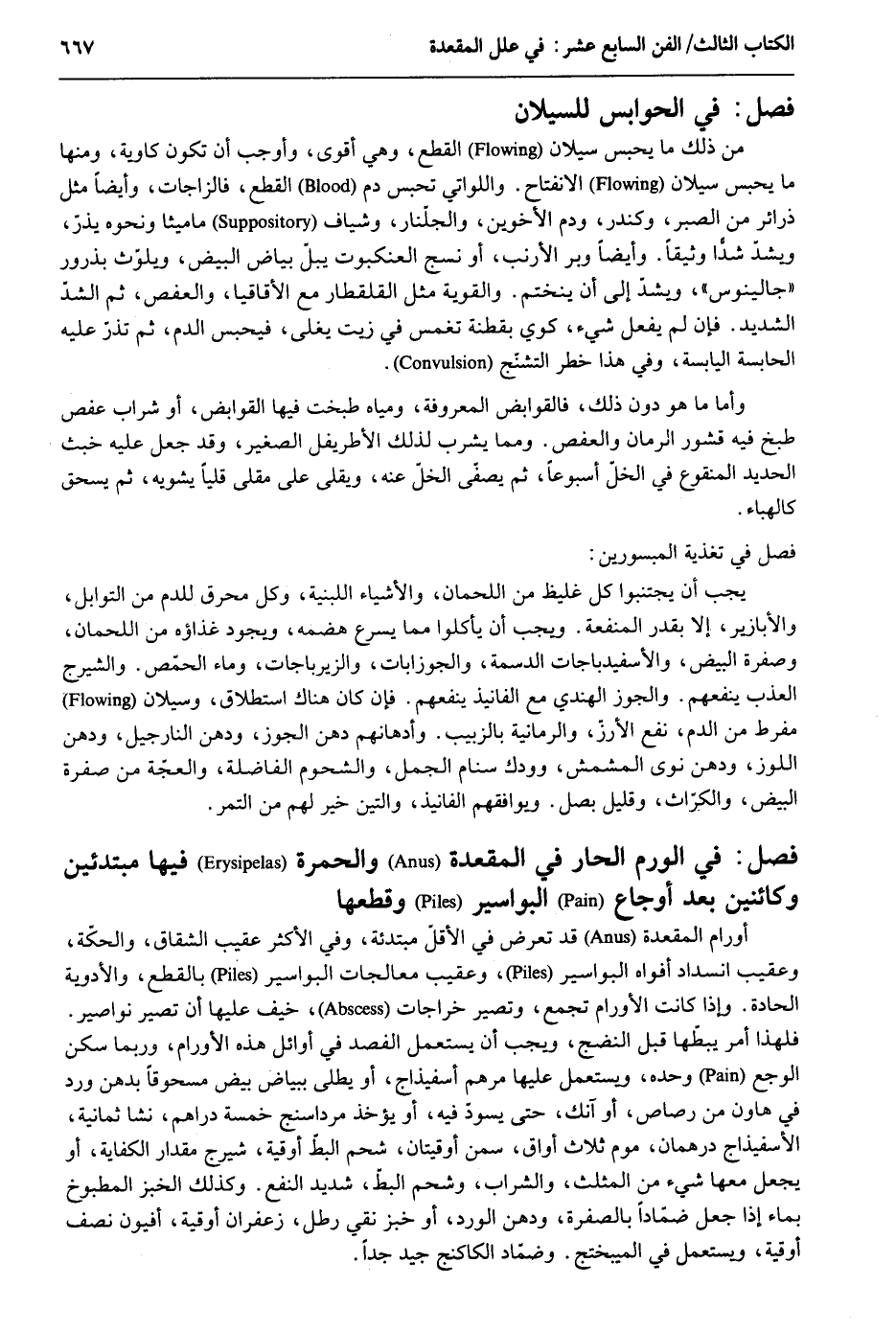 فصل فِي الحوابس للسيلان من ذَلِك مَا يحبس سيلان الْقطع وَهِي أقوى وَأوجب أَن تكون كاوية وَمِنْهَا مَا يحبس سيلان الانفتاح. واللواتي تحبس دم الْقطع فالزاجات وَأَيْضًا مثل ذرائر من الصَّبْر وكندر وَدم الْأَخَوَيْنِ والجلّنار وشياف ماميثا وَنَحْوه يذر ويشد شدُّا وثيقاً. وَأَيْضًا وبر الأرنب أَو نسج العنكبوت يبل بَيَاض الْبيض ويلوّث بذرور جالينوس ويشدّ إِلَى أَن ينختم. والقوية مثل القلقطار مَعَ الأقاقيا والعفص ثمَّ الشدّ الشَّديد. فَإِن لم يفعل شَيْء كوي بقطنة تغمس فِي زَيْت يغلى فَيحْبس الدَّم ثمَّ يذرّ عَلَيْهِ الحابسة الْيَابِسَة وَفِي هَذَا خطر التشنّج. وَأما مَا هُوَ دون ذَلِك فالقوابض الْمَعْرُوفَة ومياه طبخ فِيهَا القوابض أَو شراب عفص طبخ فِيهِ قشور الرُّمَّان والعفص. وَمِمَّا يشرب لذَلِك الأطريفل الصَّغِير وَقد جعل عَلَيْهِ خبث الْحَدِيد المنقوع فِي الخلّ أسبوعاً ثمَّ يصفّى الخلّ عَنهُ ويقلى على مقلى قلياً يشويه ثمَّ تسحق كالهباء. يجب أَن يجتنبوا كل غليظ من اللحمان والأشياء اللبنية وكل محرق للدم من التوابل والأبازير إِلَّا بِقدر الْمَنْفَعَة. وَيجب أَن يَأْكُلُوا مِمَّا يسْرع هضمه ويجود غذاؤه من اللحمان وصفرة الْبيض والآسفيدباجات الدسمة والجوزابات والزيرباجات وَمَاء الحمص. والشيرج العذب يَنْفَعهُمْ. والجوز الْهِنْدِيّ مَعَ الفانيذ يَنْفَعهُمْ. فَإِن كَانَ هُنَاكَ استطلاق وسيلان مفرط من الدَّم نفع الأرزّ والرمانية بالزبيب. وأدهانهم دهن الْجَوْز ودهن النارجيل ودهن اللوز ودهن نوى المشمش وودك سَنَام الْجمل والشحوم الفاضلة والعجة من صفرَة الْبيض والكراث وَقَلِيل بصل. ويوافقهم الفانيذ والتين خير لَهُم من التَّمْر. فصل فِي الورم الْحَار فِي المقعدة والحمرة فِيهَا مبتدئين وكائنين بعد أوجاع البواسير وقطعها أورام المقعدة قد تعرض فِي الْأَقَل مبتدئة وَفِي أَكثر عقيب الشقاق والحكّة وعقيب انسداد أَفْوَاه البواسير وعقيب معالجات البواسير بِالْقطعِ والأدوية الحادة. وَإِذا كَانَت الأورام تجمع وَتصير خراجات خيف عَلَيْهَا أَن تصير نواصير. فَلهَذَا أَمر ببطها قبل النضج وَيجب أَن يسْتَعْمل الفصد فِي أَوَائِل هَذِه الأورام وَرُبمَا سكن الوجع وَحده وَيسْتَعْمل عَلَيْهَا مرهم الآسفيذاج أَو يطلى ببياض بيض مسحوقاً بدهن ورد فِي هاون من رصاص أَو آنك حَتَّى يسود فِيهِ أَو يُؤْخَذ مرداسنج خَمْسَة دَرَاهِم نشا ثَمَانِيَة إسفيذاج دِرْهَمَانِ موم ثَلَاثَة أَوَاقٍ سمن أوقيتان شَحم البط أُوقِيَّة شيرج مِقْدَار الْكِفَايَة أَو يَجْعَل مَعهَا شَيْء من المثلث وَالشرَاب وشحم البط شَدِيد النَّفْع. وَكَذَلِكَ الْخبز الْمَطْبُوخ بِمَا إِذا جعل ضماداً بالصفرة ودهن الْورْد أَو خبز نقي رَطْل زعفران أُوقِيَّة أفيون نصف أُوقِيَّة وَيسْتَعْمل فِي الميبختج. وضماد الكاكنج جيد جدا.