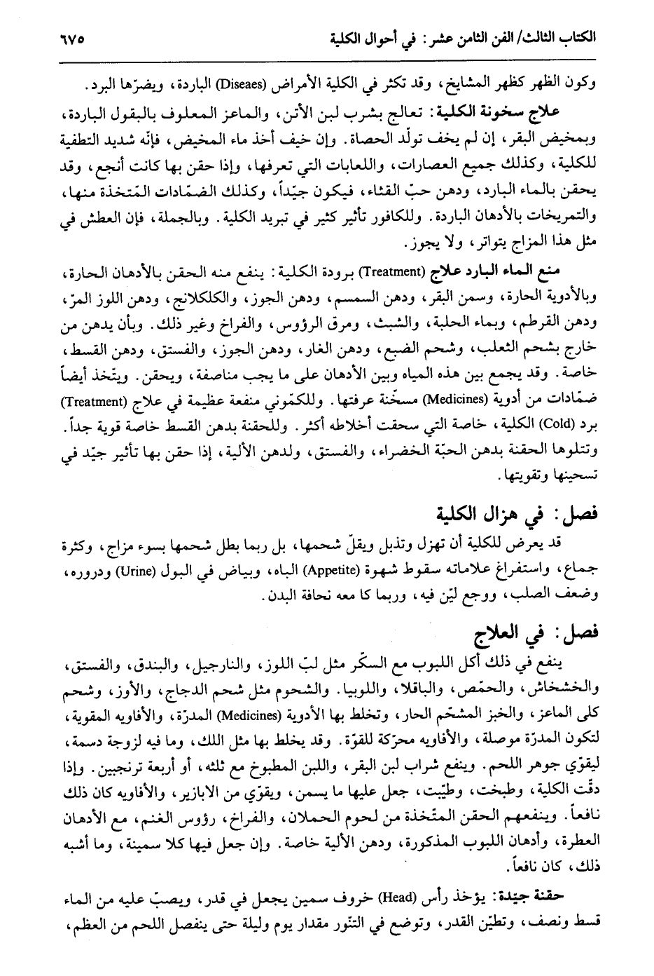 وَكَون الظّهْر كَظهر الْمَشَايِخ وَقد تكْثر فِي الْكُلية الْأَمْرَاض الْبَارِدَة ويضرها الْبرد. علاج سخونة الْكُلية: تعالج بِشرب لبن الأتن والماعز المعلوف بالبقول الْبَارِدَة وبمخيض الْبَقر إِن لم يخف تولد الْحَصَاة. وَإِن خيف أَخذ مَاء المخيض فَإِنَّهُ شَدِيد التطفية للكلية وَكَذَلِكَ جَمِيع العصارات واللعابات الَّتِي تعرفها. وَإِذا حقن بهَا كَانَت أنجع وَقد يحقن بِالْمَاءِ الْبَارِد ودهن حبّ القثاء فَيكون جيدا وَكَذَلِكَ الضمّادات المتخذة مِنْهَا والتمريخات بالأدهان الْبَارِدَة. وللكافور تَأْثِير كثير فِي تبريد الْكُلية. وَبِالْجُمْلَةِ فَإِن الْعَطش فِي مثل هَذَا المزاج يتواتر وَلَا يجوز. منع المَاء الْبَارِد علاج برودة الْكُلية: ينفع مِنْهُ الحقن بالأدهان الحارة وبالأدوية الحارة وَسمن الْبَقر ودهن السمسم ودهن الْجَوْز والكلكلانج ودهن اللوز المر ودهن القرطم وبماء الحلبة والشبث ومرق الرؤوس والفراخ وَغير ذَلِك. وَبِأَن يدهن من خَارج بشحم الثَّعْلَب وشحم الضبع ودهن الْغَار ودهن الْجَوْز والفستق ودهن الْقسْط خَاصَّة. وَقد يجمع بَين هَذِه الْمِيَاه وَبَين الأدهان على مَا يجب مُنَاصَفَة ويحقن. ويتخذ أَيْضا ضمادات من أدوية مسخّنة عرفتها. وللكموني مَنْفَعَة عَظِيمَة فِي علاج برد الْكُلية خَاصَّة الَّتِي سحقت أخلاطه أَكثر. وللحقنة بدهن الْقسْط خَاصَّة قَوِيَّة جدا. وتتلوها الحقنة بدهن الْحبَّة الخضراء والفستق ولدهن الألية إِذا حقن بهَا تَأْثِير جيد فِي تسخينها وتقويتها. فصل فِي هزال الْكُلية قد يعرض للكلية أَن تهزل وتذبل ويقل شحمها بل رُبمَا بَطل شحمها بِسوء مزاج وَكَثْرَة جماع واستفراغ علاماته سُقُوط شَهْوَة الباه وَبَيَاض فِي الْبَوْل ودروره وَضعف ووجع ليّن فِيهِ وَرُبمَا كَانَ مَعَه نحافة الْبدن. فصل فِي العلاج ينفع من ذَلِك أكل اللبوب مَعَ السكّر مثل لب اللوز والنارجيل والبندق والفستق والخشخاش والحمص والباقلا واللوبيا. والشحوم مثل شَحم الدَّجَاج والأوز وشحم كلى الماعز وَالْخبْز المشحم الحأر وتخلط بهَا الْأَدْوِيَة المدرة والأفاويه المقوية لتَكون المدرّة موصلة والأفاويه محركة للقوة. وَقد يخلط بهَا مثل اللك وَمَا فِيهِ لزوجة دسمة ليقؤي جَوْهَر اللَّحْم. وينفع شراب لبن الْبَقر وَاللَّبن الْمَطْبُوخ مَعَ ثلثه أَو أَرْبَعَة ترنجبين. وَإِذا دقَّتْ الْكُلية وطبخت وطيبت وَجعل عَلَيْهَا مَا يسمن وَيُقَوِّي من الأبازير والأفاويه كَانَ ذَلِك نَافِعًا. وينفعهم الحقن المتخذة من لُحُوم الحملان والفراخ ورؤوس الْغنم مَعَ الأدهان العطرة وأدهان اللبوب الْمَذْكُورَة ودهن الألية خَاصَّة. وَإِن جعل فِيهَا كلى سَمِينَة وَمَا أشبه ذَلِك كَانَ نَافِعًا. حقنة جَيِّدَة: يُؤْخَذ رَأس خروف سمين يَجْعَل فِي قدر ويصبّ عَلَيْهِ من المَاء قسط وَنصف وتطين الْقدر وتوضع فِي التَّنور مِقْدَار يَوْم وَلَيْلَة حَتَّى ينْفَصل اللَّحْم من الْعظم