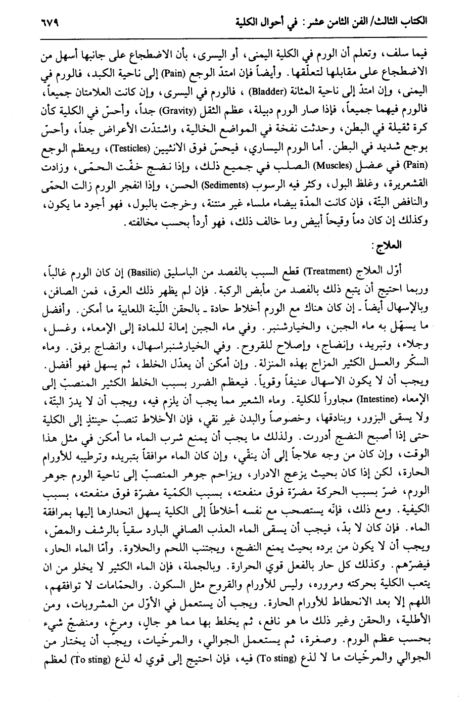 فِيمَا سلف وَتعلم أَن الورم فِي الْكُلية الْيُمْنَى أَو الْيُسْرَى بِأَن الِاضْطِجَاع على جَانبهَا أسهل من الِاضْطِجَاع على مقابلها لتعلقها. وَأَيْضًا فَإِن امْتَدَّ الوجع إِلَى نَاحيَة الكبد فالورم فِي الْيُمْنَى وَإِن امْتَدَّ إِلَى نَاحيَة المثانة فالورم فِي الْيُسْرَى وَإِن كَانَت العلامتان جَمِيعًا فالورم فيهمَا جَمِيعًا فَإِذا صَار الورم دبيلة عظم الثّقل جدا وأحسّ فِي الْكُلية كَأَن كرة ثَقيلَة فِي الْبَطن وَحدثت نفخة فِي الْمَوَاضِع الخالية واشتدت الْأَعْرَاض جدا وأحس بوجع شَدِيد فِي الْبَطن. أما الورم اليساري فيحس فَوق الْأُنْثَيَيْنِ ويعظم الوجع فِي عضل الصلب فِي جَمِيع ذَلِك. وَإِذا نضج خفت الْحمى وزادت القشعريرة وَغلظ الْبَوْل وَكثر فِيهِ الرسوب الْحسن. وَإِذا انفجر الورم زَالَت الْحمى والنافض الْبَتَّةَ فَإِن كَانَت الْمدَّة بَيْضَاء ملساء غير مُنْتِنَة وَخرجت بالبول فَهُوَ أَجود مَا يكون وَكَذَلِكَ إِن كَانَ دَمًا وقيحاً أَبيض وَمَا خَالف ذَلِك فَهُوَ أردأ بِحَسب مُخَالفَته. العلاج: أول العلاج قطع السَّبَب بالفصد مَن الباسليق إِن كَانَ الورم غَالِبا وَرُبمَا احْتِيجَ أَن يتبع ذَلِك بالفصد من مأبض الرّكْبَة. فَإِن لم يظْهر ذَلِك الْعرق فَمن الصَّافِن وبالإسهال أيضَاً إِن كَانَ هُنَاكَ مَعَ الورم أخلاط حادة بالحقن اللينة اللعابية مَا أمكن. وَأفضل مَا يسهل بِهِ مَاء الْجُبْن والخيارشنبر. وَفِي مَاء الْجُبْن إمالة للمادة إِلَى الأمعإء وَغسل وجلاء وتبريد وإنضاج وَإِصْلَاح للقروح. وَفِي الخيارشنبر إسهال وإنضاج بِرِفْق. وَمَاء السكر وَالْعَسَل الْكثير المزاج بِهَذِهِ الْمنزلَة. وَإِن أمكن أَن يعدل الْخَلْط ثمَّ يسهل فَهُوَ أفضل. وَيجب أَن لَا يكون الإسهال عنيفاً وقوياً فيعظم الضَّرَر بِسَبَب الْخَلْط الْكثير المنصب إِلَى الأمعاء مجاوراً للكلية. وَمَاء الشّعير مِمَّا يجب أَن يلْزم فِيهِ وَيجب أَن لَا يدر الْبَتَّةَ وَلَا يسقى البزور وبنادقها وخصوصاً وَالْبدن غير نقي فَإِن الأخلاط تنصب حِينَئِذٍ إِلَى الْكُلية حَتَّى إِذا أصبح النضج أدررت. وَلذَلِك مَا يجب أَن يمْنَع شرب المَاء مَا أمكن فِي مثل هَذَا الْوَقْت وَإِن كَانَ من وَجه علاجاً إِلَى أَن ينقي وَإِن كَانَ المَاء مُوَافقا بتبريده وترطيبه للأورام الحارة لَكِن إِذا كَانَ بِحَيْثُ يزعج الإدرار ويزاحم جَوْهَر المنصب إِلَى نَاحيَة الورم جَوْهَر الورم ضرّ بِسَبَب الْحَرَكَة مضرَّة فَوق منفعَته بِسَبَب الكمية مضرَّة فَوق منفعَته بِسَبَب الْكَيْفِيَّة. وَمَعَ ذَلِك فَإِنَّهُ يستصحب مَعَ نَفسه أخلاطاً إِلَى الْكُلية يسهل انحدارها إِلَيْهَا بمرافقة المَاء. فَإِن كَانَ لَا بُد فَيجب أَن يسقى المَاء العذب الصافي الْبَارِد سقيا بالرشف والمصّ وَيجب أَن لَا يكون من برده بِحَيْثُ يمْنَع النضج ويجتنب اللَّحْم والحلاوة. وَأما المَاء الْحَار فيضرهم. وَكَذَلِكَ كل حَار بِالْفِعْلِ قوي الْحَرَارَة. وَبِالْجُمْلَةِ فَإِن المَاء الْكثير لَا يَخْلُو من أَن يتعب الْكُلية بحركته ومروره وَلَيْسَ للأورام والقروح مثل السّكُون. والحمامات لَا توافقهم اللَّهُمَّ إِلَّا بعد الانحطاط للأورام الحا رة. وَيجب أَن يسْتَعْمل فِي الأول من المشروبات وَمن الأطلية والحقن وَغير ذَلِك مَا هُوَ نَافِع ثمَّ يخلط بهَا مِمَّا هُوَ جال ومرخ ومنضج شَيْء بِحَسب عظم الورم وصغره ثمَّ يسْتَعْمل الجوالي والمرخيات وَيجب أَن يخْتَار من الجوالي والمرخيات مَا لَا لذع فِيهِ فَإِن احْتِيجَ إِلَى قوي لَهُ لذع لعظم