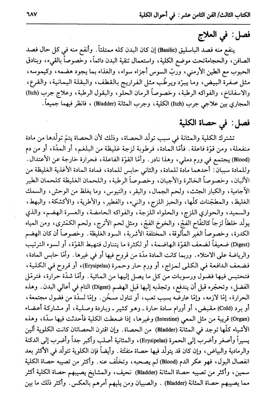 فصل فِي العلاج ينفع مِنْهُ فصد الباسليق إِن كَانَ الْبدن كُله ممتلئاً. وأتفع مِنْهُ فِي كل حَال فصد الصَّافِن والحجامة تَحت مَوضِع الْكُلية وَاسْتِعْمَال تنقية الْبدن دَائِما وخْصوصاً بالقيء وبنادق الْحُبُوب مَعَ الطين الأرمني وَرب السوس أَجزَاء سَوَاء والغذاء بِمَا يجود هضمه وكيموسه مثل صفرَة الْبيض وَمَا يبرد ويرطب مثل الفراريج بالقطف والبقلة اليمانية والقرع والآسفاناخ والفوكه الرّطبَة وخصوصاً الرُّمَّان الحلو والبقول الرّطبَة وعلاج جرب المجاري بَين علاجي جرب المجاري بَين علاجي جرب الْكُلية وجرب المثانة فَانْظُر فيهمَا جَمِيعًا. فصل فِي حَصَاة الْكُلية تشترك الْكُلية والمثانة فِي سَبَب تولد الْحَصَاة وَذَلِكَ لِأَن الْحَصَاة يتم تولدها عَن مَادَّة منفعلة وَمن قُوَّة فاعلة. فَأَما الْمَادَّة فرطوبة لزجة غَلِيظَة من البلغم أَو الْمدَّة أَو من دم يجْتَمع فِي ورم دملي وَهَذَا نَادِر. وَأما الْقُوَّة الفاعلة فحرارة خَارِجَة عَن الِاعْتِدَال. وللمادة سببان: أَحدهمَا مَادَّة للمادة وَالثَّانِي حَابِس الْمَادَّة فمادة الْمَادَّة الأغذية الغليظة من الألبان وخصوصاً الخاثرة والأجبان وخصوصاً الرّطبَة واللحمان الغليظة كلحمان الطير الآجامية والكبار الجثث وَلحم الْجمال وَالْبَقر والتيوس وَمَا يغلض ين الْوَحْش والسمك الغليظ والمطبخات كلهَا وَالْخبْز اللزج والنيء والفطير والأكشكة والبهط خَ والسميذ والحواري اللزج والحلواء اللزجة والفواكه الحامضة والعسرة الهضم وَالَّذِي يُولد خلطاً لزجاً كالتفاح الْفَج والخوخ الْفَج وَمثل لحم آلاترج ولحمم الكمثري وَمن الْمِيَاه الكدرة وخصوصاً الْغَيْر المألوفة الْمُخْتَلفَة الْأَشْرِبَة السود الغليظة. وخصوصاً إِن كَانَ الهضم ضَعِيفا لضعف الْقُوَّة الهاضمة أَو لِكَثْرَة مَا يتَنَاوَل فتهبط القوّة أَو لسوء التَّرْتِيب والرياضة على الامتلاء. وَرُبمَا كَانَت الْمَادَّة مُدَّة من قُرُوح فِيهَا أَو فِي غَيرهَا. وَأما حَابِس الْمَادَّة فضعف الدافعة فِي الكلى لمزاج أَو ورم حَار وَحُمرَة أَو قُرُوح فِي الْكُلية فتحتبس فِيهَا فضول ورسوبات من كل مَا يصل إِلَيْهَا من المائية. وَأما شدَّة حرارة فترمل الْفضل وتحجره قبل أَن ينْدَفع وتجذبه إِلَيْهَا قبل الهضم التَّام فِي أعالي الْبدن. وَهَذِه الْحَرَارَة إِمَّا لَازِمَة وَإِمَّا عارضة بِسَبَب تَعب أَو تنَاول مسخن. وَإِمَّا لسدة من فضول مجتمعة أَو برد مقبض أَو أورام سادة حارة وَهُوَ كثير وباردة وصلبة أَو مُشَاركَة أَعْضَاء قريبَة من مثل المعي وَغَيرهَا إِذا ضغطت الْكُلية فأحدثت فِيهَا سدة. وَهَذِه الْأَشْيَاء كلهَا تُوجد فِي المثانة من الْحَصَاة. وَإِن اقْترن الحصاتان كَانَت الكلوية أَلين يَسِيرا وأصغر وأضرب إِلَى الْحمرَة والمثانية أَصْلَب وَأكْثر جدا وأضرب إِلَى الدكنة والرمادية وَالْبَيَاض وَإِن كَانَ قد يتَوَلَّد فِيهَا حَصَاة متفتتة. وَأَيْضًا فَإِن الكلوية تتولد فِي الْأَكْثَر بعد انْفِصَال الْبَوْل فَهُوَ عكر الدَّم لم يَصْحَبهُ وتخفف عَنهُ. وَأكْثر من تصيبه حَصَاة الْكُلية سمين وَأكْثر من تصيبه حَصَاة المثانة نحيف والمشايخ يصيبهم حَصَاة الْكُلية أَكثر مِمَّا يصيبهم حَصَاة المثانة. وَالصبيان وَمن يليهم أَمرهم بِالْعَكْسِ. وَأكْثر ذَلِك مَا بَين