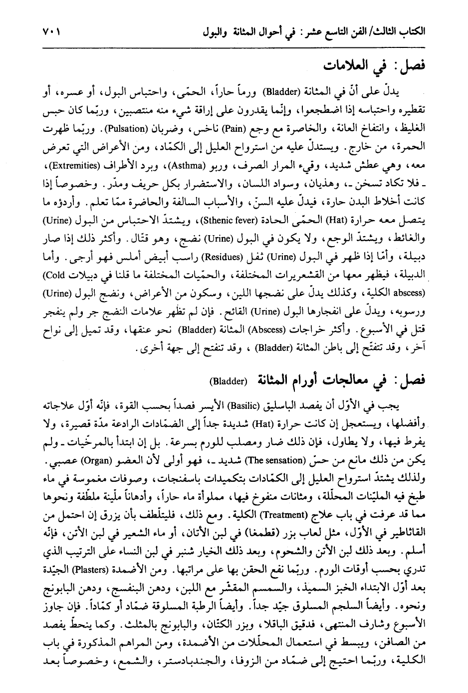 فصل فِي العلامات يدل على أَن فِي المثانة ورماً حاراً الْحمى واحتباس الْبَوْل أَو عسره أَو تقطيره واحتباسه إِذا اضطجعوا وَإِنَّمَا يقدرُونَ على إِرَاقَة شَيْء مِنْهُ منتصبين رربما كَانَ حبس الغليظ وانتفاخ الْعَانَة والخاصرة مَعَ وجع ناخس وضربان. وَرُبمَا ظَهرت الْحمرَة من خَارج. ويستدل عَلَيْهِ من استرواح العليل إِلَى الكماد. وَمن الْأَعْرَاض الَّتِي تعرض مَعَه وَهِي عَطش شَدِيد وقيء المرار الصّرْف وربو وَبرد الْأَطْرَاف فَلَا تكَاد تسخن وهذيان وَسَوَاد اللِّسَان والآستضرار بِكُل حريف ومدر. وخصوصاً إِذا كَانَت أخلاط الْبدن حارة فيدلّ عَلَيْهِ السن والآسباب السالفة والحاضرة مِمَّا تعلم. وأردؤ مَا يتَّصل مَعَه حرارة الْحمى الحادة ويشتد الاحتباس من الْبَوْل وَالْغَائِط ويشتدّ الوجع لَا يكون فِي الْبَوْل نضج وَهُوَ قتال. وَأكْثر ذَلِك إِذا صَار دبيلة وَأما إِذا ظهر فِي الْبَوْل ثفل راسب أَبيض أملس فَهُوَ أَرْجَى. وَأما الدُّبَيْلَة فَيظْهر مَعهَا من القشعريرات الْمُخْتَلفَة والحميات الْمُخْتَلفَة مَا قُلْنَا فِي دبيلات الْكُلية وَكَذَلِكَ يدل على نضجها اللين وَسُكُون من الْأَعْرَاض. ونضج الْبَوْل ورسوبه وَيدل على انفجارها الْبَوْل القائح. فَإِن لم تظهر عَلَامَات النضج جر وَلم ينفجر قتل فِي الآسبوع. وَأكْثر خراجات المثانة نَحْو عُنُقهَا وَقد تميل إِلَى نواح آخر وَقد تتفتّح إِلَى بَاطِن المثانة وَقد تنفتح إِلَى جِهَة آخرى. فصل فِي معالجات أورام المثانة يجب فِي الأول أَن يفصد الباسليق الْأَيْسَر فصداً بِحَسب الْقُوَّة فَإِنَّهُ أول علاجاته وأفضلها ويستعجل إِن كَانَت حرارة شَدِيدَة جدا إِلَى الضمّادات الرادعة مُدَّة قَصِيرَة وَلَا يفرط فِيهَا وَلَا يطاول فَإِن ذَلِك ضار ومصلب للورم بِسُرْعَة. بل إِن ابْتَدَأَ بالمرخيات وَلم يكن ذَلِك مَانع من حسّ شَدِيد فَهُوَ أولى لِأَن الْعُضْو عصبي. وَلذَلِك يشتدّ استرواح العليل إِلَى الكمادات بتكميدات باسفنجات وصوفات مغموسة فِي مَاء طبخ فِيهِ المليّنات المحللة ومثانات منفوخ فِيهَا مَمْلُوءَة مَاء حاراً وأدهاناً ملينة ملطّفة وَنَحْوهَا مِمَّا قد عرفت فِي بَاب علاج الْكُلية. وَمَعَ ذَلِك فليتلطف بِأَن يزر ق إِن احْتمل من القاثاطير فِي الأول مثل لعاب بزر قطونا فِي لبن الأتان. أَو مَاء الشّعير فِي لبن الآتن فَإِنَّهُ أسلم. وَبعد ذَلِك لبن الأتن والشحوم وَبعد ذَلِك الْخِيَار شنبر فِي لبن النِّسَاء على التَّرْتِيب الَّذِي تَدْرِي بِحَسب أَوْقَات الورم. وَرُبمَا نفع الحقن بهَا على مراتبها. ومنن الأضمدة الجيدة بعد أول الِابْتِدَاء الْخبز السميذ والسمسم المقشّر مَعَ اللَّبن ودهن البنفسج ودهن البابونج وَنَحْوه. وَأَيْضًا السلجم المسلوق جيد جدا. وَأَيْضًا الرّطبَة المسلوقة ضماد أَو كماداً. فَإِن جَاوز الآسبوع وشارف الْمُنْتَهى فدقيق الباقلا وبزر الْكَتَّان والبابونج بالمثلث. وكما ينحطّ بفصد من الصَّافِن ويبسط فِي اسْتِعْمَال المحللات من الأضمدة وَمن المراهم الْمَذْكُورَة فِي بَاب الْكُلية وَرُبمَا احْتِيجَ إِلَى ضماد من الزوفا والجندبادستر والشمع وخصوصاً بعد