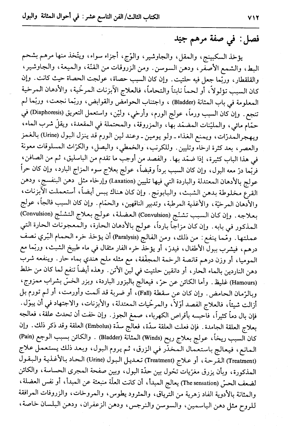 فصل فِي صفة مرهم جيد يُؤْخَذ السكبينج والمقل والجاوشير والوج أَجزَاء سَوَاء ويتخدْ مِنْهَا مرهم بشحم البط والشمع الْأَصْفَر ودهن السوسن. وَمن الزروقات زَرُّوق من القنة والميعة والجاوشير والقلقطار وَرُبمَا جعل فِيهِ حلتيت. وَإِن كَانَ السَّبَب حَصَاة عولجت الْحَصَاة حَيْثُ كَانَت. وَإِن كَانَ السَّبَب ثؤلولاً أَو لَحْمًا نابتاً والتحاماً فالعلاج الآبزنات المرخية والأدهان المرخية الْمَعْلُومَة فِي بَاب المثانة وَاجْتنَاب الحوامض والقوابض وَرُبمَا نجعت وَرُبمَا لم تنجع. وَإِن كَانَ السَّبَب ورماً عولج الورم وأرخي ولين وَاسْتعْمل التعريق فِي حمام مائي والملينات المضمد بهَا والمزروقة والمحتملة فِي المقعدة ويقل شرب المَاء ويهجرالمدرات وَيمْنَع الْغذَاء وَلَو يَوْمَيْنِ وَعند لين الورم قد ينزل الْبَوْل بالغمز وَالْعصر بعد كَثْرَة إرخاء وتليين. وللكرنب والخطمي والبصل والكراث المسلوقات مَعُونَة فِي هَذَا الْبَاب كَثِيرَة إِذا ضمد بهَا. والفصد من أوجب مَا تقدم من الباسليق ثمَّ من الصَّافِن فَرُبمَا درّ مَعَه الْبَوْل. وَإِن كَانَ السَّبَب بردا وقبضاً عولج بعلاج سوء المزاج الْبَارِد وَإِن كَانَ حرا عولج بالأدهان المعتدلة والباردة الَّتِي فِيهَا تليين وإرخاء مثل دهن البنفسج ودهن القرع مخلوطة بدهن الشبث والبابونج. وَإِن كَانَ هُنَاكَ يبس أَيْضا اسْتعْملت الآبزنات والأدهان المرخية والأغذية المرطبة وتدبير الناقهين وَالْحمام. وَإِن كَانَ السَّبَب فالجاً عولج بعلاجه. وَإِن كَانَ السَّبَب تشنج العضلة عولج بعلاج التشنّج الْمَذْكُور فِي بَابه وَلمن كَانَ مزاجاً بَارِدًا عولج بالأدهان الحارة والمعجونات الحارة الَّتِي علمتها. وَمِمَّا ينفع من ذَلِك وَمن الفالج أَن يُؤْخَذ خرء الْحمام الْبري نصف دِرْهَم فيشرب ببول الْأَطْفَال فيدر أَو يُؤْخَذ خرء الفار مِثْقَال فِي مَاء طبيخ الشبث وَرُبمَا زرقاً مَعَ الموميا أَو وزن د رهم قانصة الرخمة المجففة مَعَ مثله ملح هندي بِمَاء حَار. وينفعه شرب دهن الناردين بِالْمَاءِ الْحَار أَو دانقين حلتيت فِي لبن الاتن. وَهَذِه أَيْضا تَنْفَع لما كَانَ من خلط غليظ. وَأما الْكَائِن عَن حر فيعالج بالبزور الْبَارِدَة وبزر الخس بشراب ممزوج وبالرمان الحامض. وَإِن كَانَ عَن سقطة أَو ضَرْبَة قد آلمت وأورمت أَو لم تورم بل أزالت شَيْئا فالعلاج الفصد أَولا والمرخيات المعتدلة والأبزنات وَالِاجْتِهَاد فِي أَن يبوّل. فَإِن بَال دَمًا كثيرا فاحبسه بأقراص الكهرباء صمغ الْجَوْز. وَإِن خفت أَن تحدث علقَة فعالجه بعلاج الْعلقَة الجامدة. فَإِن فعلت الْعلقَة سدة فعالج سدة الْعلقَة وَقد ذكر ذَلِك. وَإِن كَانَ السَّبَب ريحًا عولج بعلاج ريح المثانة. والكائن بِسَبَب الْوَجْه الْمَانِع فيعالج بِاسْتِعْمَال المخدر فِي الزرق ثمَّ يروم الْبَوْل وَبعد ذَلِك يسْتَعْمل علاج القرحة أَو علاج تَعْدِيل الْبَوْل الحاد بالأغذية والبقول الْمَذْكُورَة وَبِأَن يزرق مغريات تحو ل بَين حِدة الْبَوْل وَبَين صفحة المجرى الحساسة. والكائن لضعف الْحس يعالج المبدأ إِن كَانَت الْعلَّة منبعثة عَن المبدأ أَو نفس العضلة والمثانة بالأدوية الفادزهرية من الترياق والمثروديطوس والمروخات والزروقات الْمُوَافقَة للروح مثل دهن الياسمين والسوسن والنرجس ودهن الزَّعْفَرَان ودهن البلسان خَاصَّة