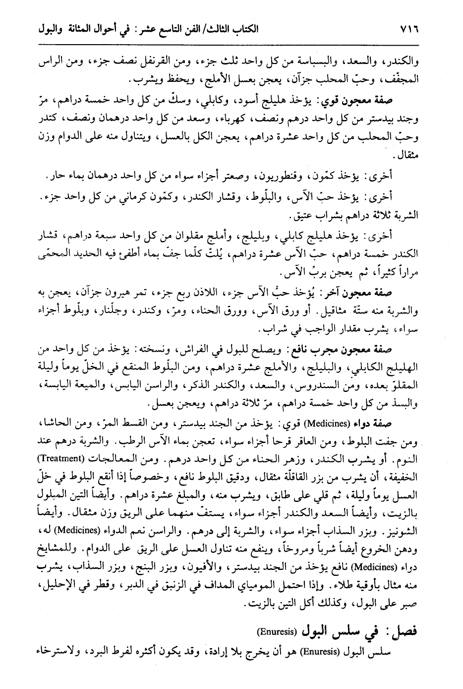 والكندر والسعد والبسباسه من كل وَاحِد ثلث جُزْء وَمن القرنفل نصف جُزْء وَمن الراس المجفف وَحب المحلب جزءان يعجن بِعَسَل الأملج ويحفظ وَيشْرب. صفة معجون قوي: يُؤْخَذ هليلج أسود وكابلي وسك من كل وَاحِد خَمْسَة دَرَاهِم مر وجندبيدستر من كل وَاحِد دِرْهَم وَنصف كهرباء وَسعد من كل وَاحِد دِرْهَمَانِ وَنصف كندر وَحب المحلب من كل وَاحِد عشرَة دَرَاهِم يعجن الْكل بالعسل ويتناول مِنْهُ على الدَّوَام وزن مِثْقَال. آخرى: يُؤْخَذ حب الآس والبلوط وقشار الكندر وكمون كرماني من كل وَاحِد جُزْء. الشربة ثَلَاثَة دَرَاهِم بشراب عَتيق. آخرى: يُؤْخَذ هليلج كابلي وبليلج وأملج مقلوان من كل وَاحِد سَبْعَة دَرَاهِم قشار الكندر خَمْسَة دَرَاهِم حبّ الآس عشرَة دَرَاهِم يُلت كلما جف بِمَاء أطفىء فِيهِ الْحَدِيد المحمى مرَارًا كثيرا ثمَّ يعجن بِرَبّ الآس. صفة معجون آخر: يُؤْخَذ حب الآس جُزْء اللاذن ربع جُزْء تمر هيرون جزءان يعجن بِهِ والشربة مِنْهُ سِتَّة مَثَاقِيل. أَو ورق الآس وورق الْحِنَّاء وَمر وكندر وجلنار وبلوط أَجزَاء سَوَاء يشرب مِقْدَار الْوَاجِب فِي شراب. صفة معجون مجرب نَافِع: وَيصْلح للبول فِي الْفراش ونسخته: يُؤْخَذ من كل وَاحِد من الهليلج الكابلي والبليلج والأملج عشرَة دَرَاهِم وَمن البلوط المنقع فِي الْخلّ يَوْمًا وَلَيْلَة المقلوّ بعده وَمن السندروس والسعد والكندر الذّكر والراسن الْيَابِس والميعة الْيَابِسَة والبسذ من كل وَاحِد خَمْسَة دَرَاهِم مر ثَلَاثَة دَرَاهِم ويعجن بِعَسَل. صفة دَوَاء قوي: يُؤْخَذ من الجندبيدستر وَمن الْقسْط المر وَمن الحاشا وَمن جَفتْ البلوط وَمن العاقرقرحا أَجزَاء سَوَاء تعجن بِمَاء الآس الرطب. والشربة دِرْهَم عِنْد النّوم. أَو يشرب الكندر وزهر الْحِنَّاء من كل وَاحِد دِرْهَم. وَمن المعالجات الْخَفِيفَة أَن يشرب من بزر القاقلة مِثْقَال ودقيق البلوط نَافِع وخصوصاً إِذا أنقع البلوط فِي خل الْعَسَل يَوْمًا وَلَيْلَة ثمَّ قلي على طابق وَيشْرب مِنْهُ والمبلغ عشرَة دَرَاهِم. وَأَيْضًا التِّين المبلول بالزيت وَأَيْضًا السعد والكندر أَجزَاء سَوَاء يستف مِنْهُمَا على الرِّيق وزن مِثْقَال. وَأَيْضًا الشونيز وبزر السذاب أَجزَاء سَوَاء والشربة إِلَى دِرْهَم. والراسن نعم الدَّوَاء لَهُ ودهن الخروع أَيْضا شرباً ومروخاَ وينفع مِنْهُ تنَاول الْعَسَل على الرِّيق على الدَّوَام. وللمشايخ دَوَاء نَافِع يُؤْخَذ من الجندبيدستر والأفيون وبزر البنج وبزر السذاب يشرب مِنْهُ مِثْقَال بأوقية طلاء. وَإِذا احْتمل المومياي المداف فِي الزنبق فِي الدبر وقطر فِي الإحليل صَبر على الْبَوْل وَكَذَلِكَ أكل التِّين بالزيت. فصل فِي سَلس الْبَوْل سَلس الْبَوْل هُوَ أَن يخرج بِلَا إِرَادَة وَقد يكون أَكْثَره لفرط الْبرد ولاسترخاء