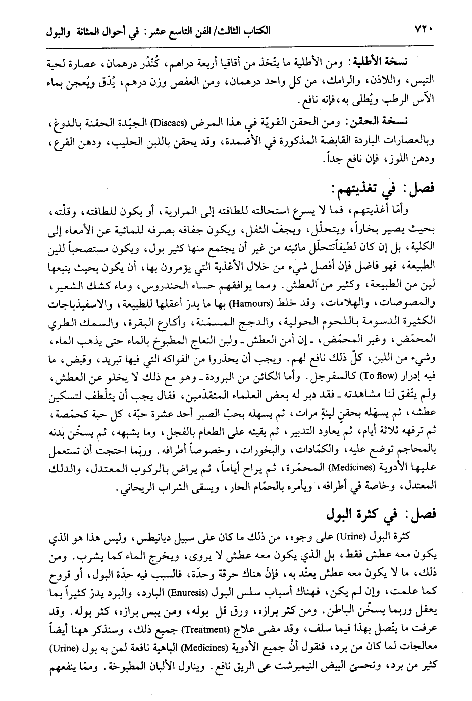 نُسْخَة الأطلية: وَمن الأطلية مَا يتَّخذ من أقاقيا أَرْبَعَة دَرَاهِم كندُر دِرْهَمَانِ عصارة لحية التيس واللاذن والرامك من كل وَاحِد دِرْهَمَانِ وَمن العفص وزن دِرْهَم يدق ويُعجن بِمَاء الآس الرطب ويُطلى بِهِ فَإِنَّهُ نَافِع. نُسْخَة الحقن: وَمن الحقن القوية فِي هَذَا الْمَرَض الجيدة الحقنة بالدوغ وبالعصارات الْبَارِدَة القابضة الْمَذْكُورَة فِي الأضمدة وَقد يحقن بِاللَّبنِ الحليب ودهن القرع ودهن اللوز فَإِنَّهُ نَافِع جدا. فصل فِي تغذيتهم وَأما أغذيتهم فَمَا لَا يسْرع استحالتها للطافته إِلَى المرارية أَو يكون للطافته وقلته بِحَيْثُ يصير بخاراً ويتحلل ويجف الثفل وَيكون جفافه بصرفه للمائية عَن الأمعاء إِلَى الْكُلية بل إِن كَانَ لطيفاً تتحلل مائيته من غير أَن يجْتَمع مِنْهَا كثير بَوْل وَيكون مستصحباً للين الطبيعة فَهُوَ فَاضل فَإِن أفضل شَيْء من خلال الأغذية الَّتِي يؤمرون بهَا أَن يكون بِحَيْثُ يتبعهَا لين من الطبيعة وكثيرمن الْعَطش. وَمِمَّا يوافقهم حساء الخندروس وَمَاء كشك الشّعير والمصوصات والهلامات وَقد خلط بهَا مَا يدرّ أعقلها للطبيعة والآسفيذباجات الْكَثِيرَة الدسومة باللحوم الحولية والدجج المسمنة وأكارع الْبَقر والسمك الطري المحمض وَغير المحمض - إِن أَمن الْعَطش وَلبن النعاج الْمَطْبُوخ بِالْمَاءِ حَتَّى يذهب المَاء وَشَيْء من اللَّبن كل ذَلِك نَافِع لَهُم. وَيجب أَن يحذروا من الْفَوَاكِه الَّتِي فِيهَا تبريد وَقبض مَا فِيهِ إدرار كالسفرجل. وَأما الْكَائِن من الْبُرُودَة وَهُوَ مَعَ ذَلِك لَا يَخْلُو عَن الْعَطش وَلم يتَّفق لنا مشاهدته فقد دبر لَهُ بعض الْعلمَاء المتقدّمين فَقَالَ يجب أَن يتلطف لتسكين عطشه ثمَّ يسهله بحقنٍ لينةٍ مَرَّات ثمَّ يسهله بحب الصَّبْر أحد عشرَة حَبَّة كل حَبَّة كحصة ثمَّ ترفهه ثَلَاثَة أَيَّام ثمَّ يعاود التَّدْبِير ثمَّ يقيئه على الطَّعَام بالفجل وَمَا يُشبههُ ثمَّ يسخّن بدهنه بالمحاجم تُوضَع عَلَيْهِ والكمادات والبخورات وخصوصاً أَطْرَافه. وَرُبمَا احتجت أَن تسْتَعْمل عَلَيْهَا الْأَدْوِيَة المحمرة ثمَّ يراح أَيَّامًا ثمَّ يراح بالركوب المعتدل والدلك المعتدل وخاصة فِي أَطْرَافه ويأمره بالحمام الْحَار ويسقى الشَّرَاب الريحاني. فصل فِي كَثْرَة الْبَوْل كَثْرَة الْبَوْل على وُجُوه من ذَلِك مَا كَانَ على سَبِيل ديانيطس وَلَيْسَ هَذَا هُوَ الَّذِي يكو ن مَعَه عَطش فَقَط بل الَّذِي يكون مَعَه عَطش لَا يرْوى وَيخرج المَاء كَمَا يشرب. وَمن ذَلِك مَا لَا يكون مَعَه عَطش يعْتد بِهِ فَإِن هُنَاكَ حرقة وحدّة فالسبب فِيهِ حِدة الْبَوْل أَو قُرُوح كَمَا علمت وَإِن لم يكن فهناك أَسبَاب سَلس الْبَوْل الْبَارِد وَالْبرد يدر كثيرا بِمَا يعقل وَبِمَا يسخن الْبَاطِن. وَمن كثر برازه ورق قل بَوْله وَمن يبس برازه كثر بَوْله. وَقد عرفت مَا يتَّصل بِهَذَا فِيمَا سلف وَقد مضى علاج جَمِيع ذَلِك وَسَنذكر هَهُنَا أَيْضا معالجات لما كَانَ من برد فَنَقُول أَن جَمِيع الْأَدْوِيَة الباهية نافعة لمن بِهِ بَوْل كثير من برد وتحسي ويناول الألبان المطبوخة. وَمِمَّا يَنْفَعهُمْ