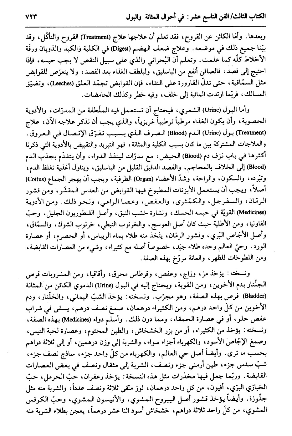 وَبعدهَا. وَأما الْكَائِن عَن القروح فقد تعلم أَن علاجها علاج القروح والتأكل وَقد بَينا جَمِيع ذَلِك فِي مَوْضِعه. وعلاج ضعف الهضم فِي الْكُلية والكبد والذوبان ورقة الأخلاط كُله كَمَا علمت. وَتعلم أَن البُحراني وَالَّذِي على سَبِيل النَّقْص لَا يجب حَبسه فَإِذا احْتِيجَ إِلَى فصد فالصافن أَنْفَع من الباسليق وليلطف الْغذَاء بعد الفصد وَلَا يتَعَرَّض للقوابض مثل السماقية حَتَّى تدل القارورة على النَّقَاء فَإِن القوابض تجمد العلق وتضيّق المسالك فَرُبمَا ارْتَدَّت المائية إِلَى خلف وَفِيه خطر وَكَذَلِكَ الحامضات. وَأما الْبَوْل الشعري فَيحْتَاج أَن تسْتَعْمل فِيهِ الملطفة المقطّعة من المدرات والأدوية الحصوية وَأَن يكون الْغذَاء مرطباً ترطيباً غريزياً وَالَّذِي يجب أَن نذْكر علاجه الأن علاج بَوْل الدَّم والعلاجات الْمُشْتَركَة بَين مَا كَانَ بِسَبَب الْكُلية والمثانة فَهُوَ التبريد والتقبيض بالأدوية الَّتِي ذكرنَا أَكْثَرهَا فِي بَاب نزف دم الْحيض مَعَ مدرات لينفذ الدَّوَاء وَأَن يتَقَدَّم بجذب الدَّم إِلَى الْخلاف بالمحاجم والفصد الدَّقِيق الْقَلِيل من الباسليق ويناول أغذية تغلظ الدَّم وتبرده والسكون والراحة وَشد الْأَعْضَاء الطرفية وَيجب أَن يهجر الْجِمَاع أصلا وَيجب أَن يسْتَعْمل الأبزنات الْمَطْبُوخ فِيهَا القوابض من العدس المقشر وَمن قشور الرُّمَّان والسفرجل والكمّثري والعفص وعصا الرَّاعِي وَنَحْو ذَلِك. وَمن الأ وية القوية فِي حَبسه: الحسك ونشارة خشب النبق وأصل القنطوريون الْجَلِيل وَحب الفاونيا. وَمن الأطلية حَيْثُ كَانَ أصل العوسج والخرنوب النبطي خرنوب الشوك والسماق وأصل الأجاص الْبري وقشور الرُّمَّان يتَّخذ مِنْهُ طلاء بِمَاء الريباس أَو الحصرم أَو عصارة الْورْد. وَحي الْعَالم وَحده طلاء جيد خُصُوصا أَصله مَعَ كثيراء وَشَيْء من العصارات القابضة. وَمن اللطوخات لِلظهْرِ والعانة مروّخ بِهَذِهِ الصّفة ونسخته: يؤخذْ مرّ وزاج وعفص وَقِرْطَاس محرق وأقاقيا وَمن المشروبات: قرص الجلنار بِدَم الْأَخَوَيْنِ. وَمن القوية وَيحْتَاج إِلَيْهِ فِي الْبَوْل الدموي الْكَائِن من المثانة قرص بِهَذِهِ الصّفة وَهُوَ مجرب ونسخنه: يُؤْخَذ الشب الْيَمَانِيّ والجلنار وَدم الْأَخَوَيْنِ من كل وَاحِد دِرْهَم وَمن الكثيراء دِرْهَمَانِ صمغ نصف دِرْهَم يسقى فِي شراب عفص حُلْو أَو فِي عصارة الحمقاء وَمِمَّا دون ذَلِك. وَأسلم دَوَاء بِهَذِهِ الصّفة ونسخته: يُؤْخَذ من الكثيراء أَو من بزر الخشخاش والطين الْمَخْتُوم وعصارة لحية التيس وصمغ الإجاص الآسود والكهرباء أَجزَاء سَوَاء والشربة إِلَى وزن دِرْهَمَيْنِ أَو إِلَى ثَلَاثَة دَرَاهِم بِحَسب مَا ترى. وَأَيْضًا أصل حَيّ الْعَالم والكهرباء من كل وَاحِد جُزْء ساذج نصف جُزْء شب سدس جُزْء طين أرمني جُزْء وَنصف الشربة إِلَى مِثْقَال وَنصف فِي بعض العصارات القابضة. وَرُبمَا جعل فِيهَا مخدرات مثل هَذِه النُّسْخَة: يُؤْخَذ زعفران حب الحرمل حب الْخَبَّازِي الْبري أفيون من كل وَاحِد دِرْهَمَانِ لوز منقّى ثَلَاثَة وَنصف عددا والشربة مِنْهُ مثل جلوزة. وَأَيْضًا يُؤْخَذ قشور أصل اليبروح المشوي والأنيسون المشوي وحبّ الكرفس المشوي من كل وَاحِد ثَلَاثَة دَرَاهِم خشخاش أسود إثنا عشر درهما يعجن بطلاء الشربة مِنْهُ