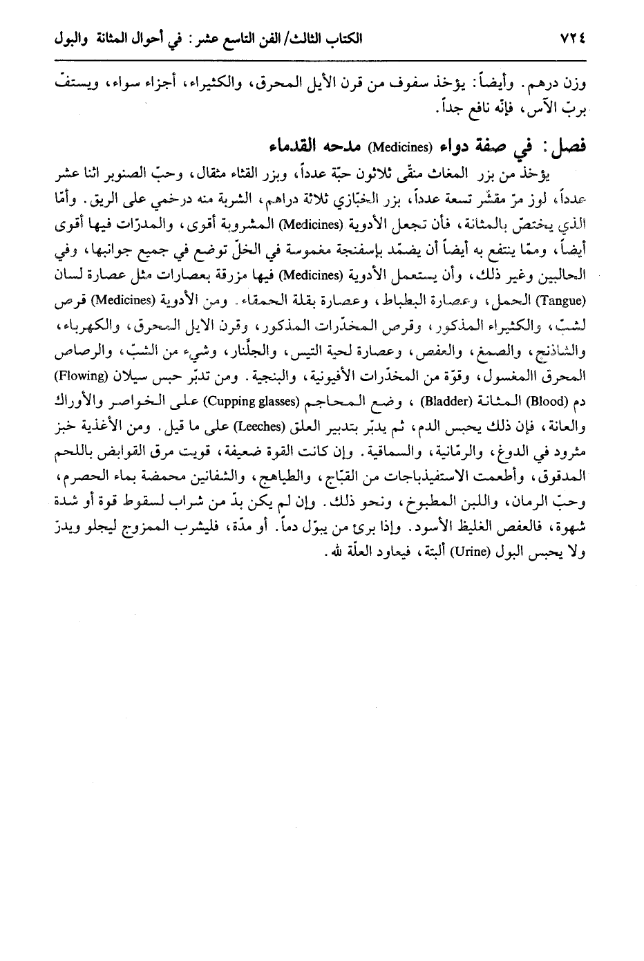 وزن دِرْهَم. وَأَيْضًا: يُؤْخَذ سفوف من قرن الأيل المحرق والكثيراء أَجزَاء سَوَاء ويستف بِرَبّ الآس فَإِنَّهُ نَافِع جداَ. يُؤْخَذ من بزر المغاث منقى ثَلَاثُونَ حَبَّة عددا وبزر القثاء مِثْقَال وَحب الصنوبر إثنا عشر عددا لوز مر مقشر تِسْعَة عددا بزر الْخَبَّازِي ثَلَاثَة دَرَاهِم الشربة مِنْهُ درخمي على الرِّيق. وَأما الَّذِي يختصّ بالمثانة فَأن تجْعَل الْأَدْوِيَة المشروبة أقوى والمدرات فِيهَا أقوى أَيْضا. وَمِمَّا ينْتَفع بِهِ أيضاَ أَن يضمّد بإسفنجة مغموسة فِي الْخلّ تُوضَع فِي جَمِيع جوانبها وَفِي الحالبين وَغير ذَلِك وَأَن يسْتَعْمل الْأَدْوِيَة فِيهَا مزرقة بعصارات مثل عصارة لِسَان الْحمل وعصارة البطباط وعصارة بقلة الحمقاء. وَمن الْأَدْوِيَة: قرص الشبّ والكثيراء الْمَذْكُور وقرص المخدراتّ الْمَذْكُور وَقرن الأيل والكهرباء والشاذنج والصمغ والعفص وعصارة لحية التيس وَشَيْء من الشب والرصاص المحرق المغسول وَقُوَّة من المخدرات الأفيونية والبنجية. وَمن تدبر حبس سيلان دم المثانة وضع المحاجم على الخواصر والأوراك والعانة فَإِن ذَلِك يحبس الدَّم ثمَّ يدبر بتدبير بتدبير العلق على مَا قيل. وَمن الأغذية: خبز مثرود فِي الدوغ والرمانية والسماقية. وَإِن كَانَت الْقُوَّة ضَعِيفَة قويت مرق القوابض باللحمم المدقوق وأطعمت الآسفيذباجات من القباج والطياهج والشفانين محمضة بِمَاء الحصرم وَحب الرُّمَّان وَاللَّبن الْمَطْبُوخ وَنَحْو ذَلِك. وَإِن لم يكن بُد من شراب لسُقُوط قُوَّة أَو شدّ شَهْوَة فالعفص الغليظ الآسود. وَإِذا برىء من يبو ل دَمًا أَو مُدَّة فليشرب الممزوج ليجلو ويدر وَلَا يحبس الْبَوْل الْبَتَّةَ فيعاود الْعلَّة.