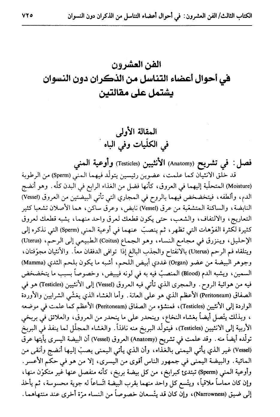 الْفَنّ الْعشْرُونَ أَحْوَال أَعْضَاء التناسل من الذكران دون النسوان يشْتَمل على مقالتين: الْمقَالة الأولى الكليات وَفِي الباه فصل فِي تشربح الأنثببن وأوعية الْمَنِيّ قد خلق الأنثيان كَمَا علمت عضوين رئيسين يتَوَلَّد فيهمَا الْمَنِيّ من الرُّطُوبَة المتحلبة إِلَيْهِمَا فِي الْعُرُوق كَأَنَّهَا فضل من الْغذَاء الرَّابِع فِي الْبدن كُله. وَهُوَ أنضج الدَّم وألطفه فيتخضخض فيهمَا بِالروحِ فِي المجاري الَّتِي تَأتي البيضتين منٍ الْعُرُوق النابضة والساكنة المتشعبة من عرق نابض وعرق سَاكن هما الأصلان تشعب كثير التعاريج والالتفاف والشعب حَتَّى يكون قَطعك لعرق وَاحِد مِنْهُمَا يشبه قَطعك لعروق كَثِيرَة لِكَثْرَة الفوهات الَّتِي تظهر ثمَّ ينصب عَنْهُمَا فِي أوعية الْمَنِيّ الَّتِي نذكرها إِلَى الإحليل وينزرق فِي مجامع النِّسَاء وَهُوَ الْجِمَاع الطبيعي إِلَى الرَّحِم ويتلقاه فَم الرَّحِم بالانفتاح والجذب الْبَالِغ إِذا توافى الدفقان مَعًا. والأنثيان مجوفتان وجوهر الْبَيْضَة من عُضْو غددي أَبيض اللَّحْم أشبه مَا يكون بِلَحْم الثدي السمين وَيُشبه الدَّم المنصب فِيهِ بِهِ فِي لَونه فيبيض وخصوصاً بِسَبَب مَا يتخضخض فِيهِ من هوائية الرّوح. والمجرى الَّذِي تَأتي فِيهِ الْعُرُوق إِلَى الْأُنْثَيَيْنِ هُوَ فِي الصفاق الْأَعْظَم الَّذِي هُوَ على الْعَانَة. وَأما الغشاء الَّذِي يغشي الشرايين والأوردة الْوَارِدَة إِلَى الْأُنْثَيَيْنِ فمنشؤه من الصفاق الْأَعْظَم كَمَا علمت فِي مَوْضِعه وَبِذَلِك يتَّصل أَيْضا بغشاء النخاع وينحدر على مَا ينحدر من الْعُرُوق والعلائق فِي بربخي الأربية إِلَى الْأُنْثَيَيْنِ فيتولد البربخ مِنْهُ نَافِذا. والغشاء المجلّل لما ينفذ فى البربخ تولده أَيْضا مِنْهُ. وَقد علمت فِي تشريح الْعُرُوق أَن الْبَيْضَة الْيُسْرَى يَأْتِيهَا عرق غير الَّذِي يَأْتِي الْيُمْنَى بالغذاء وَأَن الَّذِي يَأْتِي الْيُمْنَى يصب إِلَيْهَا دَمًا أنضج وأنقى من المائية. والبيضة الْيُمْنَى فِي جمهورور النَّاس أقوى من الْيُسْرَى إِلَّا من هُوَ فِي حكم الأعسر. وأوعية الْمَنِيّ تبتدىء كبرابخ من كل بَيْضَة بربخ كَأَنَّهُ مُنْفَصِل عَنْهَا غير متكو ن مِنْهَا وَإِن كَانَ مماساً ملاقياً ويتسع كل وَاحِد مِنْهُمَا بِقرب الْبَيْضَة اتساعاً لَهُ جوبة محسوسة ثمَّ يَأْخُذ إِلَى ضيق وَإِن كَانَ قد يتسعان خُصُوصا من النِّسَاء مرّة آخرى عِنْد منتهاهما.