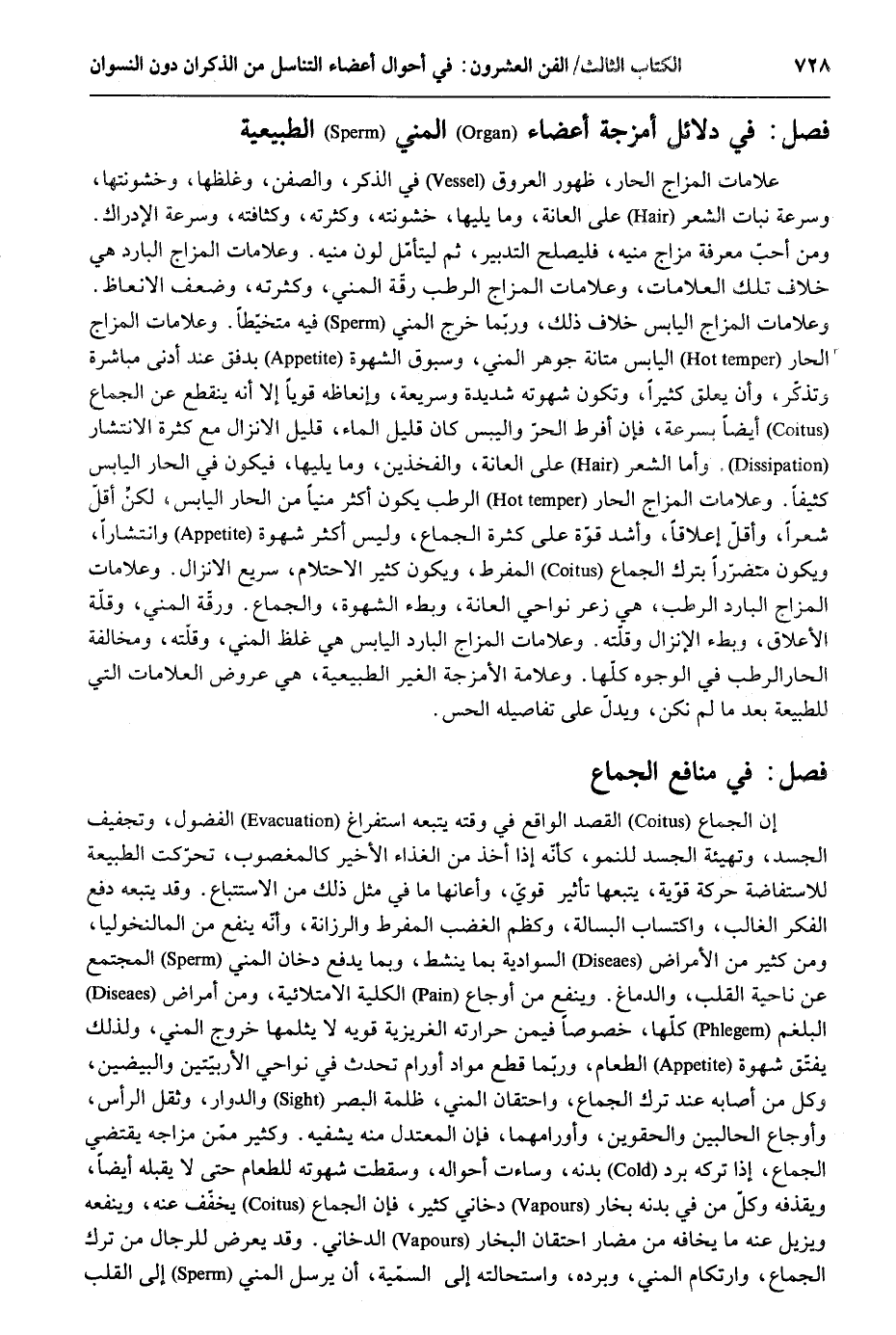 فصل فِي دَلَائِل أمزجة أَعْضَاء الْمَنِيّ الطبيعية: عَلَامَات المزاج الْحَار ظُهُور الْعُرُوق فِي الذّكر والصفن وغلظها وخشونتها وَسُرْعَة نَبَات الشّعْر على الْعَانَة وَمَا يَليهَا وخشونته وكثرته وكثافته وَسُرْعَة الْإِدْرَاك. وَمن أحبّ معرفَة مزاج منيه فليصلح التَّدْبِير ثمَّ ليتأمل لون منيه. وعلامات المزاج الْبَارِد هِيَ خلاف تِلْكَ العلامات. وعلامات المزاج الرطب رقة الْمَنِيّ وكثرته وَضعف الإنعاظ. وعلامات المزاج الْيَابِس خلاف ذَلِك وَرُبمَا خرج الْمَنِيّ فِيهِ متخيطاً. وعلامات المزاج الْحَار الْيَابِس متانة جَوْهَر الْمَنِيّ وسبوق الشَّهْوَة بدفق عِنْد أدنى مُبَاشرَة وتذكّر وَأَن يعلق كثيرا وَتَكون شَهْوَته شَدِيدَة وسريعة وإنعاظه قَوِيا إِلَّا أَنه يَنْقَطِع عَن الْجِمَاع أَيْضا بِسُرْعَة فَإِن أفرط الْحر واليبس كَانَ قَلِيل المَاء قَلِيل الْإِنْزَال مَعَ كَثْرَة الإنتشار. وَأما الشّعْر على الْعَانَة والفخذين وَمَا يَليهَا فَيكون فِي الْحَار الْيَابِس كثيرا كثيفاً. وعلامات المزاج الْحَار الرطب يكون أَكثر منياً من الْحَار الْيَابِس لكنه أقل شعرًا وَأَقل إعلاقاً وَأَشد قُوَّة على كَثْرَة الْجِمَاع وَلَيْسَ أَكثر شَهْوَة وانتشاراً وَيكون متضرراً بترك الْجِمَاع المفرط وَيكون كثير الِاحْتِلَام سريع الْإِنْزَال. وعلامات المزاج الْبَارِد الرطب هِيَ زعر نواحي الْعَانَة وبطء الشَّهْوَة وَالْجِمَاع ورقة الْمَنِيّ وَقلة الإعلاق وبطء الْإِنْزَال وقلته. وعلامات المزاج الْبَارِد الْيَابِس هِيَ غلظ الْمَنِيّ وقلته وَمُخَالفَة. الْحَار الرطب فِي الْوُجُوه كلهَا. وعلامة الأمزجة الْغَيْر الطبيعية هِيَ عرُوض العلامات الَّتِي للطبيعة بعد مَا لم نَكُنْ وَيدل على تفاصيلة الْحس. فصل فِي مَنَافِع الْجِمَاع: إِن الْجِمَاع الْقَصْد الْوَاقِع فِي وقته يتبعهُ استفراغ الفضول وتجفيف الْجَسَد وتهيئهْ الْجَسَد للنموّ كَأَنَّهُ إِذا أَخذ من الْغذَاء الْأَخير شَيْء كالمغصوب تحركت الطبيعة للاستفاضة حَرَكَة قَوِيَّة يتبعهَا تأئير قوي وأعانها مَا فِي مثل ذَلِك مِنْهُ الاستتباع. وَقد يتبعهُ دفع الْفِكر الْغَالِب واكتساب البسالة وكظم الْغَضَب المفرط والرزانة وَله ينفع من المالنخوليا وَمن كثير من الْأَمْرَاض السوداوية بِمَا ينشط وَبِمَا يدف دُخان الْمَنِيّ الْمُجْتَمع عَن نَاحيَة الْقلب والدماغ. وينفع من أوجاع الْكُلية الامتلائية وَمن أمراض البلغم كلهَا خُصُوصا فِيمَن حرارته الغريزية قَوِيَّة لَا يثلمها خُرُوج الْمَنِيّ وَلذَلِك يفتّق شَهْوَة الطَّعَام وَرُبمَا قطع مواد أورام تحدث فِي نواحي وكل من أَصَابَهُ عِنْد ترك الْجِمَاع واحتقان الْمَنِيّ ظلمَة الْبَصَر والدوار وَثقل الرَّأْس وأوجاع الحالبين والحقوين وأورامهما فَإِن المعتدل مِنْهُ يشفيه. وَكثير مِمَّن مزاجه يَقْتَضِي الْجِمَاع إِذا تَركه برد بدنه وَسَاءَتْ أَحْوَاله وَسَقَطت شَهْوَته للطعام حَتَّى لَا يقبله أَيْضا ويقذفه. وكل من فِي بدنه بخار دخاني كثير فَإِن الْجِمَاع يُخَفف عَنهُ وينفعه ويزيل عَنهُ مَا يخافه من مضار احتقان البخار الدخاني. وَقد يعرض للرِّجَال من ترك الْجِمَاع وارتكام الْمَنِيّ وبرده واستحالته إِلَى السمّية أَن يُرْسل الْمَنِيّ إِلَى الْقلب