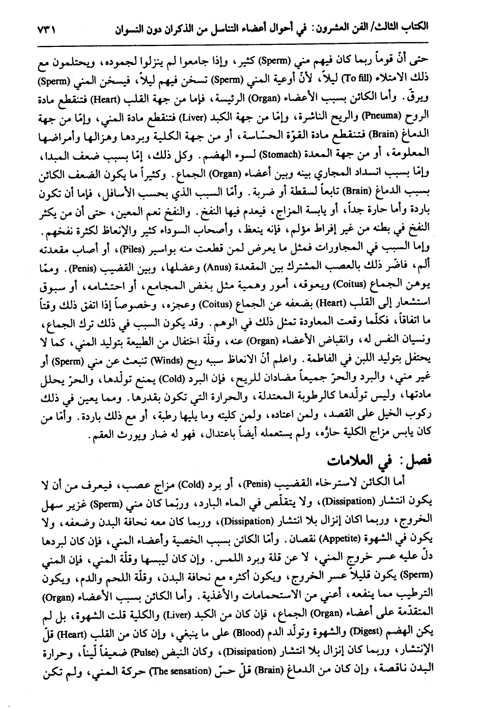 حَتَّى إِن قوما رُبمَا كَانَ فيهم مني كثير وَإِذا جامعوا لم ينزلوه لجموده ويحتلمون مَعَ ذَلِك الامتلاء لَيْلًا لِأَن أوعيه الْمَنِيّ تسخن فيهم لَيْلًا فيسخن الْمَنِيّ ويرق. وَأما الْكَائِن بِسَبَب الْأَعْضَاء الرئيسة فإمَّا من جِهَة الْقلب فتنقطع مَادَّة الرّوح وَالرِّيح الناشرة وَإِمَّا من جِهَة الكبد فتنقطع مَادَّة الْمَنِيّ وَإِمَّا من جِهَة الدِّمَاغ فتنقطع مَادَّة الْقُوَّة الحساسة أَو من جِهَة الْكُلية وبردها وهزالها وأمراضها الْمَعْلُومَة أَو من جِهَة الْمعدة لسوء الهضم. وكل ذَلِك إِمَّا بِسَبَب ضعف المبدأ وَإِمَّا بِسَبَب انسداد المجاري بَينه وَبَين أَعْضَاء الْجِمَاع. وَكَثِيرًا مَا يكون الضعْف الْكَائِن بِسَبَب الدِّمَاغ تَابعا لسقطة أَو ضَرْبَة. وَأما السَّبَب الَّذِي بِحَسب الآسافل فإمَّا أَن تكون بَارِدَة وَإِمَّا حارة جدا أَو يابسة المزاج فيعدم فِيهَا النفخ. والنفخ نعم الْمعِين حَتَّى إِن من يكثر النفخ فِي بَطْنه من غير إفراط مؤلم فَإِنَّهُ ينعظ وَأَصْحَاب السَّوْدَاء كثيرو الإنعاط لِكَثْرَة نَفَخَهُمْ. وَأما السَّبَب فِي المجاورات فَمثل مَا يعرض لمن قطعت مِنْهُ بواسير أَو أصَاب مقعدته ألم فأضر ذَلِك بالعصب الْمُشْتَرك بَين المقعدة وعضلها وَبَين الْقَضِيب. وَمِمَّا يوهن الْجِمَاع ويعوقه أُمُور وهميه مثل بغض المجامع أَو احتشامه أَو سبوق استشعار إِلَى الْقلب عَن الْجِمَاع وعجزه وخصوصاً إِذا اتّفق ذَلِك وقتا مَا اتِّفَاقًا فَكلما وَقعت المعاودة تمثل ذَلِك فِي الْوَهم. وَقد يكون السَّبَب فِي ذَلِك ترك الْجِمَاع ونسيان النَّفس لَهُ وانقباض الْأَعْضَاء عَنهُ وَقلة احتفال من الطبيعة بتوليد الْمَنِيّ كَمَا لَا يحتفل بتوليد اللَّبن فِي الفاطمة. وَاعْلَم أَن الإنعاظ سَببه ريح تنبعث عَن مني أَو غير مني وَالْبرد وَالْحر جَمِيعًا مضادان للريح فَإِن الْبرد يمْنَع تولدها وَالْحر يحلل مادتها وَلَيْسَ تولدها كالرطوبة المعتدلة والحرارة الَّتِي تكون بِقَدرِهَا. وَمِمَّا يعين فِي ذَلِك ركُوب الْخَيل على الْقَصْد وَلمن اعتاده وَلمن كليته وَمَا يَليهَا رطبَة أَو مَعَ ذَلِك بَارِدَة. وَأما من كَانَ يَابِس مزاج الْكُلية حاره وَلم يَسْتَعْمِلهُ أَيْضا باعتدال فَهُوَ لَهُ ضار وَيُورث العقم. فصل فِي العلامات: أما الْكَائِن لاسترخاء الْقَضِيب أَو برد مزاج عصب فَيعرف من أَن لَا يكون انتشار وَلَا يَتَقَلَّص فِي المَاء الْبَارِد وَرُبمَا كَانَ مني كزير سهل الْخُرُوج وَرُبمَا كَانَ إِنْزَال بِلَا انتشار وَرُبمَا كَانَ مَعَه نحافة الْبدن وَضَعفه وَلَا يكون فِي الشَّهْوَة نُقْصَان. وَأما الْكَائِن بِسَبَب الخصية وأعضاء الْمَنِيّ فَإِن كَانَ لبردها دلّ عَلَيْهِ عسر خُرُوج الْمَنِيّ لَا عَن قلَّة وَبرد اللَّمْس. وَإِن كَانَ ليبسها وَقلة الْمَنِيّ فَإِن الْمَنِيّ يكون قَلِيلا عسر الْخُرُوج ويكن أَكْثَره مَعَ نحافة الْبدن وَقلة اللَّحْم وَالدَّم وَيكون الترطيب مِمَّا يَنْفَعهُ أَعنِي من الاستحمامات والأغذية. وَأما الْكَائِن بِسَبَب الْأَعْضَاء الْمُتَقَدّمَة على أَعْضَاء الْجِمَاع فَإِن كَانَ من الكبد والكلية قلت الشَّهْوَة بل لم يكن الهضم والشهوة وتولد الدَّم على مَا يَنْبَغِي وَإِن كَانَ من الْقلب قل الإنتشار وَرُبمَا كَانَ إِنْزَال بِلَا انتشار وَكَانَ النبض ضَعِيفا لينًا وحرارة الْبدن نَاقِصَة وَإِن كَانَ من الدِّمَاغ قل حس حَرَكَة الْمَنِيّ وَلم تكن