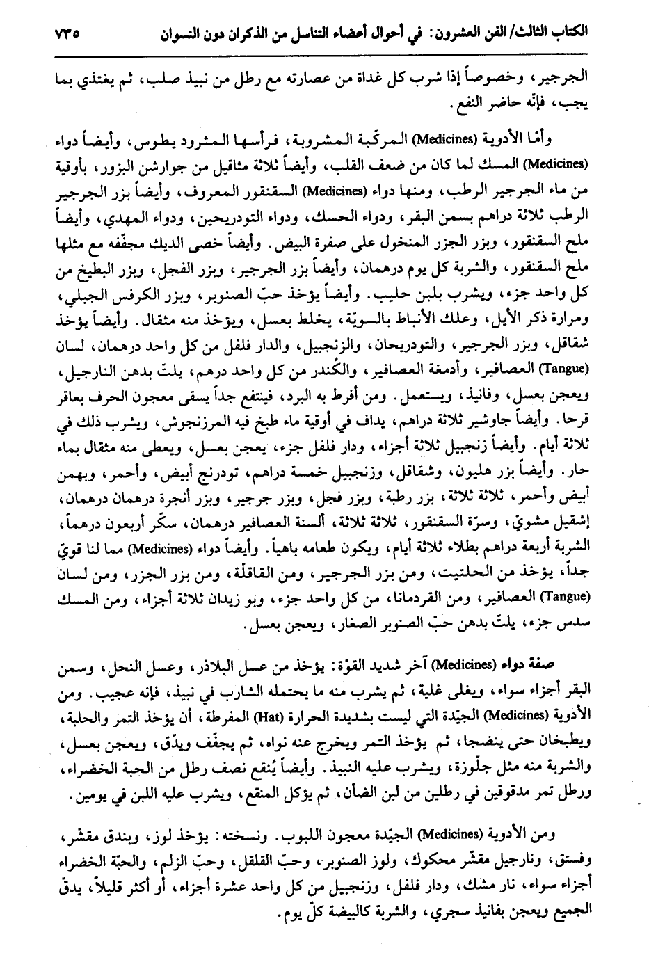 الجرجير وخصوصاً إِذا شرب كل غَدَاة من عصارته مَعَ رَطْل من نَبِيذ صلب ثمَّ يغتذي بِمَا يجب فَإِنَّهُ حَاضر النَّفْع. وَأما الْأَدْوِيَة المركبة المشروبة فرأسها المثروديطوس وَأَيْضًا دَوَاء الْمسك لما كَانَ من ضعف الْقلب وَأَيْضًا ثَلَاثَة مَثَاقِيل من جوارشن البزور بأوقية من مَاء الجرجير الرطب وَمِنْهَا دَوَاء السقنقور الْمَعْرُوف وَأَيْضًا بزر الجرجير الرطب ثَلَاثَة دَرَاهِم بِسمن الْبَقر ودواء الحسك ودواء التودريحان ودواء الْمهْدي وَأَيْضًا ملح السقنقور وبزر الجزر المنخول على صفرَة الْبيض. وَأَيْضًا خصي الديك مجففة مَعَ مثلهَا ملح السقنقور والشربة كل يَوْم دِرْهَمَانِ وَأَيْضًا بزر الجرجير وبزر الفجل وبزر الْبِطِّيخ من كل وَاحِد جُزْء وَيشْرب بِلَبن حليب. وَأَيْضًا يُؤْخَذ حب الصنوبر وبزر الكرفس الْجبلي ومرارة ذكر الأيل وعلك الأنباط بِالسَّوِيَّةِ يخلط بِعَسَل وَيُؤْخَذ مِنْهُ مِثْقَال. وَأَيْضًا يُؤْخَذ شقاقل وبزر الجرجير والتودريحان والزنجبيل والدارفلفل من كل وَاحِد دِرْهَمَانِ لِسَان العصافير وأدمغة العصافير والكُدر من كل وَاحِد دِرْهَم يلت بدهن النارجيل ويعجن بِعَسَل وفانيذ وَيسْتَعْمل. وَمن أفرط بِهِ الْبرد فينتفع جدا يسقى معجون الْحَرْف بعاقرقرحا. وَأَيْضًا جاوشير ثَلَاثَة دَرَاهِم يداف فِي أُوقِيَّة مَاء طبخ فِيهِ المرزنجوش وَيشْرب ذَلِك فِي ثَلَاثَة أَيَّام. وَأَيْضًا زنجبيل ثَلَاثَة أَجزَاء وَدَار فلفل جُزْء يعجن بِعَسَل وَيُعْطى مِنْهُ مِثْقَال بِمَاء حَار. وَأَيْضًا بزر هليون وشقاقل وزنجبيل خَمْسَة دَرَاهِم تودرنج أَبيض وأحمر وبهمن أَبيض وأحمر ثَلَاثَة ثَلَاثَة بزر رطبَة وبزر فجل وبزر جرجير وبزر أنجرة دِرْهَمَانِ دِرْهَمَانِ إشقيل مشوي وسرّة السقنقور ثَلَاثَة ثَلَاثَة أَلْسِنَة العصافير دِرْهَمَانِ سكر أَرْبَعُونَ درهما الشربة أَرْبَعَة دَرَاهِم بطلاء ثَلَاثَة أَيَّام وَيكون طَعَامه باهياً. وَأَيْضًا دَوَاء مِمَّا لنا قوي جدا يُؤْخَذ من الحلتيت وَمن بزر الجرجير وَمن القاقلة وَمن بزر الجزر وَمن لِسَان العصافير وَمن القردمانا من كل وَاحِد جُزْء وبو زَيْدَانَ ثَلَاثَة أَجزَاء وَمن الْمسك سدس جُزْء يلت بدهن حب الصنوبر الصغار ويعجن بِعَسَل. صفة دَوَاء آخر شَدِيدَة الْقُوَّة: يُؤْخَذ من عسل البلاذر وَعسل النَّحْل وَسمن الْبَقر أَجزَاء سَوَاء ويغلى عَلَيْهِ ثمَّ يشرب مِنْهُ مَا يحْتَملهُ الشَّارِب فِي نَبِيذ فَإِنَّهُ عَجِيب. وَمن الْأَدْوِيَة الجيدة الَّتِي لَيست بشديدة الْحَرَارَة المفرطة أَن يُؤْخَذ التَّمْر والحلبة ويطبخان حَتَّى ينضجا ثمَّ يُؤْخَذ التَّمْر وَيخرج عَنهُ نَوَاه ثمَّ يجفف ويدقّ ويعجن بِعَسَل والشربة مِنْهُ مثل جلّوزة وَيشْرب عَلَيْهِ النَّبِيذ. وَأَيْضًا يُنقع نصف رَطْل من الْحبَّة الخضراء ورطل تمر مدقوقين فِي رطلين من لبن الضَّأْن ثمَّ يُؤْكَل المنقع وَيشْرب عَلَيْهِ اللَّبن فِي يَوْمَيْنِ. وَمن الْأَدْوِيَة الجيدة معجون اللبوب. ونسخته: يُؤْخَذ لوز وبندق مقشر وفستق ونارجيل مقشّر محكوك ولوز الصنوبر وحبّ الفلفل وحبّ الزلم والحبة الخضراء أَجزَاء سَوَاء نَار مشك وَدَار فلفل وزنجبيل من كل وَاحِد عشرَة أَجزَاء أَو أَكثر قَلِيلا يدق الْجَمِيع ويعجن بفانيذ سجري والشربة كالبيضة كل يَوْم.