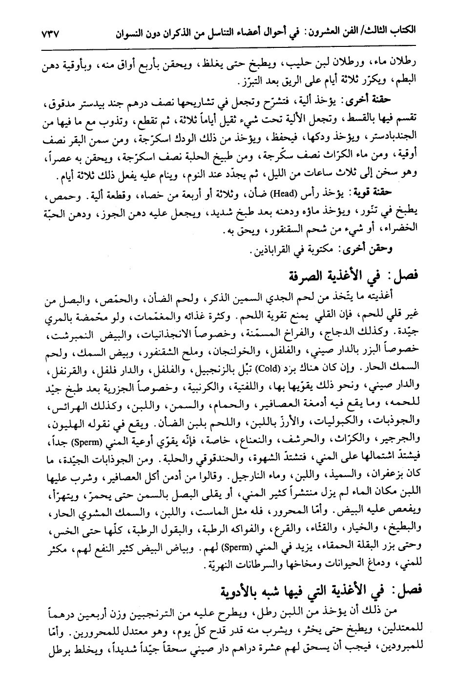 رطلان مَاء ورطلان لبن حليب ويطبخ حَتَّى يغلظ ويحقن بِأَرْبَع أَوَاقٍ مِنْهُ وبأوقية دهن البطم ويكرر ثَلَاثَة أَيَّام على الرِّيق بعد التبرز. حقنة أُخْرَى: يُؤْخَذ ألية فتشرّح وَتجْعَل فِي تشاريحها نصف دِرْهَم جندبيدستر مدقوق تقسم فِيهَا بِالْقِسْطِ وَتجْعَل الألية تَحت شَيْء ثفيل أَيَّامًا ثَلَاثَة ثمَّ تقطع وتذوب مَعَ مَا فِيهَا من الجندبادستر وَيُؤْخَذ ودكها فيحفظ وَيُؤْخَذ من ذَلِك الْوَعْد اسكرجة وَمن صدر الْبَقر نصف أُوقِيَّة وَمن مَاء الكراث نصف سكرجة وَمن طبيخ الحلبة نصف اسكرجة ويحقن بِهِ عصراً وَهُوَ سخن إِلَى ثَلَاث سَاعَات من اللَّيْل ثمَّ يجدد عِنْد النّوم وينام عَلَيْهِ يفعل ذَلِك ثَلَاثَة أَيَّام. حقنة قَوِيَّة: يُؤْخَذ رَأس ضَأْن وَثَلَاثَة أَو أَرْبَعَة من خصاه وَقطعَة ألية وحمص يطْبخ فِي تنور وَيُؤْخَذ ماؤ هـ ودهنه بعد طبخ شَدِيد وَيجْعَل عَلَيْهِ د هن الْجَوْز ودهن الْحبَّة الخضراء أَو شَيْء من شَحم السقنقور ويحقن بِهِ. وحقن آخرى: مَكْتُوبَة فِي القراباذين. فصل فِي الآغذية الصرفة: أغذيته مَا يتَّخذ من لحم الجدي السمين الذّكر وَلحم الضَّأْن والحمص والبصل من غير قلي للحم فَإِن القلي يمْنَع تَقْوِيَة اللَّحْم. وَكَثْرَة غذائه والمغممات وَلَو محمضة بالمري جَيِّدَة. وَكَذَلِكَ الدَّجَاج والفراخ المسمنة وخصوصاً الانجذانيات وَالْبيض النمبرشت خُصُوصا البزر بالدارصيني والفلفل والخولنجان وملح السقنقور وبيض السّمك وَلحم السّمك الْحَار. وَإِن كَانَ هُنَاكَ برد تبل بالزنجبيل والفلفل وَالدَّار فلفل والقرنفل والدارصيني وَنَحْو ذَلِك يقويها بهَا واللفتية والكرنبية وخصوصاً الجزرية بعد طبخ جيد للحمه وَمَا يَقع فِيهِ أدمغة العصافير وَالْحمام وَالسمن وَاللَّبن وَكَذَلِكَ الهرائس والجوذبات والكبوليات والأرز بِاللَّبنِ وَاللَّحم بِلَبن الضَّأْن. وَيَقَع فِي نقُوله الهليون والجرجير والكراث والحرشف والنعناع خَاصَّة فَإِنَّهُ يقو ي أوعية الْمَنِيّ جدا فيشتد اشتمالها على الْمَنِيّ فتشتد الشَّهْوَة والحندقوقي والحلبة. وَمن الجوذابات الجيدة مَا كَانَ بزعفران والسميذ وَاللَّبن وَمَاء النارجيل. وَقَالُوا من أدمن كل العصافير وَشرب عَلَيْهَا اللَّبن مَكَان المَاء لم يزل منتشراً كثير الْمَنِيّ أَو يقلى البصل بالسمن حَتَّى يحمر ويتهرأ ويفعص عَلَيْهِ الْبيض. وَأما المحرور فَلهُ مثل الماست وَاللَّبن والسمك المشوي الْحَار والبطيخ وَالْخيَار والقثاء والقرع والفواكه الرّطبَة والبقول الرّطبَة كلهَا حَتَّى الخس وَحَتَّى بزر البقلة الحمقاء يزِيد فِي الْمَنِيّ لَهُم. وَبَيَاض الْبيض كثير النَّفْع لَهُم مكثرالمني ودماغ الْحَيَوَانَات ومخاخها والسرطانات النهرية. فصل فِي الأغذية الَّتِي فِيهَا شبه بالأدوية: من ذَلِك أَن يُؤْخَذ من اللَّبن رَطْل ويطرح عَلَيْهِ من الترنجبين وزن أَرْبَعِينَ درهما للمعتدلين ويطبخ حَتَّى يخثر وَيشْرب مِنْهُ قدر قدح كل يَوْم وَهُوَ معتدل للمحرورين. وَأما للمبرودين فَيجب أَن يسحق لَهُم عشرَة دَرَاهِم دارصيني سحقاً جيدا شَدِيدا يخلط برطل