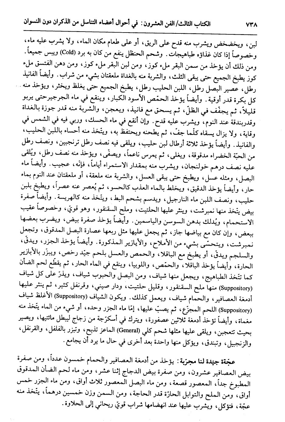 لبن ويخضخض وَيشْرب مِنْهُ قدح على الرِّيق أَو على طَعَام مَكَان المَاء إِلَّا يشرب عَلَيْهِ مَاء وخصوصاً إِذا كَانَ غذاؤه طباهيجات وشحم الحنظل ينفع من كَانَ بِهِ برد ويبس جَمِيعًا. وَمن ذَلِك أَن يُؤْخَذ من سمن الْبَقر ملْء كوز وَمن لبن الْبَقر ملْء كوز وَمن دهن الفستق ملْء كوز يطْبخ الْجَمِيع حَتَّى يبْقى الثُّلُث والشربة مِنْهُ بِالْغَدَاةِ ملعقتان بِشَيْء من شراب. وَأَيْضًا الفانيد رَطْل عصير البصل رَطْل اللَّبن الحليب رَطْل يطْبخ الْجَمِيع حَتَّى يغلظ ويخثر وَيُؤْخَذ وَأَيْضًا يُؤْخَذ الحمص الْأسود الْكِبَار وينقع فِي مَاء الجرجير حَتَّى يَرْبُو قَلِيلا ثمَّ يجفف فِي الظل ثمَّ يسحق مَعَ فانيذ ويعجن والشربة مِنْهُ قدر جوزة بِالْغَدَاةِ وَقدر بندقة عندْ النّوم وَيشْرب عَلَيْهِ قدح. وَإِن أنقع فِي مَاء الحسك وربي فِيهِ فِي الشَّمْس فِي وقاية وَلَا يزَال يسقاه كلما جفّ ثمَّ يطحنه ويحتفظ بِهِ ويتخذ مِنْهُ أحساء بِاللَّبنِ الحليب الفانيذ. وَأَيْضًا يُؤْخَذ ثَلَاثَة أَرْطَال لبن حليب ويلقى فِيهِ نصف رَطْل ترنجبين وَنصف رَطْل من الْحبَّة الخضراء مدقوقة ويغلى ثمَّ يمرس نَاعِمًا ويصفى وَيُؤْخَذ مِنْهُ نصف رَطْل ويُلقى عَلَيْهِ نصف دِرْهَم خولنجان وَيشْرب مِنْهُ بِمِقْدَار الاستمراء أَيَّامًا فَإِنَّهُ عَجِيب. وَأَيْضًا يُؤْخَذ مَاء البصل وَمثله عسل ويطبخ حَتَّى يبْقى الْعَسَل والشربة مِنْهُ ملعقة. وملعقتان عِنْد النّوم بِمَاء حَار وَأَيْضًا يُؤْخَذ الدَّقِيق ويخلط بِالْمَاءِ العذب كالحسو ثمَّ يعصر عَنهُ عصراً ويطبخ بِلَبن حليب وَنصف اللَّبن مَاء النارجيل ويدسم بشحم البط ويتخذ مِنْهُ كالهريسة. وَأَيْضًا صفرَة بيض يتَّخذ مِنْهَا نمبرشت وينثر عَلَيْهَا الحلتيت وملح السقنقور وَهُوَ قويّ وخصوصاً عقيب الآستحمام ويُدلك بدهن السوسن والياسمين. وَأَيْضًا يُؤْخَذ صفرَة بيض وَيضْرب بَعْضهَا بِبَعْض وَإِن كَانَ مَعَ بياضها جَازَ ثمَّ يَجْعَل اليها مثل ربعهَا عصارة البصل المدقوق وَتجْعَل نمبرشت ويتحسى بِشَيْء من الأملاح والأبازير الْمَذْكُورَة. وَأَيْضًا يُؤْخَذ الجزر ويدقّ والسلجم ويدقّ أَو يطْبخ مَعَ الباقلا والحمص وَالْعَسَل بِلَحْم جيد رخص ويبزر بالأبازير الحارة. وَأَيْضًا يُؤْخَذ الباقلا والحمص واللوبيا وينقع فِي المَاء الْحَار ثمَّ يقطع دم الضَّأْن كَمَا تتَّخذ الطباهيج وَيجْعَل مِنْهَا شياف وَمن البصل والحبوب شياف ويذر على كل شياف مِنْهَا ملح السقنقور وَقَلِيل حلتيت ودارصيني وقرنفل كثير ثمَّ ينثر عَلَيْهَا أدمغة العصافير وَالْحمام شياف وَيعْمل كَذَلِك. وَيكون الشياف الأغلظ شياف اللَّحْم المجزع ثمَّ يصبّ عَلَيْهَا إِمَّا مَاء الجزر وَحده أَو شَيْء من المَاء يتَّخذ مِنْهُ مغماة وَأَيْضًا تُؤْخَذ أدمغة ثَلَاثِينَ عصفورة وَيتْرك فِي أسكرجة من زجاج ليبطل مائيتها وَيصير بِحَيْثُ تتعجّن ويلقى عَلَيْهَا مثلهَا شَحم كلى الماعز سَاعَة تذبح وتبزر بالفلفل والقرنفل والزنجبيل وتبندق ويؤكل مِنْهَا وَاحِدَة بعد أُخْرَى فِي حَال مَا يُرِيد أَن يُجَامع. عجّة جَيِّدَة لنا مجرّبة: يُؤْخَذ من أدمغة العصافير وَالْحمام خَمْسُونَ عددا وَمن صفرَة بيض العصافير عشرُون وَمن صفرَة بيض الدَّجَاج إثنا عشر وَمن مَاء لحم الضَّأْن المدقوق الْمَطْبُوخ جدا المعصور قَصْعَة وَمن مَاء البصل المعصور ثَلَاث أَوَاقٍ وَمن مَاء الجزر خمس أَوَاقٍ وَمن الْملح والتوابل الحارة قدر الْحَاجة وَمن السّمن وزن خمسين درهما يتَّخذ مِنْهُ عجة فتؤكل وَيشْرب عَلَيْهَا عِنْد انهضامها شراب قوي ريحاني إِلَى الْحَلَاوَة.