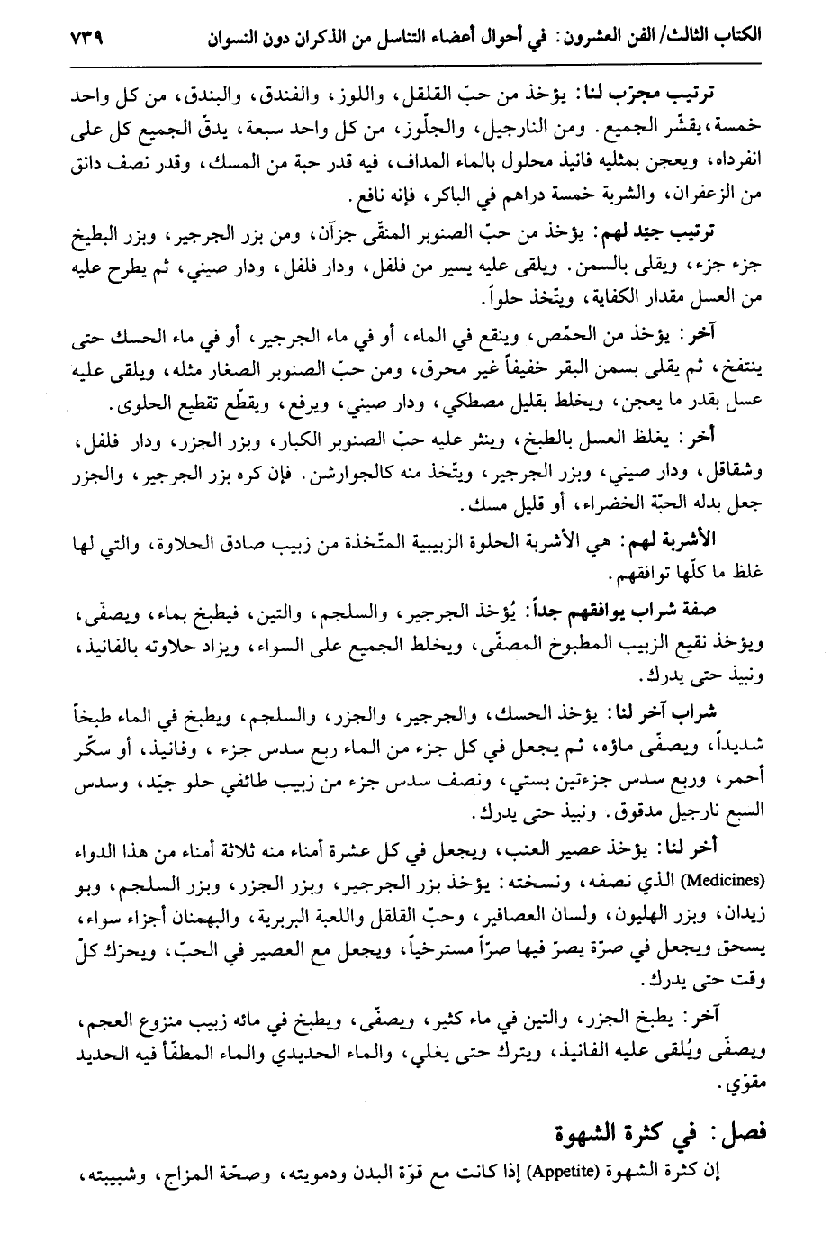 تَرْتِيب مجرب لنا: يُؤْخَذ من حبّ القلقل واللوز والفندق والبندق من كل وَاحِد خَمْسَة يقشر الْجَمِيع وَمن النارجيل والجلوز من كل وَاحِد سَبْعَة يدقّ الْجَمِيع كل على انْفِرَاده ويعجن بمثليه فانيذ محلول بِالْمَاءِ المداف فِيهِ قدر حَبَّة من الْمسك وَقدر نصف دانق من الزَّعْفَرَان والشربة خَمْسَة دَرَاهِم فِي الباكر فَإِنَّهُ نَافِع. تَرْتِيب جيَد لَهُم: يُؤْخَذ من حب الصنوبر المنقّى جزءان وَمن بزر الجرجير وبزر الْبِطِّيخ جُزْء جُزْء ويقلى بالسمن ويلقى عَلَيْهِ يسير من فلفل وَدَار فلفل ودارصيني ثمَّ يطْرَح عَلَيْهِ من الْعَسَل مِقْدَار الْكِفَايَة ويتخذ حَلواً. آخر: يُؤْخَذ من الحمص وينقع فِي المَاء أَو فِي مَاء الجرجير أَو فِي مَاء الحسك حَتَّى ينتفخ ثمَّ يقلى بِسمن الْبَقر قلياً خَفِيفا غير محرق وَمن حبّ الصنوبر الصغار مثله ويلقى عَلَيْهِ عسل بِقدر مَا يعجن ويخلط بِقَلِيل مصطكى ودارصيني وَيرْفَع ويقطّع تقطيع الْحَلْوَى. أخر: يغلظ الْعَسَل بالطبخ وينثر عَلَيْهِ حب الصنوبر الْكِبَار وبزر الجزر دارفلفل وشقاقل ودارصيني وبزر الجرجير ويتخذ مِنْهُ كالجوارشن. فَإِن كره بزر جرجير والجزر جعل بدله الْحبَّة الخضراء أَو قَلِيل مسك. الْأَشْرِبَة لَهُم: هِيَ الْأَشْرِبَة الحلوة الزبيبية المتخذة من زبيب صَادِق الْحَلَاوَة وَالَّتِي لَهَا غلظ مَا صفة شراب يوافقهم جدا: يُؤْخَذ الجرجير والسلجم والتين فطبخ بِمَاء يصفى وَيُؤْخَذ نَقِيع الزَّبِيب الْمَطْبُوخ الْمُصَفّى ويخلط الْجَمِيع على السوَاء وَيُزَاد حلاوته بالفانيذ ونبيذ حَتَّى يدْرك. شراب آخر لنا: يُؤْخَذ الحسك والجرجير والجزر والسلجم ويطبخ فِي المَاء طبخاً شَدِيدا ويصفى مَاؤُهُ ثمَّ يَجْعَل فِي كل جُزْء من المَاء ربع سدس جُزْء وفانيذ أَو سكّر أَحْمَر وَربع سدس جُزْء تين بستي وَنصف سدس جُزْء من زبيب طائفي حُلْو جيد وَسدس السَّبع نارجيل مدقوق. ونبيذ حَتَّى يدْرك. آخر لنا: يُؤْخَذ عصير الْعِنَب وَيجْعَل فِي كل عشرَة أُمَنَاء مِنْهُ ثَلَاثَة أُمَنَاء من هَذَا الدَّوَاء الَّذِي نصفه ونسخته: يُؤْخَذ بزر الجرجير وبزر الجزر وبزر السلجم وبو زَيْدَانَ وبزر الهليون ولسان العصافير وَحب الفلفل واللعبة البربرية والبهمنان أَجزَاء سَوَاء يسحق وَيجْعَل فِي صرّة يصرّ فِيهَا صراً مسترخياً وَيجْعَل مَعَ الْعصير فِي الحبّ ويحرك كل وَقت حَتَّى يدْرك. آخر: يطْبخ الجزر والتين فِي مَاء كثير ويصفّى ويطبخ فِي مَائه زبيب منزوع الْعَجم ويصفى ويُلقى عَلَيْهِ الفانيذ وَيتْرك حَتَّى يغلي وَالْمَاء الحديدي وَالْمَاء المطفأ فِيهِ الْحَدِيد مقوي. فصل فِي كَثْرَة الشَّهْوَة: إِن كَثْرَة الشَّهْوَة إِذا كَانَت مَعَ قُوَّة الْبدن وعمويته وَصِحَّة المزاج وشبيبته