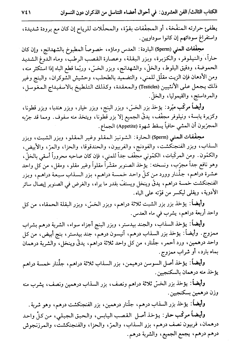 يطفىء حرارته المنقخة أَو المجففات بِقُوَّة والمحللات للرياح إِن كَانَ مَعَ برودة شَدِيدَة واستفراغ سودائهم إِن كَا نوا سوداويين. مجففات الْمَنِيّ الْبَارِدَة: العمس وماؤه خُصُوصا الْمَطْبُوخ بالشهدانج وَإِن كَانَ حاراً والنيلوفر والكزبرة وبزر البقلة وعصارة الْقصب الرطب وَمَاء الدوغ الشَّديد الحموضة ودقيق البلوط والخل والشهدانج وبزر الخس وَرُبمَا قطع الباه إِذا استكثر مِنْهُ وَمن الأدهان فَإِن الزَّيْت مقلل للمني والتضميد بالطحلب وحشيش الشوكران البنج وَغير ذَلِك يَجْعَل على الْأُنْثَيَيْنِ والمقعدة وَكَذَلِكَ التلطيخ بالآسفيداج المغسول والمرداستج والقيموليا والخل. وَأَيْضًا مركّب مبرّد: يُؤْخَذ بزر الخس وبزر البنج وبزر خِيَار وبزر هندبا وبزر قطونا وكزبرة يابسة ونيلوفر مجفف يدق الْجَمِيع إِلَّا بزر قطونا ويتخذ مِنْهُ سفوف. وَمِمَّا قد جرّبه المجربون أَن الْمَشْي حافياً يسْقط شَهْوَة الْجِمَاع. مجففات الْمَنِيّ الحارة: الشونيز المقلو وَغير المقلو وبزر الشبت وبزر السذاب وبزر الفنجنكشت والفودنج والفربيون والحندقوقا والحزا والمرّ والأبيض والكمون. وَمن المركبات الكمّوني مجفف جدا للمني فَإِن كَانَ صَاحبه محرور أَسْقِي بالخل وَهُوَ نَافِع جدا مجرّب ونسخته: يُؤْخَذ الصنوبر مقشّراً مقْلواً وَغير مقلو من كل وَاحِد عشرَة دَرَاهِم جلَنار وَورد من كل وَاحِد خَمْسَة دَرَاهِم بزر السذاب سَبْعَة دَرَاهِم وبزر الفنجنكشت خَمْسَة دَرَاهِم يدقّ وينخل ويستفّ بِقدر مَا يرَاهُ وَالْغَرَض فِي الصنوبر إِيصَال سَائِر الْأَدْوِيَة ويقلى ليكسر من قوته على الباه. وَأَيْضًا: يُؤْخَذ بزر الشبت ثَلَاثَة دَرَاهِم وبزر الخسّ وبزر البقلة الحمقاء من كل وَاحِد أَرْبَعَة دَرَاهِم يشرب فِي مَاء العدس. وَأَيْضًا: يُؤْخَذ بزر السذاب والجندبيدستر وبزر البنج أَجزَاء سَوَاء الشربة دِرْهَم بشراب ممزوج. وَأَيْضًا: يُؤْخَذ بزر السذاب دِرْهَم أنيسون دِرْهَم جندبيدستر بنج أَبيض من كل وَاحِد دِرْهَمَيْنِ ورد أَحْمَر جلنار من كل وَاحِد ثَلَاثَة دَرَاهِم يدق أوينخل والشربة دِرْهَمَانِ بِمَاء بَارِد أَو شراب ممزوج. وَأَيْضًا: يُؤْخَذ أصل السوسن دِرْهَمَيْنِ بزر السذاب ثَلَاثَة دَرَاهِم جلنار خَمْسَة دَرَاهِم يُؤْخَذ مِنْهُ دِرْهَمَانِ بالسكنجبين. وَأَيْضًا: يُؤْخَذ بزر الخسّ ثَلَاثَة درام وَنصف بزر السذاب دِرْهَمَيْنِ وَنصف يشرب مِنْهُ وزن دِرْهَمَيْنِ بسكنجبين. وأيضأً مركب حَار: يُؤْخَذ أصل الْقصب الْيَابِس والحبق الْجبلي من كل وَاحِد دِرْهَمَانِ فربيون نصف دِرْهَم بزر السذاب والمر والحزا والفنجنكشت والمرزنجوش دِرْهَم دِرْهَم وَيجمع الْجَمِيع والشربة دِرْهَم.