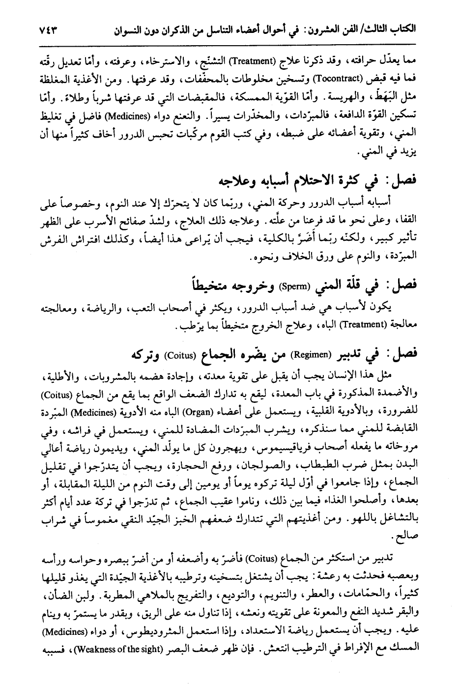 مِمَّا يعدل حرافته وَقد ذكرنَا علاج التشنج والاسترخاء وعرفته أما تَعْدِيل رقته فَمَا فِيهِ قبض وتسخين مخلوطات بالمجففات وَقد عرفتها. وَمن الأغذية الْمُغَلَّظَة مثل البَهَط والهريسة. وَأما القوية الممسكة فالمقبضات الَّتِي قد عرفتها شرباً وطلاء. وَأما تسكين الْقُوَّة الدافعة فالمبردات والمخدرات يسيراَ. والنعنع دَوَاء فَاضل فِي تَغْلِيظ الْمَنِيّ وتقوية أَعْضَائِهِ على ضَبطه وَفِي كتب الْقَوْم مركبات تحبس الدرور أَخَاف كثيراَ مِنْهَا أَن يزِيد فِي الْمَنِيّ. فصل فِي كَثْرَة الِاحْتِلَام أَسبَابه وعلاجه: أَسبَابه أَسبَاب الْمُرُور وحركة الْمَنِيّ وَرُبمَا كَانَ لَا يَتَحَرَّك إِلَّا عِنْد النّوم وخصوصاَ على الْقَفَا وعَلى نَحْو مَا قد فَرغْنَا من علته. وعلاجه ذَلِك العلاج ولشد صَفَائِح الأسرب على الظّهْر تَأْثِير كَبِير وَلكنه رُبمَا أضرّ بِالْكُلِّيَّةِ فَيجب أَن يُراعى هَذَا أَيْضا وَكَذَلِكَ افتراش الْفرش المبردة وَالنَّوْم على ورق الْخلاف وَنَحْوه. فصل فِي قلَّة الْمَنِيّ وَخُرُوجه متخطاً: يكون لأسباب هِيَ ضد أَسبَاب الدرور وَيكثر فِي أَصْحَاب التَّعَب والرياضة ومعالجته معالجة الباه وعلاج الْخُرُوج متخيطاً بِمَا يرطب. فصل فِي تَدْبِير من يضرّهُ. الْجِمَاع وَتَركه: مثل هَذَا الْإِنْسَان يجب أَن يقبل على تَقْوِيَة معدته وإجادة هضمه بالمشروبات والأطلية والأضمدة الْمَذْكُورَة فِي بَاب الْمعدة ليَقَع بِهِ يتدارك الضعْف الْوَاقِع بِمَا يَقع من الْجِمَاع للضَّرُورَة وبالأدوية القلبية وَيسْتَعْمل على أَعْضَاء الباه مِنْهُ الادوية المبردة القابضة للمني مِمَّا سَنذكرُهُ وَيشْرب المبردات المضادة للمني وَيسْتَعْمل فِي فرَاشه وَفِي مروخاته مَا يَفْعَله أَصْحَاب فريافيسيموس ويهجرون كل مَا يُولد الْمَنِيّ ويديمون رياضة أعالي الْبدن بِمثل ضرب الطبطاب والصولجان وَرفع الْحِجَارَة وَيجب أَن يتدرجوا فِي تقليل الْجِمَاع وَإِذا جامعوا فِي أول لَيْلَة تَرَكُوهُ يومأ أَو يَوْمَيْنِ إِلَى وَقت النّوم من اللَّيْلَة الْقَابِلَة أَو بعْدهَا وَأَصْلحُوا الْغَدَاء فَمَا بَين ذَلِك وناموا عقيب الْجِمَاع ثمَّ تدرجوا فِي تَركه عدَّة أَيَّام أكَثر بالتشاغل باللهو. وَمن أغذيتهم الَّتِي تتدارك تَدْبِير من استكثر من الْجِمَاع فأضر بِهِ وأضعفه أَو من أضرّ ببصره. وحواسه وَرَأسه وبعصبه فَحدثت بِهِ رعشة: يجب أَن يشْتَغل بتسخينه وترطيبه بالأغذية الجيدة الَّتِي يغذو قليلها كثيرا والحمامات والعطر والتنويم والتوديع والتفريح بالملاهي المطربة وَلبن الضَّأْن وَالْبَقر شَدِيد النَّفْع والمعونة على تقويته ونعشه إِذا تنَاول مِنْهُ على الرِّيق وبقدر مَا يستمربه وينام عَلَيْهِ. وَيجب أَن يسْتَعْمل رياضة الاستعداد وَإِذا إستعمل المثروديطوس أَو دَوَاء الْمسك مَعَ الإفراط فِي الترطيب انْتَعش. فَإِن ظهر ضعف الْبَصَر فسببه