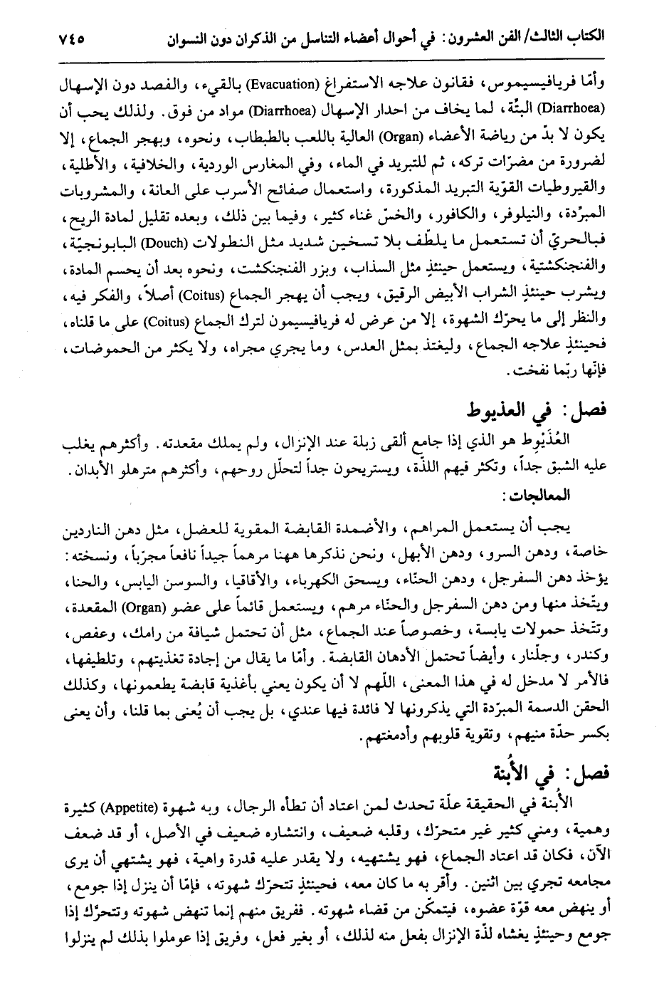 وَأما فريافيسيموس فقانون علاجه الاستفراغ بالقيء والفصد دون الإسهال الْبَتَّةَ لما يخَاف من إحدار الإسهال مواد من فَوق. ولفلك يجب أَن يكون لَا بُد من رياضة الْأَعْضَاء الْعَالِيَة باللعب بالطبطاب وَنَحْوه ويهجر الْجِمَاع إِلَّا لضَرُورَة من مضرّات تَركه ثمَّ للتبريد فِي المَاء وَفِي المغارس الوردية والخلافية والأطلية والقيروطيات القوية التبريد الْمَذْكُورَة وَاسْتِعْمَال صَفَائِح الأسرب على الْعَانَة والمشروبات المبرَّدة والنيلوفر والكافور والخسّ غناء كثير. وَفِيمَا بَين ذَلِك وَبعده تقليل لمادة الرّيح فبالحري أَن تسْتَعْمل مَا يلطف بِلَا تسخين شَدِيد مثل النطولات البابونجية والفنجنكشتية وَيسْتَعْمل حِينَئِذٍ مثل السذاب وبزر الفنجنكشت وَنَحْوه بعد أَن يحسم الْمَادَّة وَيشْرب حِينَئِذٍ الشَّرَاب الْأَبْيَض الرَّقِيق وَيجب أَن يهجر الْجِمَاع أصلا والفكر فِيهِ وَالنَّظَر إِلَى مَا يُحَرك الشَّهْوَة إِلَّا من عرض لَهُ فريافيسموس لترك الْجِمَاع على مَا قُلْنَاهُ فَحِينَئِذٍ علاجه الْجِمَاع وليغتذ بِمثل العدس وَمَا يجْرِي مجْرَاه وَلَا يكثر من الحوضات فَإِنَّهَا رُبمَا نفخت. فصل فِي العذيوط: العَذَيْوِط هُوَ الَّذِي إِذا جَامع ألْقى زبلة عِنْد الْإِنْزَال وَلم يملك مقعدته. وَأَكْثَرهم يغلب عَلَيْهِ الشبق جدا وتكثر فهم اللَّذَّة ويستريحون جدا لتحفل روحهم وَأَكْثَرهم مترهلو الْأَبدَان. المعالجات: يجب أَن يسْتَعْمل المراهم والأضمدة القابضة المقوية للعضل مثل دهن الناردين خَاصَّة ودهن السرو ودهن الأبهل وَنحن نذكرها هَهُنَا مرهماً جيدا نَافِعًا مجزباً ونسخته: يُؤْخَذ دهن السفرجل ودهن الْحِنَّاء ويسحق الكهربا والأقافيا والسوسن الْيَابِس والحناء ويتخذ مِنْهَا وَمن دهن السفرجل والحناء مرهم وَيسْتَعْمل قَائِما على عُضْو المقعدة وتتخذ حمولات يابسة وخصوصاً عِنْد الْجِمَاع مثل أَن تحْتَمل شيافة من رامك وعفص وكندر وجلنار وَأَيْضًا تحْتَمل الأدهان القابضة. وَأما مَا يُقَال من إجادة تغذيتهم وتلطيفها فَالْأَمْر لَا مدْخل لَهُ فِي هَذَا الْمَعْنى اللَّهُمَّ لَا أَن يكون يَعْنِي بأغذية قابضة يطعمونها وَكَذَلِكَ الحقن المسمة المبردة الَّتِي يذكرونها لَا فائحة فِيهَا عِنْدِي بل يجب أَن يُعنى بِمَا قُلْنَاهُ وَأَن يعْنى بِكَسْر حِدة منيهم وتقوية قُلُوبهم وأدمغتهم. فصل فِي الأبنة: الأبنة فِي الْحَقِيقَة عِلّة تحدث لمن اعْتَادَ أَن تطأه الرِّجَال وَبِه شَهْوَة كَثِيرَة وهمية ومني كثير غير متحرك وَقَلبه ضَعِيف وانتشاره ضَعِيف فِي الأَصْل أَو قد ضعف الان فَكَانَ قد اعْتَادَ الْجِمَاع فَهُوَ يشتهيه وَلَا يقدر عَلَيْهِ أَو يقدر عَلَيْهِ قدرَة واهية فَهُوَ يَشْتَهِي أَن يرى مجامعة تجْرِي بَين إثنين. وأقربة مَا كَانَ مَعَه فَحِينَئِذٍ تتحرك شَهْوَته فإمَّا أَن ينزل إِذا جومع أَو ينْهض مَعَه قُوَّة عضوه فيتمكن من قَضَاء شَهْوَته. ففريق مِنْهُم إِنَّمَا تنهض شَهْوَته وتتحرَك إِذا جومع وَحِينَئِذٍ يشغاه لَذَّة الْإِنْزَال بِفعل مِنْهُ لذَلِك أَو بِغَيْر فعل وفريق إِذا عوملوا بذلك لم ينزلُوا