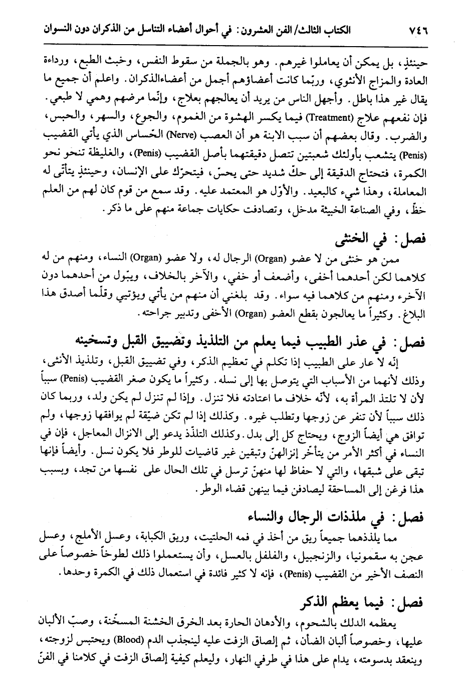 حِينَئِذٍ بل يُمكن أَن يعاملوا غَيرهم. وَهُوَ بِالْجُمْلَةِ من سُقُوط النَّفس وخبث الطَّبْع ورداءة الْعَادة والمزاج الأنثوي وَرُبمَا كَانَت أعضاؤهم أجمل من أَعْضَاء الذكران. وَاعْلَم أَن جَمِيع مَا يُقَال غير هَذَا بَاطِل. وأجهل النَّاس من يُرِيد أَن يعالجهم بعلاج وَإِنَّمَا مرضهم وهمي لَا طبعي. فَإِن نفعهم علاج فِيمَا يكسر الشَّهْوَة من الغموم والجوع والسهر وَالْحَبْس وَالضَّرْب. وَقَالَ بَعضهم أَن سَبَب الِابْنَة هُوَ أَن العصب الحساس الَّذِي يَأْتِي الْقَضِيب يتشعب بأولئك شعبتين تتصل دقيقتهما بِأَصْل الْقَضِيب والغليظة تنحو نَحْو الكمرة فتحتاج الدقيقة إِلَى حك شَدِيد حَتَّى يحس فيتحرك على الْإِنْسَان وَحِينَئِذٍ يَتَأَتَّى لَهُ الْمُعَامَلَة وَهَذَا شَيْء كالعبيد. وَالْأول هُوَ الْمُعْتَمد عَلَيْهِ. وَقد سمع من قوم كَانَ لَهُم من الْعلم حَظّ وَفِي الصِّنَاعَة الخبيثة مدْخل وتصادفت حكايات جمَاعَة مِنْهُم على مَا ذكر. . فصل فِي الْخُنْثَى: مِمَّن هُوَ خُنْثَى من لَا عُضْو الرِّجَال لَهُ وَلَا عُضْو النِّسَاء وَمِنْهُم من لَهُ كِلَاهُمَا لَكِن أَحدهمَا أخْفى وأضعف أَو خَفِي والاخر بِالْخِلَافِ ويبول من أَحدهمَا دون الآخر. وَمِنْهُم من كِلَاهُمَا فِيهِ سَوَاء. وَقد بَلغنِي أَن مِنْهُم من يَأْتِي وَيُؤْتى وقلما أصدق هَذَا الْبَلَاغ. وَكَثِيرًا مَا يعالجون بِقطع الْعُضْو الأخفى وتدبير جراحته. فصل فِي عذر الطَّبِيب فِيمَا يعلم من التلذيذ وتضييق الْقبل وتسخينه: إِنَّه لَا عَار على الطَّبِيب إِذا تكلم فِي تَعْظِيم الذّكر وَفِي تضييق الْقبل وتلذيذ الْأُنْثَى وَذَلِكَ لِأَنَّهُمَا من الْأَسْبَاب الَّتِي يتَوَصَّل بهَا إِلَى نَسْله. وَكَثِيرًا مَا يكون صغر الْقَضِيب سَببا لِأَن لَا تلتذ الْمَرْأَة بِهِ لِأَنَّهُ خلاف مَا اعتادته فَلَا تنزل. وَإِذا لم تنزل لم يكن ولد وَرُبمَا كَانَ ذَلِك سَببا لِأَن تنفر عَن زَوجهَا وتطلب غَيره. وَكَذَلِكَ إِذا لم تكن ضيّقة لم يُوَافِقهَا زَوجهَا وَلم توَافق هِيَ أَيْضا الزَّوْج وَيحْتَاج كل إِلَى بدل. وَكَذَلِكَ التَّلَذُّذ يَدْعُو إِلَى الْإِنْزَال المعاجل فَإِن فِي النِّسَاء فِي أَكثر الْأَمر من يتَأَخَّر إنزالهن وتبقين غير قاضيات للوطر فَلَا يكون نسل. وَأَيْضًا فَإِنَّهَا تبقى على شبقها وَالَّتِي لَا حفاظ لَهَا مِنْهُنَّ ترسل فِي تِلْكَ الْحَال على نَفسهَا من تَجِد وبسبب هَذَا فرغن إِلَى الْمُسَاحَقَة ليصادفن فِيمَا بَينهُنَّ قَضَاء الوطر. فصل فِي ملذذات الرِّجَال وَالنِّسَاء: مِمَّا يلذذهما جَمِيعًا ريق من آخذ فِي فَمه الحلتيت وريق الكبابة وَعسل الأملج وَعسل عجن بِهِ سقمونيا والزنجبيل والفلفل بالعسل وَأَن يستعملوا ذَلِك لطوخاً خُصُوصا على النّصْف الْأَخير من الْقَضِيب فَإِنَّهُ لَا كثير فَائِدَة فِي اسْتِعْمَال ذَلِك فِي الكمرة وَحدهَا. فصل فبمَا يعظم الذّكر: يعظمه الدَّلْك بالشحوم والأدهان الحارة بعد الْخرق الخشنة المسخمة وصب الألبان عَلَيْهَا وخصوصاَ ألبان الضَّأْن ثمَّ إلصاق الزفت عَلَيْهِ لينجذب الدَّم ويحتبس للزوجته وَينْعَقد بدسومته يدام على هَذَا فِي طرفِي النَّهَار وليعلم كَيْفيَّة إلصاق الزفت فِي كلامنا فِي الْفَنّ