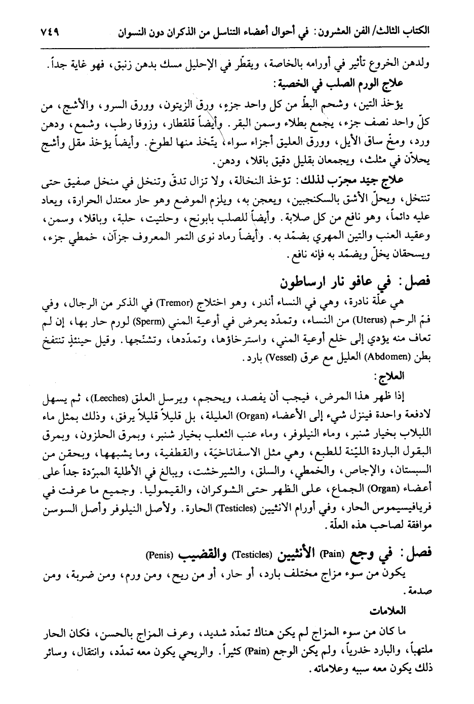 ولدهن الخروع تَأْثِير فِي أورامه بالخاصة ويقطر فِي الإحليل مسك بدهن زنبق فَهُوَ غَايَة جدا. علاج الورم الصلب فِي الخصية: يُؤْخَذ التِّين وشحم البطّ من كل وَاحِد جُزْء ورق الزَّيْتُون وورق السرو والأشج من كل وَاحِد نصف جُزْء يجمع بطلاء وَسمن الْبَقر. وَأَيْضًا قلقطار وزوفا رطب وشمع ودهن ورد ومخّ سَاق الأيل وورق العليق أَجزَاء سَوَاء يتَّخذ مِنْهَا لطوخ. وَأَيْضًا يُؤْخَذ مقل وأشج يحلآن فِي مثلث ويجمعان بِقَلِيل دَقِيق باقلا علاج جيد مجرب لذَلِك: تُؤْخَذ النخالة وَلَا تزَال تدق وتنخل فِي منخل صفيق حَتَّى تنتخل وَيحل الأشق بالسكنجبين ويعجن بِهِ وَيلْزم الْموضع وَهُوَ حَار معتدل الْحَرَارَة ويعاد عَلَيْهِ دَائِما وَهُوَ نَافِع من كل صلابة. وَأَيْضًا للصلب بابونج وحلتيت وحلبة وباقلا وَسمن وعقيد الْعِنَب والتين الْمهرِي يضمد بِهِ. وَأَيْضًا رماد نوى التَّمْر الْمَعْرُوف جزءأن خطمي جُزْء ويسحقان بخل ويضمد بِهِ فَإِنَّهُ نَافِع. فصل فِي عافو نَار ارساطون: هِيَ عِلّة نادرة وَهِي فِي النِّسَاء أندر وَهُوَ اخْتِلَاج فِي الذّكر من الرِّجَال وَفِي فَم الرَّحِم من النِّسَاء وتمدّد يعرض فِي أوعية الْمَنِيّ لورم حَار بهَا إِن لم تعاف مِنْهُ يُؤَدِّي إِلَى خلع أوعية الْمَنِيّ واسترخاؤها وتمددها وتشنُّجها. وَقيل حِينَئِذٍ تنتفخ بطن العليل مَعَ عرق بَارِد. العلاج: إِذا ظهر هَذَا الْمَرَض فَيجب أَن يفصد ويحجم وَيُرْسل العلق ثمَّ يسهل لَا دفْعَة وَاحِدَة فَينزل شَيْء إِلَى الْأَعْضَاء العليلة بل قَلِيلا قَلِيلا بِرِفْق وَذَلِكَ بِمثل مَاء اللبلاب بِخِيَار شنبر وَمَاء النيلوفر وَمَاء عِنَب الثَّعْلَب بِخِيَار شنبر وبمرق الحلزون وبمرق الْبُقُول الْبَارِدَة اللينة للطبع. وَهِي مثل الاسفاناخية والقطفية وَمَا يشبهها وبحقن من السبستان والإجاص والخطمي والسلق والشيرخشت ويبالغ فِي الأطلية المبردة جدا على أَعْضَاء الْجِمَاع وعَلى الظّهْر حَتَّى الشوكران والقيموليا. وَجَمِيع مَا عرفت فِي فريافيسيموس الْحَار وَفِي أورام الْأُنْثَيَيْنِ الحارة. ولأصل النيلوفر وأصل السوسن مُوَافقَة لصَاحب هَذِه الْعلَّة. فصل فِي وجع الْأُنْثَيَيْنِ والقضيب: يكون من سوء مزاج مُخْتَلف بَارِد أَو حَار أَو من ريح وَمن ورم وَمن ضَرْبَة وَمن صدمة. العلامات: مَا كَانَ من سوء المزاج لم يكن هُنَاكَ تمدد شَدِيد وَعرف المزاج بالْحسنِ فَكَانَ الْحَار ملتهباً والبارد خدرياً وَلم يكن الوجع كثيرا. والريحي يكون مَعَه تمدد وانتقال وَسَائِر ذَلِك يكون مَعَه سَببه وعلاماته.