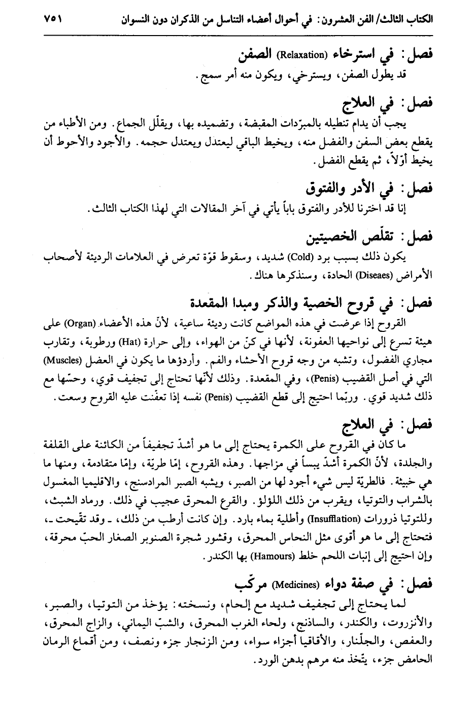 فصل فِي اسنرخاء الصفن: قد يطول الصفن ويسترخي وَيكون مِنْهُ أَمر سمج. فصل فيالعلاج: يجب أَن يدام تنطيله بالمبردات المقبضة وتضميده بهَا ويقلّل الْجِمَاع. وَمن الْأَطِبَّاء من يقطع بعض السفن وَالْفضل مِنْهُ ويخَيط الْبَاقِي ليعتدل ويعتدل حجمه. والأجود والأحوط أَن يخيط أَولا ثمَّ يقطع الْفضل. فصل فِي الأدروالفتوق: إِنَّا قد اخترنا للادر والفترق بَابا يَأْتِي فِي آخر المقالات الَّتِي لهَذَا الْكتاب الثَّالِث. فصل فِي تقلص الخصيتين: يكون ذَلِك بِسَبَب برد شَدِيد وَسُقُوط قُوَّة تعرض فِي العلامات الرَّديئَة لأَصْحَاب لأمراض الحادة وسنذكرها هُنَاكَ. فصل فِي قُرُوح الخصية وَالذكر ومبدأ المقعدة: تسرع إِلَى نَوَاحِيهَا العفونة لِأَنَّهَا فِي كن من الْهَوَاء والى حرارة ورطوبة وتقارب مجاري الفضول وتشبه من وَجه قُرُوح الأحشاء والفم. وأردؤها مَا يكون فِي العضل الَّتِي فِي أصل الْقَضِيب وَفِي المقعدة. وَذَلِكَ لِأَنَّهَا تحْتَاج إِلَى تجفيف قوي وحسها مَعَ ذَلِك شَدِيد قوي. وَرُبمَا احْتِيجَ إِلَى قطع الْقَضِيب نَفسه إِذا تعفنت عَلَيْهِ القروح وسعت. فصل فِي العلاج: مَا كَانَ من القروح على الكمرة يحْتَاج إِلَى مَا هُوَ أَشد تجفيفاَ من الكائنة على القلفة والجلدة لِأَن الكمرة أَشد يبساً فِي مزاجها. وَهَذِه القروح إِمَّا طرية وَإِمَّا متقادمة وَمِنْهَا مَا هِيَ خبيثة. فالطرية لَيْسَ شَيْء أَجود لَهَا من الصَّبْر وَيُشبه الصَّبْر المرداسنج والاقليميا المغسول بِالشرابِ والتوتيا وَيقرب من ذَلِك اللُّؤْلُؤ. والقرع المحرق عَجِيب فِي ذَلِك. ورماد الشبث وللتوتيا ذرورات وأطلية بِمَاء بَارِد. وَإِن كَانَت أرطب من ذَلِك - وَقد تقتحت - فتحتاج إِلَى مَا هُوَ أقوى مثل النّحاس المحرق وقشور شَجَرَة الصنوبر الصغار الْحبّ محرقة وَإِن احْتِيجَ إِلَى إنبات اللَّحْم خلط بهَا الكندر. فصل فِي صفة دَوَاء مركّب: لما يحْتَاج إِلَى تجفيف شَدِيد مَعَ إلحام ونسخته: يُؤْخَذ من التوتيا وَالصَّبْر والأنزروت والكندر والساذنج ولحاء الغرب المحرق والشبّ الْيَمَانِيّ والزاج المحرق والعفص والجلّنار والأقاقيا أَجزَاء سَوَاء وَمن الزنجار جُزْء وَنصف وَمن أقماع الرُّمَّان الحامض جُزْء يتَّخذ مِنْهُ مرهم بدهن الْورْد.