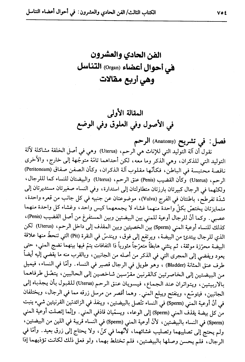 الْفَنّ الْحَادِي وَالْعشْرُونَ أَحْوَال أَعْضَاء التناسل وَهِي أَربع مقالات: الْمقَالة الأولى الْأُصُول والعلوق والوضع فصل فِي تشريح الرَّحِم نقُول أَن آلَة التوليد الَّتِي للأناث هِيَ الرَّحِم وَهِي فِي أصل الْخلقَة مشاكلة لالة التوليد الَّتِي للذكران وَهِي الذّكر وَمَا مَعَه لَكِن أحداهما تَامَّة متوجهة إِلَى خَارج وَالْأُخْرَى نَاقِصَة محتبسة فِي الْبَاطِن فَكَأَنَّهَا مقلوب الة الذكران وَكَأن الصفن صفاق الرَّحِم وَكَأن الْقَضِيب عنق الرَّحِم والبيضتان للنِّسَاء كَمَا للرِّجَال لكنهما فِي الرِّجَال كبيرتان بارزتان متطاولتان إِلَى استدارة وَفِي النِّسَاء صغيرتان مستديرتان إِلَى شدَّة تفرطح باطنتان فِي الْفرج موضوعتان عَن جَنْبَيْهِ فِي كل جَانب من قَعْره وَاحِدَة متمايزتان يخْتَص بِكُل وَاحِدَة مِنْهُمَا غشاء لَا يجمعهما كيس وَاحِد وغشاء كل وَاحِدَة مِنْهُمَا عصبي. وكما أَن للرِّجَال أوعية للمني بَين البيضتين وَبَين المستفرغ من أصل الْقَضِيب كَذَلِك للنِّسَاء أوعية الْمَنِيّ بَين الخصيتين وَبَين المقذف إِلَى دَاخل الرَّحِم لَكِن المذى للرِّجَال يبتدىء من الْبَيْضَة ويرتفع إِلَى فَوق ويندس فِي النقرة الَّتِي تنحط مِنْهَا علاقَة الْبَيْضَة محرزة موثقة ثمَّ ينثني هابطاً متعرّجاً مثوربا ذَا التفافات يتم فِيهَا بَينهمَا نضج الْمَنِيّ حَتَّى يعود ويفضي إِلَى المجرى الَّتِي فِي الذّكر من أَصله من الْجَانِبَيْنِ وبالقرب مِنْهُ مَا يقْضِي إِلَيْهِ أَيْضا طرف عنق المثانة وَهُوَ طَوِيل فِي الرِّجَال قصير فِي النِّسَاء. وَأما فِي النِّسَاء فيميل من البيضتين إِلَى الخاصرتين كالقرنين مقوسين شاخصين إِلَى الحالبين يتَّصل طرفاهما بالأربيتين ويتواتران عِنْد الْجِمَاع فيسويان عنق الرَّحِم للقبول بِأَن يجذباه إِلَى الْجَانِبَيْنِ فيتوسع وينفتح ويبلع الْمَنِيّ. وهما أقصر من مُرْسل زرقه مِمَّا فِي الرِّجَال ويختلفان فِي أَن أوعية الْمَنِيّ فِي النِّسَاء تتصل بالبيضتين وَينفذ فِي الزائدتين القرنيتين شَيْء ينْبت من كل بَيْضَة يقفف الْمَنِيّ إِلَى الْوِعَاء ويسميان قاذفي الْمَنِيّ. وَإِنَّمَا اتَّصَلت أوعية الْمَنِيّ فِي النِّسَاء بالبيضتين لِأَن أوعية الْمَنِيّ فِي النِّسَاء قريبَة فِي اللين من البيضتين وَلم يحْتَج إِلَى تصليبهما وتصليب غشائهما لِأَنَّهُمَا فِي كن وَلَا يحْتَاج إِلَى زرق بعيد. وَأما فِي الرِّجَال فَلم يحسن وَصلهَا بالبيضتين فَلم تختلط بهما وَلَو فعل ذَلِك لكَانَتْ تؤذيهما إِذا