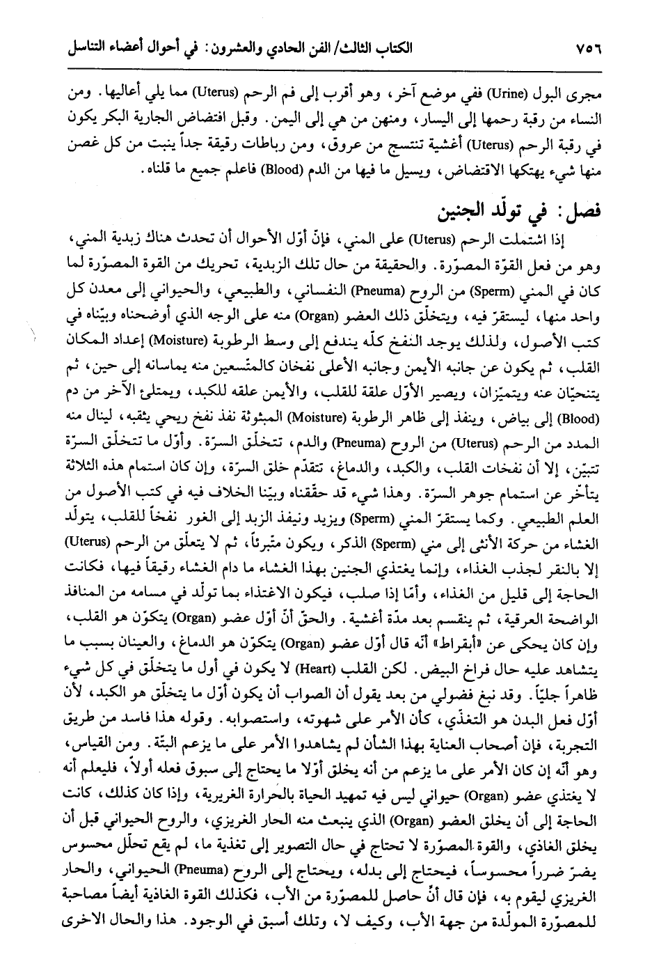 مجْرى الْبَوْل فَفِي مَوضِع آخر وَهُوَ أقرب إِلَى فَم الرَّحِم مِمَّا يَلِي أعاليها. وَمن النِّسَاء من رَقَبَة رَحمهَا إِلَى الْيَسَار ومنهن من هِيَ مِنْهَا إِلَى الْيَمين. وَقبل افتضاض الْجَارِيَة الْبكر يكون فِي رَقَبَة الرَّحِم أغشية تنتسج من عروق وَمن رباطات رقيقَة جدا ينْبت من كل غُصْن مِنْهَا شَيْء يهتكها الافتضاض ويسيل مَا فِيهَا من الدَّم فَاعْلَم جَمِيع مَا قُلْنَاهُ. فصل فِي تولّد الْجَنِين إِذا اشْتَمَلت الرَّحِم على الْمَنِيّ فَإِن أول الْأَحْوَال أَن تحدث هُنَاكَ زبدية الْمَنِيّ وَهُوَ من فعل الْقُوَّة المصورة. والحقيقة من حَال تِلْكَ الزبدية تَحْرِيك من الْقُوَّة المصورة لما كَانَ فِي الْمَنِيّ من الرّوح النفساني والطبيعي والحيواني إِلَى مَعْدن كل وَاحِد مِنْهَا ليستقرٌ فِيهِ ويتخلّق ذَلِك الْعُضْو مِنْهُ على الْوَجْه الَّذِي أوضحناه وبيناه فِي كتب الْأُصُول وَلذَلِك يُوجد النفخ كُله ينْدَفع إِلَى وسط الرُّطُوبَة إعداداً لمَكَان الْقلب ثمَّ يكون عَن جَانِبه الْأَيْمن وجانبه الْأَعْلَى نفخان كالمتسعين مِنْهُ يماسانه إِلَى حِين ثمَّ يتنحيان عَنهُ ويتميزان وَيصير الأولى علقَة للقلب والأيمن علقَة للكبد ويمتلىء الاخر من دم إِلَى بَيَاض وَينفذ إِلَى ظَاهر الرُّطُوبَة المبثوثة نفذ نفخ ريحي يثقبه لينال مِنْهُ المدد من الرَّحِم من الرّوح وَالدَّم وتتخلق السُّرَّة. وَأول مَا تتخلّق السرّة تتبين إِلَّا أَن نفخات الْقلب والكبد والدماغ تتقدم خلق السُّرَّة لمان كَانَ استمام هَذِه الئلاثة يتَأَخَّر عَن استمام جَوْهَر السُّرَّة. وَهَذَا شَيْء قد حققناه وَبينا الْخلاف فِيهِ فِي كتب الْأُصُول من الْعلم الطبيعى. وكما يسْتَقرّ الْمَنِيّ ويزبد وَينفذ الزّبد إِلَى الْغَوْر نفخاً للقلب يتَوَلَّد الغشاء من حَرَكَة مني الْأُنْثَى إِلَى مني الذّكر وَيكون متبرئاً ثمَّ لَا يتَعَلَّق من الرَّحِم إِلَّا بالنقر لجذب الْغذَاء وانما يغتذي الْجَنِين بِهَذَا الغشاء مَا دَامَ الغشاء رَقِيقا فِيهَا فَكَانَت الْحَاجة إِلَى قَلِيل من الْغذَاء. وَأما إِذا صلب فَيكون الاغتذاء بِمَا توتد فِي مسامه من المنافذ الْوَاضِحَة العرقية ثمَّ يَنْقَسِم بعد مُدَّة أغشية. وَالْحق أَن أول عُضْو يتكون هُوَ الْقلب لمان كَانَ يحْكى عَن أبقراط أَنه قَالَ أول عُضْو يتكون هُوَ الدِّمَاغ والعينان بِسَبَب مَا يُشَاهد عَلَيْهِ حَال فراخ الْبيض لَكِن الْقلب لَا يكون فِي أول مَا يتخفق فِي كل شَيْء ظَاهرا جليُّا. وَقد نبغ فُضُولِيّ من بعد يَقُول أَن الصَّوَاب أَن يكون أول مَا يتخلّق هُوَ الكبد لِأَن أول فعل الْبدن هُوَ التغذّي كَأَن الْأَمر على شَهْوَته واستصو ابه. وَقَوله هَذَا فَاسد من طَرِيق التجربة فَإِن أَصْحَاب الْعِنَايَة بِهَذَا الشَّأْن لم يشاهدوا الْأَمر على مَا يزْعم الْبَتَّةَ. وَمن الْقيَاس وَهُوَ أَنه إِن كَانَ الْأَمر على مَا يزْعم من أَنه يخلق أَولا مَا يحْتَاج إِلَى سبوق فعله أولاَ فَليعلم أَنه لَا يغتذي عُضْو حيواني لَيْسَ فِيهِ تمهيد الْحَيَاة بالحرارة الغريزية وَإِذا كَانَ كَذَلِك كَانَت الْحَاجة إِلَى أَن يخلق الْعُضْو الَّذِي ينبعث مِنْهُ الْحَار الغريزي وَالروح الحيواني قبل أَن يخلق الغاذي وَالْقُوَّة المصوّرة لَا تحْتَاج فِي حَال التَّصْوِير إِلَى تغذية مَا لم يَقع تحلّل محسوس يضر ضَرَرا محسوساً فَيحْتَاج إِلَى بدله وَيحْتَاج إِلَى الرّوح الحيواني والحار الغريزي ليقوم بِهِ فَإِن قَالَ أَنه حَاصِل للمصورة من الْأَب فَكَذَلِك الْقُوَّة الغاذية أَيْضا مصاحبة للمصورة المولدة من جِهَة الْأَب وَكَيف لَا وَتلك أسبق فِي الْوُجُود. هَذَا وَالْحَال الْأُخْرَى