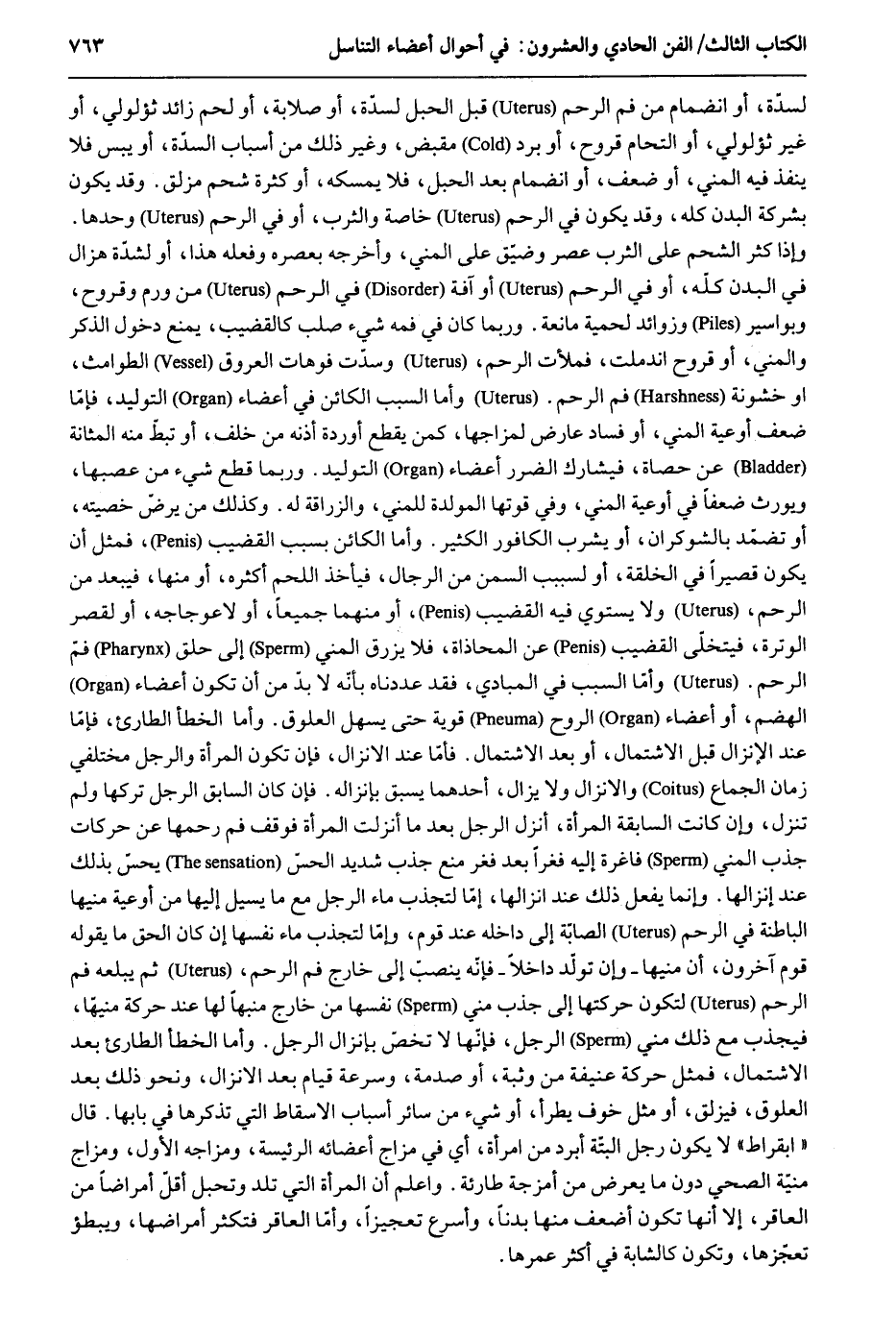 لسدّة أَو انضمام من فَم الرَّحِم قبل الْحَبل لسدة أَو صلابة أَو لحم زَائِد ثؤلولي أَو غير ثؤلولي أَو التحام قُرُوح أَو برد مقبض وَغير ذَلِك من أَسبَاب السدة أَو يبس فَلَا ينفذ فِيهِ الْمَنِيّ أَو صْعف أَو انضمام بعد الْحَبل فَلَا يمسِكهُ أَو كَثْرَة شَحم مزلق. وَقد يكون بشركة الْبدن كُله وَقد يكون فِي الرَّحِم خَاصَّة والثرب أَو فِي الرَّحِم وَحدهَا. وَإِذا كثر الشَّحْم على الثرب عصر وضيق على الْمَنِيّ وَأخرجه بعصره وَفعله هَذَا أَو لشدَّة هزال فِي الْبدن كُله أَو فِي الرَّحِم أَو آَفة فِي الرَّحِم من ورم وقروح وبواسير وزوائد لحمية مَانِعَة. وَرُبمَا كَانَ فِي فَمه شَيْء صلب كالقضيب يمْنَع دُخُول الذّكر والمني أَو قُرُوح اندملت فملأت الرَّحِم وسدّت فوهات الْعُرُوق الطوامث أَو خشونة فَم الرَّحِم. وَأما السَّبَب الْكَائِن فِي أَعْضَاء التوليد فإمَّا ضعف أوعية الْمَنِيّ أَو فَسَاد عَارض لمزاجها كمن يقطع أوردة أُذُنه من خلف أَو تبطُّ مِنْهُ المثانة عَن حَصَاة فيشارك الضَّرَر أَعْضَاء التولد. وَرُبمَا قطع شَيْء من عصبها وَيُورث ضعفا فِي أوعية الْمَنِيّ وَفِي قوتها المولدة للمني والزراقة لَهُ. وَكَذَلِكَ من يرض خصيته أَو تضمّد بالشوكران أَو يشرب الكافور الْكثير وَأما الْكَائِن بِسَبَب الْقَضِيب فَمثل أَن يكون قَصِيرا فِي الْخلقَة أَو لسَبَب السّمن من الرِّجَال فَيَأْخُذ اللَّحْم أَكْثَره أَو مِنْهَا فيبعد من الرَّحِم وَلَا يَسْتَوِي فِيهِ الْقَضِيب أَو مِنْهُمَا جَمِيعًا أَو لاعوجاجه أَو لقصر الوترة فيتخلى الْقَضِيب عَن الْمُحَاذَاة فَلَا يزرق الْمَنِيّ إِلَى حلق فَم الرَّحِم. وَأما السَّبَب فِي المبادي فقد عددناه بِأَنَّهُ لَا بُد من أَن تكون أَعْضَاء الهضم أَو أَعْضَاء الرّوح قَوِيَّة حَتَّى يسهل الْعلُوق. وَأما الخطا الطارىء فإمَّا عِنْد الْإِنْزَال قبل الاشتمال أَو بعد الاشتمال. فَأَما عِنْد الْإِنْزَال فَأن فَإِن كَانَ السَّابِق الرجل تَركهَا وَلم تنزل وَإِن كَانَت السَّابِقَة الْمَرْأَة أنزل الرجل بعد مَا أنزلت الْمَرْأَة فَوقف فَم رَحمهَا عَن حركات جذب الْمَنِيّ فاغرة إِلَيْهِ فغراً بعد فغر مَعَ جذب شَدِيد الْحس يحس بذلك عِنْد إنزالها. وَإِنَّمَا يفعل ذَلِك عِنْد إنزالها إِمَّا لتجذب مَاء الرجل مَعَ مَا يسيل إِلَيْهَا من أوعية منيها الْبَاطِنَة فِي الرَّحِم الصابة إِلَى دَاخله عِنْد قوم وَإِمَّا لتجذب مَاء نَفسهَا إِن كَانَ الْحق مَا يَقُوله قوم اخرون أَن منيها - وَإِن تولد دَاخِلا - فَإِنَّهُ ينصب إِلَى خَارج فَم الرَّحِم ثمَّ يبلغهُ فَم الرَّحِم لتَكون حركتها إِلَى جذب مني نَفسهَا من خَارج. منبهاً لَهَا عِنْد حَرَكَة منيها فيجذب مَعَ ذَلِك مني الرجل فَإِنَّهَا لَا تخص بإنزال الرجل. وَأما الْخَطَأ الطارىء بعد الاشتمال فَمثل حَرَكَة عنيفة من وثبة أَو صدمة وَسُرْعَة قيام بعد الْإِنْزَال وَنَحْو ذَلِك بعد الْعلُوق فيزلق أَو مثل خوف يطْرَأ أَو شَيْء من سَائِر أَسبَاب الْإِسْقَاط الَّتِي تذكرها فِي بَابهَا. قَالَ أبقراط: لَا يكون رجل الْبَتَّةَ أبرد من امْرَأَة أَي فِي مزاج أَعْضَائِهِ الرئيسة ومزاجه الأول ومزاج منيه الصحي دون مَا يعرض من أمزجة طارئة. وَاعْلَم أَن الْمَرْأَة الَّتِي تَلد وتحبل أقل أمراضاً من العاقر إِلَّا أَنَّهَا تكون أَضْعَف مِنْهَا بدناً وأسرع تعجيزاً. وَأما العاقر فتكثر أمراضها ويبطؤ تعجزها وَتَكون كالشابة فِي أَكثر عمرها.