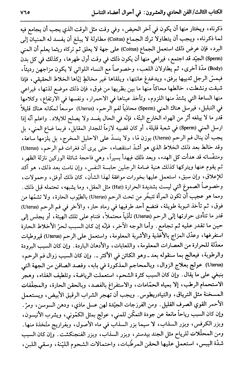 ذَكرْنَاهُ ويختار مِنْهَا أَن يكون فِي آخر الْحيض وَفِي وَقت مثل الْوَقْت الَّذِي يجب أَن يُجَامع فِيهِ لما ذَكرْنَاهُ وَيجب أَن يتطاولا ترك الْجِمَاع مطاولة لَا يبلغ أَن يفْسد لَهُ المنيان إِلَى الْبرد فَإِن عرض ذَلِك اسْتعْمل الْجِمَاع على جِهَة لَا يعلق ثمَّ تركاه ريثما يعلم أَن الْمَنِيّ الْجيد قد اجْتمع فيراعي مِنْهَا أَن يكون ذَلِك فِي وَقت أول طهرهَا وَكَذَلِكَ فِي كل بدن مُدَّة أُخْرَى ثمَّ يطاولان اللّعب وخصوصاً مَعَ النِّسَاء اللواتي لَا يكون مزاجهن رديئاً فيمس الرجل ثدييها بِرِفْق ويدغدع عانتها ويلقاها غير مخالطٍ إِيَّاهَا الخلاط الْحَقِيقِيّ فَإِذا شبقت ونشطت خالطها محاكاً مِنْهَا مَا بَين بظريها من فَوق فَإِن ذَلِك مَوضِع لذتها فيراعي مِنْهَا السَّاعَة الَّتِي يشْتَد مِنْهَا اللنروم وَتَأْخُذ عَيناهَا فِي الاحمرار ونفسها فِي الِارْتفَاع وكلامها فِي التبلبل فَيُرْسل هُنَاكَ الْمَنِيّ محاذياً لفم الرَّحِم موسعاً لمكانه هُنَاكَ قليلاَ قدر مَا لَا يبلغهُ أثر عَن الْهَوَاء الْخَارِج الْبَتَّةَ فَإِنَّهُ فِي الْحَال يفْسد وَلَا يصلح للإيلاد. وَاعْلَم أَنه إِذا أرسل الْمَنِيّ فِي شُعْبَة قَليلَة أَو كَانَ قضيبه لَازِما للجدار الْمُقَابل فَرُبمَا ضَاعَ الْمَنِيّ بل يجب أَن ينَال فَم الرَّحِم بِوَزْن مَا وَلَا ينسد على الإحليل الْمخْرج بل يلْزمهَا سَاعَة وَقد خالط بعد ذَلِك الخلاط الَّذِي هُوَ أَشد استقصاء حَتَّى يرى أَن فغرات فَم الرَّحِم ومتنفّساته قد هدأت كل الهدء وَبعد ذَلِك فيهدأ يَسِيرا وَهِي فاحجة شَائِلَة الْوَرِكَيْنِ نازلة الظّهْر ثمَّ يقوم عَنْهَا وَيَتْرُكهَا كَذَلِك هنيَّة ضامة الرجلَيْن حابسة النَّفس وَإِن نَامَتْ بعد ذَلِك فَهُوَ آكِد للإعلاق وَإِن سبق فَاسْتعْمل عَلَيْهَا بخورات مُوَافقَة لهَذَا الشَّأْن كَانَ ذَلِك أوفق وحمولات وخصوصاً الصموغ الَّتِي لَيست بشديدة الْحَرَارَة مثل الْمقل وَمَا يُشبههُ تحتمله قبل ذَلِك. وَمِمَّا هُوَ عَجِيب أَن تكون الْمَرْأَة تتبخر من تَحت الرَّحِم بالطيوب الحارة وَلَا تشمها من فَوق ثمَّ تَأْخُذ أنبوبة طَوِيلَة فتضع أحد طرفيها فِي رماد حَار والاخر فِي فَم الرَّحِم قدر مَا تتأدى حَرَارَتهَا إِلَى الرَّحِم تأدياً مُحْتملا فتنام على تِلْكَ الْهَيْئَة أَو يجلس إِلَى حِين مَا تقدر عَلَيْهِ ثمَّ تجامع. وَأما الْوَجْه الآخر فَإِنَّهُ إِن كَانَ السَّبَب لحر الأخلاط الحارة اسفرغها وَعدل المزاج بالأغذية والأشربة الْمَعْلُومَة وَاسْتعْمل على الرَّحِم قيروطيات معدّلة للحرارة من العصارات الْمَعْلُومَة واللعابات والأدهان الْبَارِدَة. وَإِن كَانَ السَّبَب الْبُرُودَة والرطوبة فيعالج بِمَا سنقوله بعد - وَهُوَ الْكَائِن فِي الْأَكْثَر - وَإِن كَانَ السَّبَب زَوَال فَم الرَّحِم عولج بعلاج الزَّوَال وبالمحاجم الْمَذْكُورَة فِي بَابه وفصد الصَّافِن من الْجِهَة وَإِن كَانَ السَّبَب كَثْرَة الشَّحْم اسْتعْملت الرياضة وتلطيف الْغذَاء وهجر الاستحمام الرطب إِلَّا بمياه الحمّامات والاستفراغ بالفصد وبالحقن الحارة والمجففات المسخنة مثل الترياق والتيادريطوس. وَيجب أَن تهجر الشَّرَاب الرَّقِيق الْأَبْيَض وَيسْتَعْمل الْأَحْمَر الْقوي اصرف الْقَلِيل. وَمن الفرزجات الجيدة لَهُنَّ عسل ماذي ودهن السوسن وَمر. وَإِن كَانَ السَّبَب رياحاً مَانِعَة عَن جودة التَّمَكُّن للمني عولج بمثلى الكمّوني وَيشْرب الأنيسون وبزر الكرفس وبزر السذاب لَا سِيمَا بزر السذاب فِي مَاء الْأُصُول وبفراريج متخذة مِنْهَا. وَمن المحللات للرياح مثل الجندبيدستر وبزر السذاب وبزر الفنجنكشت. وَإِن كَانَ السَّبَب شدَّة اليبس اسْتعْمل عَلَيْهَا الحقن المرطبات واحتمالات الشحوم اللينة وَسقي اللَّبن