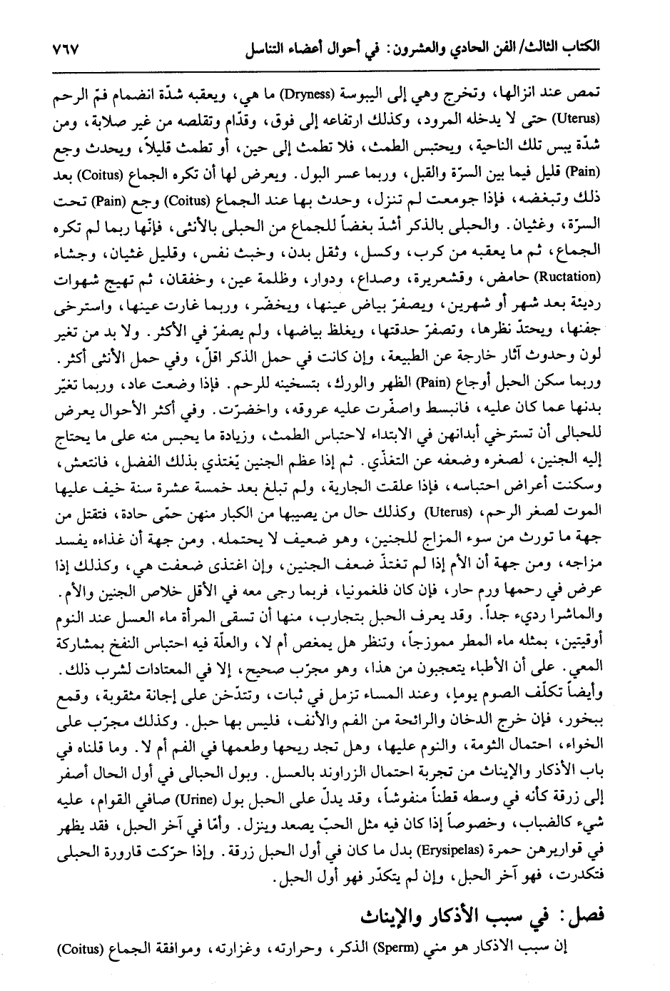 تمص عِنْد إنزالها وَتخرج وَهِي إِلَى اليبوسة مَا هِيَ ويعقبه شدَّة انضمام فَم الرَّحِم حَتَّى لَا يدْخلهُ المرود وَكَذَلِكَ ارتفاعه إِلَى فَوق وَقُدَّام وتقلصه من غير صلابة وَمن شدَّة يبس تِلْكَ النَّاحِيَة ويحتبس الطمث فَلَا تطمث إِلَى حِين أَو تطمث قليلاَ وَيحدث وجع قَلِيل فِيمَا بَين السُّرَّة والقبل وَرُبمَا عسر الْبَوْل. ويعرض لَهَا أَن تكره الْجِمَاع بعد ذَلِك وتبغضه فَإِذا جومعت لم تنزل وَحدث بهَا عِنْد الْجِمَاع وجع تَحت السُّرَّة وغثيان. والحبلى بِالذكر أَشد بغضاَ للجماع من الحبلى بِالْأُنْثَى فَإِنَّهَا رُبمَا لم تكره الْجِمَاع ثمَّ مَا يعقبه من كرب وكسل وَثقل بدن وخبث نفس وَقيل غثيان وجشاء حامض وقشعريرة وصداع ودوار وظلمة عين وخفقان ثمَّ تهيج شهوات رَدِيئَة بعد شهر أَو شَهْرَيْن ويصفر بَيَاض عينهَا ويخضر وَرُبمَا غارت عينهَا واسترخى جفنها ويحتد نظرها وَتَصْفَر حدقتها ويغلظ بياضها وَلم يصفر فِي الْأَكْثَر. وَلَا بُد من تغيّر لون وحدوث آثَار خَارِجَة عَن الطبيعة وَإِن كَانَ فِي حمل الذّكر أقل وَفِي حمل الْأُنْثَى أَكثر. وَرُبمَا سكن الْحَبل أوجاع الظّهْر والورك بتسخينه للرحم. فَإِذا وضعت عَاد وَرُبمَا تغير بدنهَا عَمَّا كَانَ عَلَيْهِ فانبسط واصفرت عَلَيْهِ عروقه واخضرت. وَفِي أَكثر الْأَحْوَال يعرض للحبالى أَن تستزخي أبدانهن فِي الِابْتِدَاء لاحتباس الطمث وَزِيَادَة مَا يحبس مِنْهُ على مَا يحْتَاج إِلَيْهِ الْجَنِين لصغره وَضَعفه عَن التغذي. ثمَّ إِذا عظم الْجَنِين يغتذي بذلك الْفضل فانتعش وسكنت أعرض احتباسه فَإِذا علقت الْجَارِيَة وَلم تبلغ بعد خمس عشرَة سنة خيف عَلَيْهَا الْمَوْت لصِغَر الرَّحِم وَكَذَلِكَ حَال من يُصِيبهَا من الْكِبَار مِنْهُنَّ حمى حادة فَتقْتل من جِهَة مَا تورث من سوء المزاج للجنين وَهُوَ ضَعِيف لَا يحْتَملهُ. وَمن جِهَة أَن غذاءه يفْسد مزاجه وَمن جِهَة أَن الْأُم إِذا لم تغتذ ضعف الْجَنِين وَإِن اغتذي ضعفت هِيَ وَكَذَلِكَ إِذا عرض فِي رَحمهَا ورم حَار فَإِن كَانَ فلغمونيا فَرُبمَا رجى مَعَه فِي الْأَقَل خلاص الْجَنِين وَالأُم. والماشرا رَدِيء جدا. وَقد يعرف الْحَبل بتجارب مِنْهَا أَن تسقى الْمَرْأَة مَاء الْعَسَل عِنْد النّوم أوقيتين بِمثلِهِ مَاء الْمَطَر ممزوجاً وَتنظر هَل يمغص أم لَا وَالْعلَّة فِيهِ احتباس النفخ بمشاركة المعي. على أَن الْأَطِبَّاء يتعجبون من هَذَا وَهُوَ مجرب صَحِيح إِلَّا فِي المعتادات لشرب ذَلِك. وَأَيْضًا تكلّف الصَّوْم يَوْمًا وَعند الْمسَاء تزمل فِي ثِيَاب وتتدخن على إجانة مثقوبة وقمع ببخور فَإِن خرج الدُّخان والرائحة من الْفَم وَالْأنف فَلَيْسَ يها حَبل. وَكَذَلِكَ مجرب على الخواء احْتِمَال الثومة وَالنَّوْم عَلَيْهَا وَهل تَجِد رِيحهَا وطعمها فِي الْفَم أم لَا. وَمَا قُلْنَاهُ فِي بَاب الإذكار والإيناث من تجربة احْتِمَال الزراوند بالعسل. وَبَوْل الحبالى فِي أول الْحَال أصفر إِلَى زرقة كَأَن فِي وَسطه قطناً منفوشاً وَقد يدل على الْحَبل بَوْل صافي القوام عَلَيْهِ شَيْء كالهضاب وخصوصاَ إِذا كَانَ فِيهِ مثل الْحبّ يصعد وَينزل. وَأما فِي اخر الْحَبل فقد يظْهر فِي قواريرهن حمرَة بدل مَا كَانَ فِي أول الْحَبل زرقة. واذا حركت قَارُورَة الحبلى فتكدرت فَهُوَ آخر الْحَبل وان لم يتكدّر فَهُوَ أول الْحَبل. فصبل فِي سَبَب الإذكار والايناث: إِن سَبَب الإذكار هُوَ مني الذّكر وحرارته وغزازته وموافقة الْجِمَاع