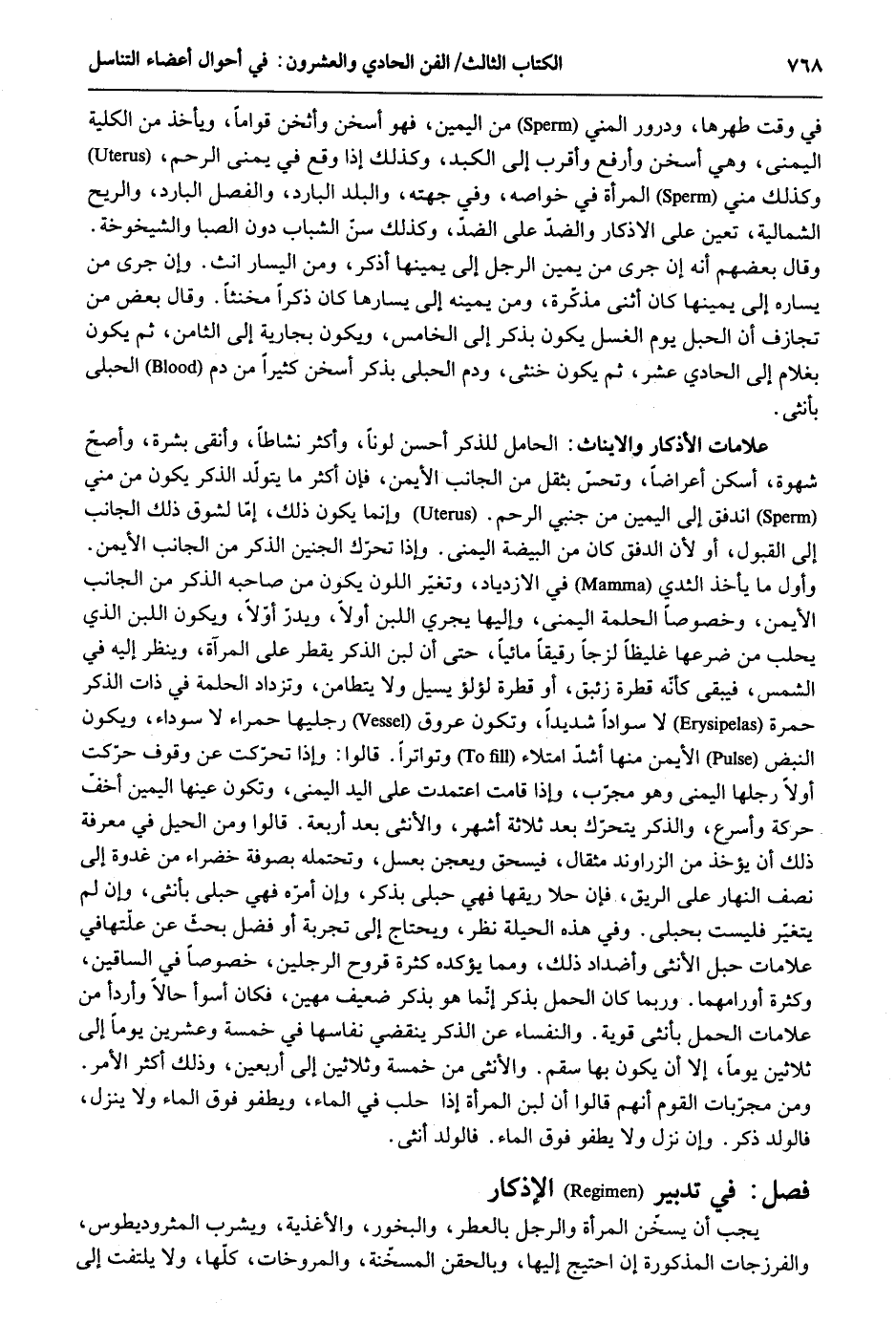 فِي وَقت طهرهَا ودرور الْمَنِيّ من الْيَمين فَهُوَ أسخن وأثخن قواماً وَيَأْخُذ من الْكُلية الْيُمْنَى وَهِي أسخن وَأَرْفَع وَأقرب إِلَى الكبد وَكَذَلِكَ إِذا وَقع فِي يمنى الرَّحِم وَكَذَلِكَ مني الْمَرْأَة فِي خواصه وَفِي جِهَته والبلد الْبَارِد والفصل الْبَارِد وَالرِّيح الشمالية تعين على الإذكار والضدعلى الضِّدّ وَكَذَلِكَ سنّ الشَّبَاب دون الصِّبَا والشيخوخة. وَقَالَ بَعضهم أَنه إِن جرى من يَمِين الرجل إِلَى يَمِينهَا أذكر وَمن الْيَسَار أنث. وَإِن جرى من يسَاره إِلَى يَمِينهَا كَانَ أُنْثَى مذكّرة وَمن يمنيه إِلَى يسارها كَانَ ذكرا مخنثاً. وَقَالَ بعض من تجازف أَن الْحَبل يَوْم الْغسْل يكون بِذكر إِلَى الْخَامِس وَيكون بِجَارِيَة إِلَى الثَّامِن ثمَّ يكون بِغُلَام إِلَى الْحَادِي عشر ثمَّ يكون خُنْثَى وَدم الحبلى بِذكر أسخن كثيرا من دم الحبلى بأنثى. عَلَامَات الإذكار والإيناث: الْحَامِل للذّكر أحسن لوناً وَأكْثر نشاطاً وأنقى بشرة وَأَصَح شَهْوَة وأسكن أعراضاً وتحسّ بثقل من الْجَانِب الْأَيْمن فَإِن أَكثر مَا يتَوَلَّد الذّكر يكون من مني اندفق إِلَى الْيَمين من جَنْبي الرَّحِم. وَإِنَّمَا يكون ذَلِك إِمَّا لشوق ذَلِك الْجَانِب إِلَى الْقبُول أَو لِأَن الدفق كَانَ من الْبَيْضَة الْيُمْنَى. وَإِذا تحرّك الْجَنِين الذّكر تحرّك من الْجَانِب الْأَيْمن. وَأول مَا يَأْخُذ الثدي فِي الازدياد وَتغَير اللَّوْن يكون من صَاحِبَة الذّكر من الْجَانِب الْأَيْمن وخصوصاً الحلمة الْيُمْنَى وإليها يجْرِي اللَّبن أَولا ويدر أَولا وَيكون اللَّبن الَّذِي يحلب من ضرْعهَا غليظاً لزجاً رَقِيقا مائياً حَتَّى إِن لبن الذّكر يقطر على المراَة وَينظر إِلَيْهِ فِي الشَّمْس فَيبقى كَأَنَّهُ قَطْرَة زئبق أَو قَطْرَة لُؤْلُؤ يسيل وَلَا يتطامن وتزداد الحلمة فِي ذَات الذّكر حمرَة لَا سواداً شَدِيدا وَتَكون عروق رِجْلَيْهَا حَمْرَاء لَا سَوْدَاء وَيكون النبض الْأَيْمن مِنْهَا أَشد امتلاء وتواتراً. قَالُوا: وَإِذا تحرّكت عَن وقُوف حركت أَولا رجلهَا الْيُمْنَى وَهُوَ مجرّب وَإِذا قَامَت اعتمدت على الْيَد الْيُمْنَى وَتَكون عينهَا الْيَمين أخف حَرَكَة وأسرع وَالذكر يَتَحَرَّك بعد ثَلَاثَة أشهر وَالْأُنْثَى بعد أَرْبَعَة. قَالُوا وَمن الْحَبل فِي معرفَة ذَلِك أَن يُؤْخَذ من الزراوند مِثْقَال فيسحق ويعجن بِعَسَل وتحتمله بصوفة خضراء من غدْوَة إِلَى نصف النَّهَار على الرِّيق فَإِن حلا رِيقهَا فَهِيَ حُبْلَى بِذكر وَإِن أمرَه فَهِيَ حُبْلَى بأنثى وَإِن لم يتَغَيَّر فَلَيْسَتْ بحبلى. وَفِي هَذِه الْحِيلَة نظر وَيحْتَاج إِلَى تجربة أَو فضل بحث عَن علتها فِي عَلَامَات حَبل الْأُنْثَى وأضداد ذَلِك. وَمِمَّا يؤكده كَثْرَة قُرُوح الرجلَيْن خُصُوصا فِي السَّاقَيْن وَكَثْرَة أورامهما. وَرُبمَا كَانَ الْحمل بِذكر إِنَّمَا هُوَ بِذكر ضَعِيف مهين فَكَانَ أَسْوَأ حَالا وأردأ من. عَلَامَات الْحمل بأنثى قَوِيَّة. وَالنُّفَسَاء عَن الذّكر يَنْقَضِي نفَاسهَا فِي خَمْسَة وَعشْرين يَوْمًا إِلَى ثَلَاثِينَ يَوْمًا إِلَّا اْن يكون بهَا سقم. وَالْأُنْثَى من خَمْسَة وَثَلَاثِينَ إِلَى أَرْبَعِينَ ودْلك أَكثر الْأَمر. وَمن مجربات الْقَوْم أَنهم قَالُوا أَن لبن الْمَرْأَة إِذا حلب فِي المَاء ويطفو فَوق المَاء وَلَا ينزل فَالْوَلَد ذكر. وَإِن نزل وَلَا يطفو فَوق المَاء فَالْوَلَد أُنْثَى فصل فِي تَدْبِير الإذكار يجب أَن يسخن الْمَرْأَة وَالرجل بالعطر والبخور والأغذية وَيشْرب المثروديطوس والفرزجات الْمَذْكُورَة إِن احْتِيجَ إِلَيْهَا وبالحقن المسخنة والمروخات كلهَا وَلَا يلْتَفت إِلَى