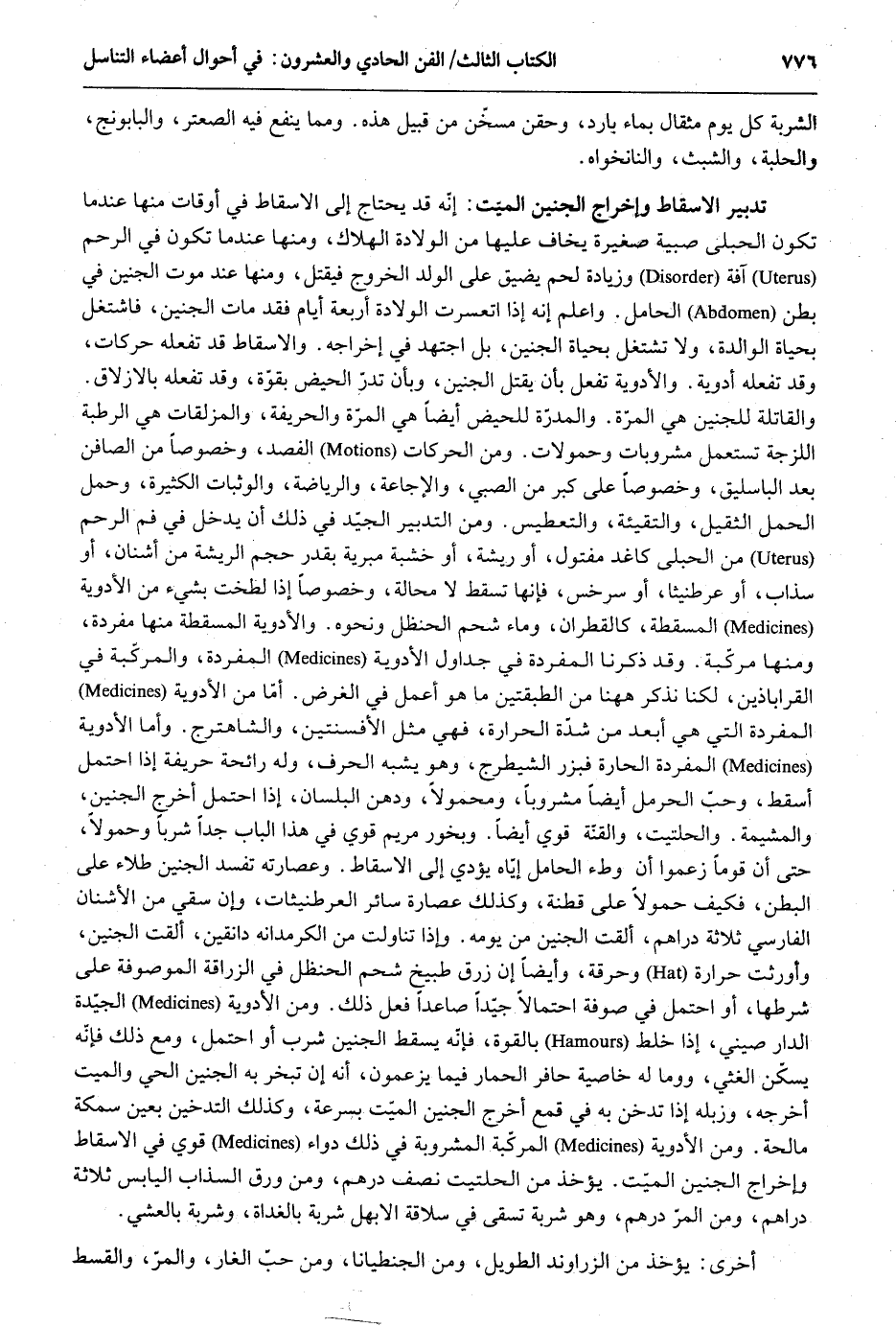 الشربة كل يَوْم مِثْقَال بِمَاء بَارِد وحقن مسخّن من قبيل هَذِه. وَمِمَّا ينفع فِيهِ الصعتر والبابونج والحلبة والشبث وَا لنا نخواه. تَدْبِير الْإِسْقَاط وَإِخْرَاج الْجَنِين الْمَيِّت: إِنَّه قد يحْتَاج إِلَى الْإِسْقَاط فِي أَوْقَات مِنْهَا عِنْدَمَا تكون الحبلى صبية صَغِيرَة يخَاف عَلَيْهَا من الْولادَة الْهَلَاك وَمِنْهَا عِنْدَمَا تكون فِي الرَّحِم آفَة وَزِيَادَة لحم يضيق على الْوَلَد الْخُرُوج فَيقْتل وَمِنْهَا عِنْد موت الْجَنِين فِي بطن الْحَامِل. وَاعْلَم أَنه إِذا تعسرت الْولادَة أَرْبَعَة أَيَّام فقد مَاتَ الْجَنِين فاشتغل بحياة الوالدة وَلَا تشتغل بحياة الْجَنِين بل اجْتهد فِي إِخْرَاجه. والإسقاط قد تَفْعَلهُ حركات وَقد تَفْعَلهُ أدوية. والأدوية تفعل بِأَن يقتل الْجَنِين وَبِأَن تدر الْحيض بِقُوَّة وَقد تَفْعَلهُ بالإزلاق. والقاتلة للجنين هِيَ الْمرة. والمدرة للْحيض أَيْضا هِيَ الْمرة والحريفة والمزلقات هِيَ الرّطبَة اللزجة تسْتَعْمل مشروبات وحمولات. وَمن الحركات الفصد وخصوصاَ من الصَّافِن بعد الباسليق وخصوصاَ على كبر من الصَّبِي والإجاعة والرياضة والوثبات الْكَثِيرَة وَحمل الْحمل الثقيل والتقيئة والتعطيس. وَمن التَّدْبِير الْجيد فِي ذَلِك أَن يدْخل فِي فَم الرَّحِم من الحبلى كاغد مفتول أَو ريشة أَو خَشَبَة مبرية بِقدر حجم الريشة من أشنان أَو سذاب أَو عرطنيثا أَو سرخس فَإِنَّهَا تسْقط لَا محَالة وخصوصاً إِذا لطخت بِشَيْء من الْأَدْوِيَة المسقطة كالقطران وَمَاء شَحم الحنظل وَنَحْوه. والأدوية المسقطة مِنْهَا مُفْردَة وَمِنْهَا مركبة. وَقد ذكرنَا المفردة فِي جداول الْأَدْوِيَة المفردة والمركبة فِي القراباذين لَكنا نذْكر هَهُنَا من الطبقتين مَا هُوَ أعمل فِي الْغَرَض. أما من الْأَدْوِيَة المفردة الَّتِي هِيَ أبعد من شدَّة الْحَرَارَة فَهِيَ مثل الأفسنتين والشاهترج. وَأما الْأَدْوِيَة المفردة الحارة فبزر الشيطرج وَهُوَ يشبه الْحَرْف وَله رَائِحَة حريفة إذأ احْتمل أسقط وحبّ الحرمل أَيْضا مشروباً ومحمولاً ودهن البلسان إِذا احْتمل أخرج الْجَنِين والمشيمة والحلتيت والقتة قوي أيضاَ. وبخور مَرْيَم قوي فِي هَذَا الْبَاب جدا شرباً وحمولاً حَتَّى إِن قوما زَعَمُوا أَن وَطْء الْحَامِل إِيَّاه يُؤدى إِلَى الْإِسْقَاط. وعصارته تفْسد الْجَنِين طلاء على الْبَطن فَكيف حمولاً على قطنة وَكَذَلِكَ عصارة سَائِر العرطنيثات وَإِن سقِِي من الأشنان الْفَارِسِي ثَلَاثَة دَرَاهِم أَلْقَت الْجَنِين من يَوْمه. وَإِذا تناولت من الكرمدانة دانقين أَلْقَت الْجَنِين وأورثت حرارة وحرقة وَأَيْضًا إِن زرق طبيخ شَحم الحنظل فِي الزراقة الموصوفة على شَرطهَا أَو احْتمل فِي صوفة احتمالاَ جيدا صاعدأ فعل ذَلِك. وَمن الْأَدْوِيَة الجيدة الدارصيني إِذا خلط بِالْقُوَّةِ فَإِنَّهُ يسْقط الْجَنِين شرب أَو احْتمل وَمَعَ ذَلِك فَإِنَّهُ يسْقط الْجَنِين شرب أَو احْتمل وَمَعَ ذَلِك فَإِنَّهُ يسكن الغثي وَمِمَّا لَهُ خاصية: حافر الْحمار فِيمَا يَزْعمُونَ أَنه إِن تبخر بِهِ الْجَنِين الْحَيّ وَالْمَيِّت أخرجه وزبله إِذا تدخن بِهِ فِي قمع أخرج الْجَنِين الْمَيِّت بِسُرْعَة وَكَذَلِكَ التدخين بِعَين سَمَكَة مالحة. وَمن الادوية المركبة المشروبة فِي ذَلِك دَوَاء قوي فِي الْإِسْقَاط واخراج الْجَنِين الْمَيِّت. يُؤْخَذ عَن الحلتيت نصف دِرْهَم وَمن ورق السذاب الْيَابِس ثَلَاثَة دَرَاهِم وَمن المردرهم وَهُوَ شربة تسقى فِي سلاقة بالأبهل شربة بِالْغَدَاةِ وشربة بالْعَشي. أُخْرَى: يُؤْخَذ من الزراوند الطَّوِيل وَمن الجنطيانا وَمن حب الْغَار والمر والقسط