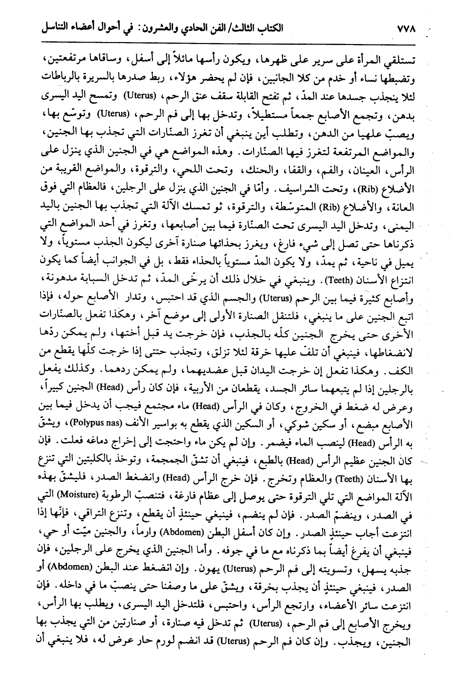 تستلقي الْمَرْأَة على سَرِير على ظهرهَا وَيكون رأسمها مائلاً إِلَى أَسْفَل وساقاها مرتفعتين وتضبطها نسَاء أَو خدم من كلا الْجَانِبَيْنِ فَإِن لم يحضر هَؤُلَاءِ ربط صدرها بالسريرة بالرباطات لِئَلَّا ينجذب جَسدهَا عِنْد الْمَدّ ثمَّ تفتح الْقَابِلَة سقف عنق الرَّحِم وتمسح الْيَد الْيُسْرَى بدهن وَتجمع الْأَصَابِع جمعا مستطيلاً وَتدْخل بهَا إِلَى فَم الرَّحِم وَتوسع بهَا وَيصب عَلَيْهَا من الدّهن وتطلب أَيْن يَنْبَغِي أَن تغرز الصنارات الَّتِي تجذب بهَا الْجَنِين والمواضع المرتفعة لتغزر فِيهَا الصنارات. وَهَذِه الْمَوَاضِع هِيَ فِي الْجَنِين الَّذِي ينزل على الرَّأْس العينان والفم والقفا والحنك وَتَحْت اللحي والترقوة والمواضع الْقَرِيبَة من الأضلاع وَتَحْت الشراسيف. وَأما فِي الْجَنِين الَّذِي ينزل على الرجلَيْن فالعظام الَّتِي فَوق الْعَانَة والأضلاع المتوسطة والترقوة ثمَّ تمسك الالة الَّتِي تبب بهَا الْجَنِين بِالْيَدِ الْيُمْنَى وَتدْخل الْيَد الْيُسْرَى تَحت الصنارة فِيمَا بَين أصابعها وتغرز فِي أحد الْمَوَاضِع الَّتِي ذَكرنَاهَا حَتَّى تصل إِلَى شَيْء فارغ ويغرز بحذائها صنارة أُخْرَى ليَكُون المجذب مستوياً وَلَا يمِيل فِي نَاحيَة ثمَّ يمد وَلَا يكون الْمَدّ مستوياً بالحذاء فَقَط بل فى الجوانب أَيْضا كَمَا يكون انتزاع الْأَسْنَان. وَيَنْبَغِي فِي خلال ذَلِك أَن يرخّي الْمَدّ ثمَّ تدخل السبابَة مدهونة وأصابع كَثِيرَة فِيمَا بَين الرَّحِم والجسم الَّذِي قد احْتبسَ وتدار الْأَصَابِع حوله فَإِذا اتبع الْجَنِين على مَا يَنْبَغِي. فلتنقل الصنارة الأولى إِلَى مَوضِع اَخر وَهَكَذَا تفعل بالصنارات الْأُخْرَى حَتَّى يخْرج الْجَنِين كُله بالجذب. فَإِن خرجت يَد قبل أُخْتهَا وَلم يُمكن ردهَا لانضغاطها. فَيَنْبَغِي أَن تلف عَلَيْهَا خرقَة لِئَلَّا تزلق وتجذْب حَتَّى إِذا خرجت كلهَا يقطع من الْكَفّ. وَهَكَذَا تفعل إِن خرجت اليدان قبل عضديهما وَلم يُمكن ردهما. وَكَذَلِكَ يفعل بِالرجلَيْنِ إِذا لم يتبعهما سَائِر الْجَسَد يقْطَعَانِ من الأربية فَإِن كَانَ رَأس الْجَنِين كَبِيرا وَعرض لَهُ ضغط فِي الْخُرُوج وَكَانَ فِي الرَّأْس مَاء مُجْتَمع فَيجب أَن يدْخل فِيمَا بَين الْأَصَابِع مبضع أَو سكين شوكي أَو السكين الَّذِي يقطع بِهِ بواسير الْأنف ويشقّ بِهِ الرَّأْس لينصب المَاء فيضمر. وَإِن لم يكن مَاء واحتجت إِلَى إِخْرَاج دماغه فعلت. فَإِن كَانَ الْجَنِين عَظِيم الرَّأْس بالطبع فَيَنْبَغِي أَن تشق الجمجمة وَتُؤْخَذ بالكلبتين الَّتِي تنْزع بهَا الْأَسْنَان وَالْعِظَام وَتخرج. فَإِن خرج الرَّأْس وانضغط الصَّدْر فليشق بِهَذِهِ الالة الْمَوَاضِع الَّتِي تلِي الترقوة حَتَّى يُوصل إِلَى عِظَام فارغة فتنصب الرُّطُوبَة الَّتِي فِي الصَّدْر وينضم الصَّدْر. فَإِن لم يَنْضَم فَيَنْبَغِي حِينَئِذٍ أَن يقطع وتنزع التراقي فَإِنَّهَا إِذا انتزعت أجَاب حِينَئِذٍ الصَّدْر. لَان كَانَ أَسْفَل الْبَطن وارماً والجنين ميت أَو حَيّ فَيَنْبَغِي أَن يفرغ أَيْضا بِمَا ذَكرْنَاهُ مَعَ مَا فِي جَوْفه. وَأما الْجَنِين الَّذِي يخرج على الرجلَيْن فَإِن جذبه يسهل وتسويته إِلَى فَم الرَّحِم يهون. وَإِن انضغط عِنْد الْبَطن أَو الصَّدْر فَيَنْبَغِي حِينَئِذٍ أَن يجذب بِخرقَة ويشق على مَا وَصفنَا حَتَّى ينصب مَا فِي دَاخله. فَإِن انتزعت سَائِر الْأَعْضَاء وارتجع الرَّأْس وَاحْتبسَ فلتدخل الْيَد الْيُسْرَى وَيطْلب بهَا الرَّأْس وَيخرج الْأَصَابِع إِلَى فَم الرَّحِم ثمَّ تدخل فِيهِ صنارة أَو صنارتين من الَّتِي يجذب بهَا الْجَنِين ويجذب وَإِن كَانَ فَم الرَّحِم قد انْضَمَّ لورم حَار عرض لَهُ فَلَا يَنْبَغِي أَن